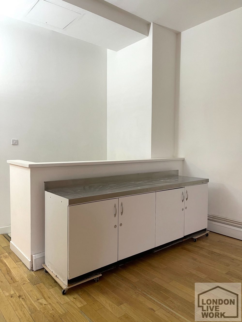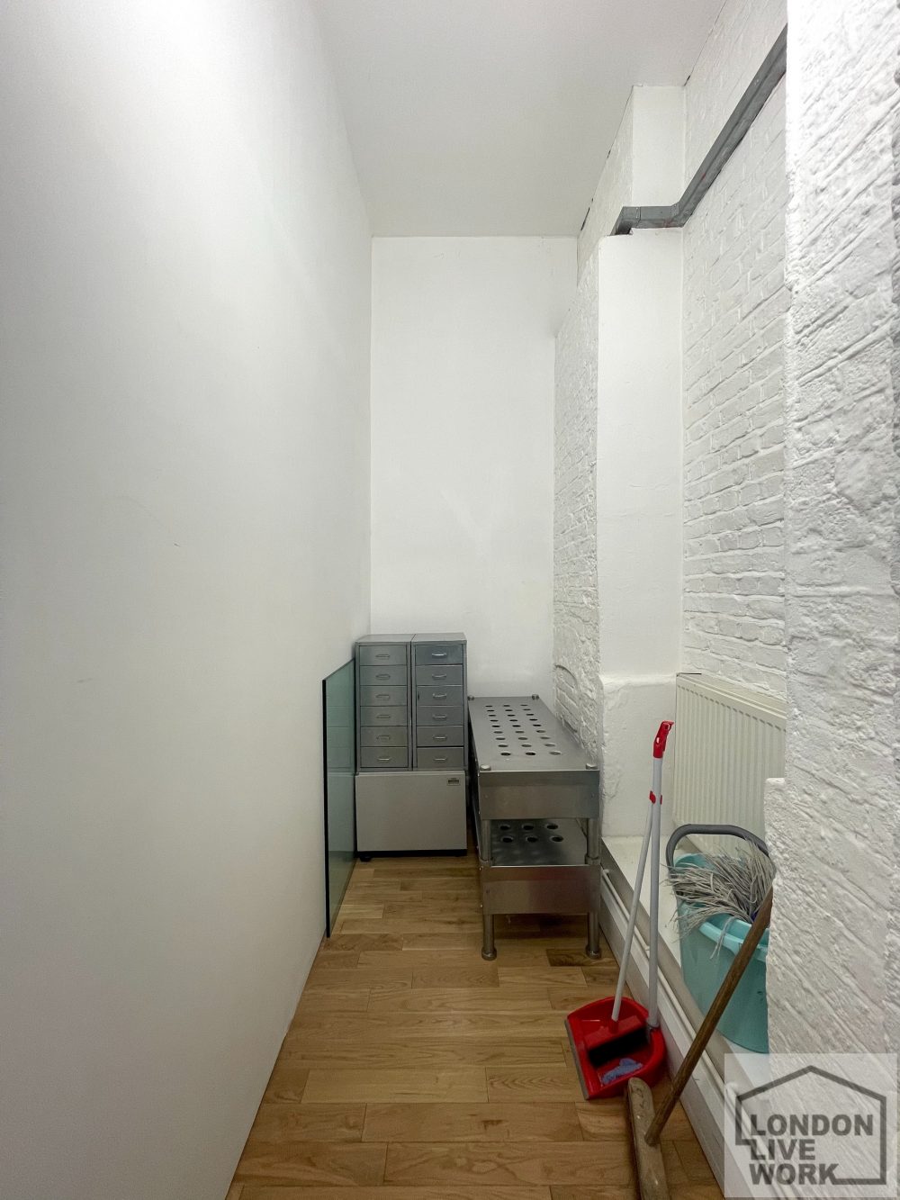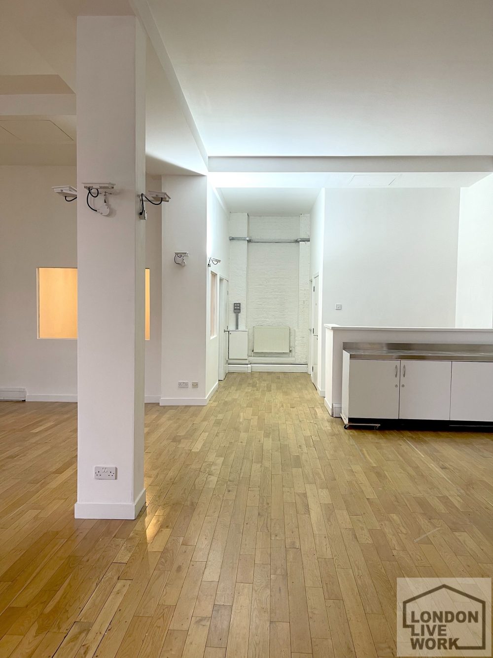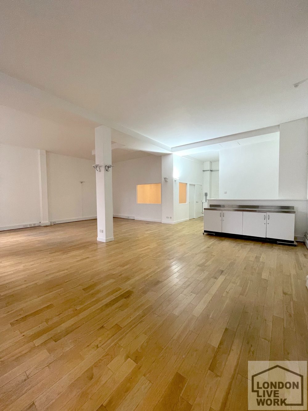The studio has a solid timber floor, crital windows, a high ceiling (11’06), electricity points, phone points and is gas centrally heated. There is a private office area at the rear of the studio, and a separate storage room.