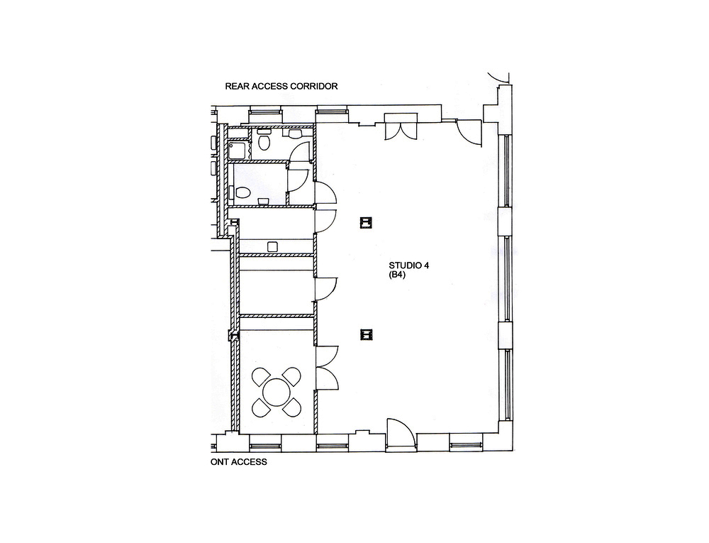 The studio has a lino floor, huge multi paned north facing crital windows, white walls, a high ceiling (11’06), electricity points, phone points and is gas centrally heated.