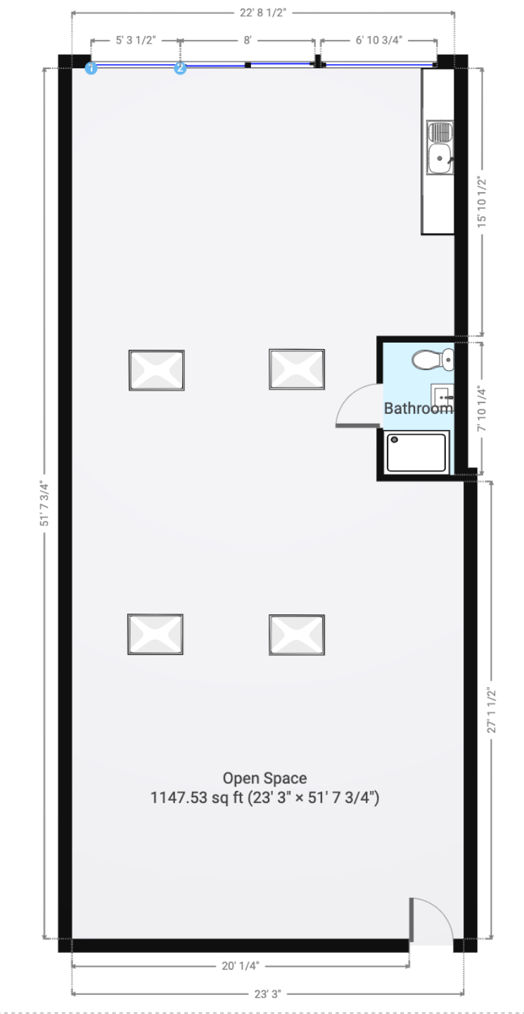 The 1st floor studio consists of 1200 sq ft open space, with skylights and windows to let in natural light, and comes unfurnished.