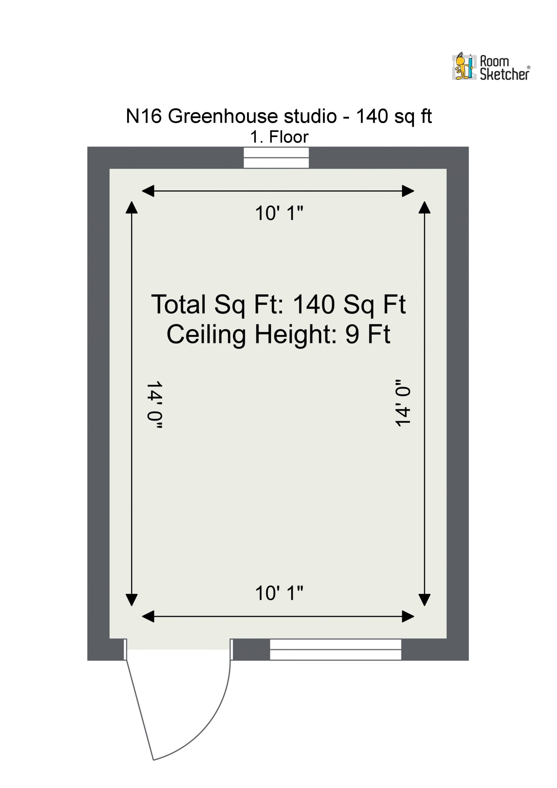 The studio has bright white painted walls, shelfs for added space, vinyl flooring, and a window for natural light.