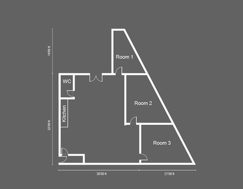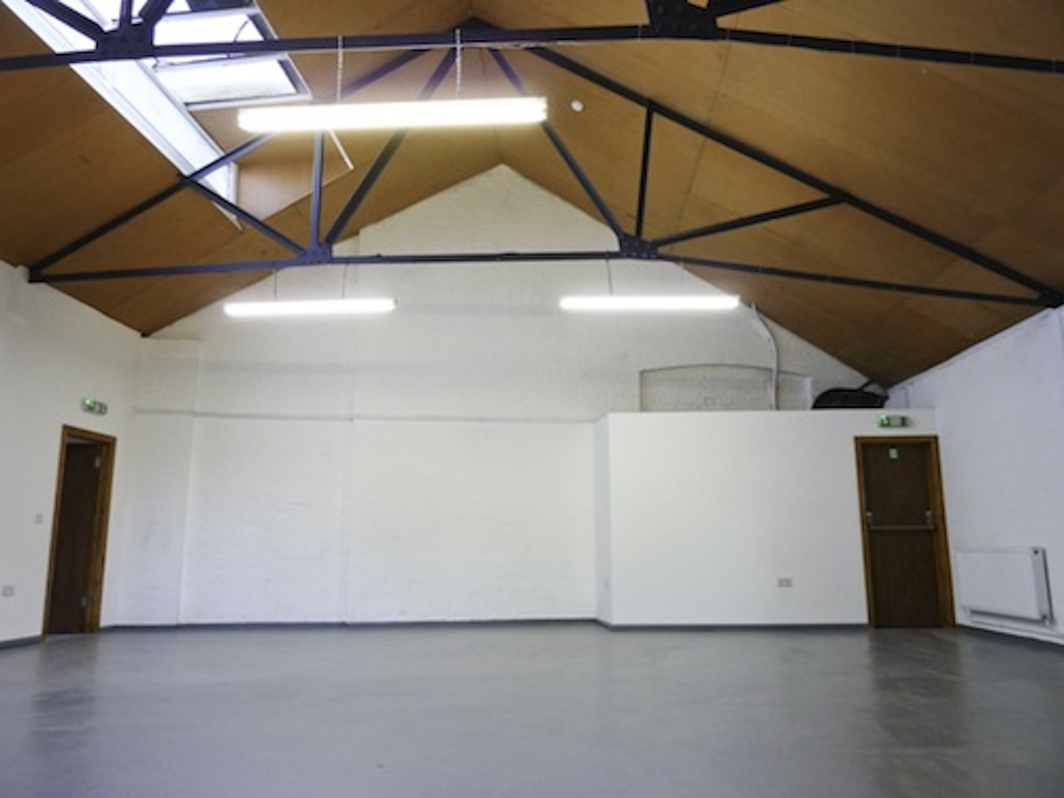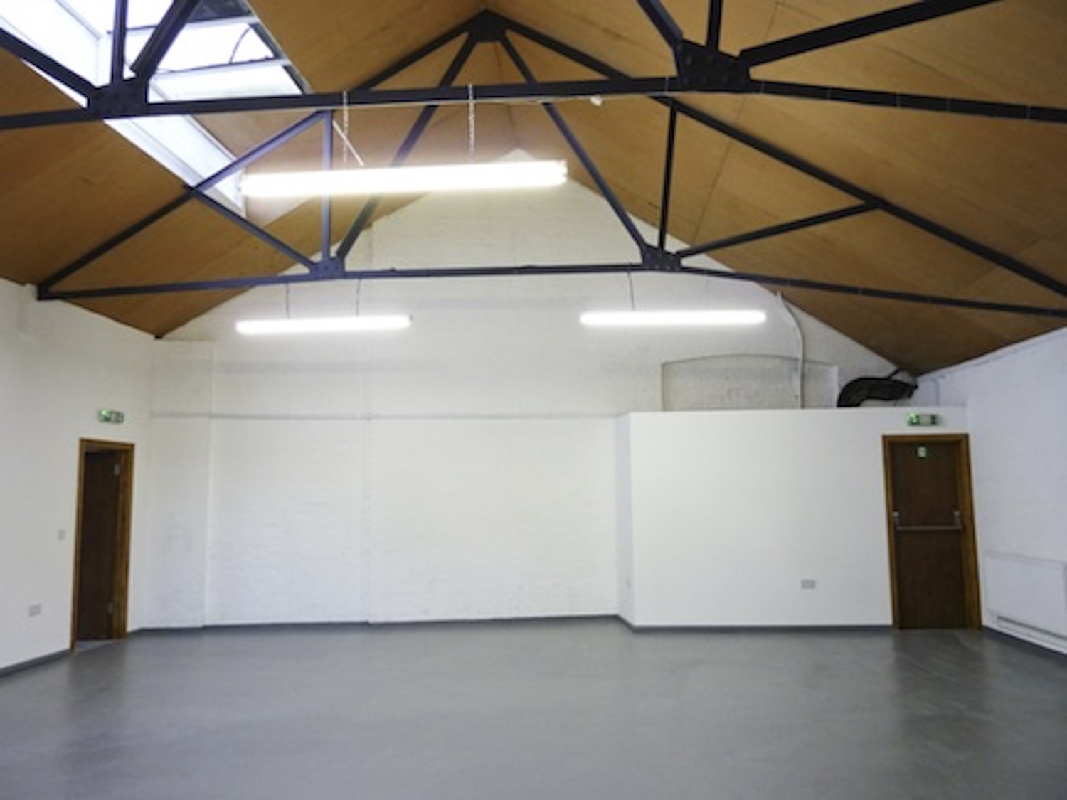 Warehouse has a concrete floor (painted flint grey), white walls, pitched roof with panels to let in lots of natural light.
