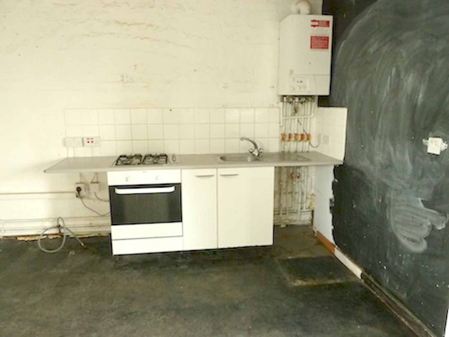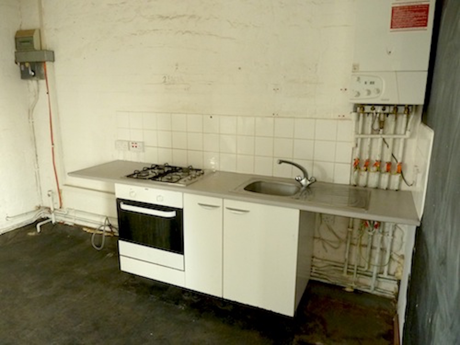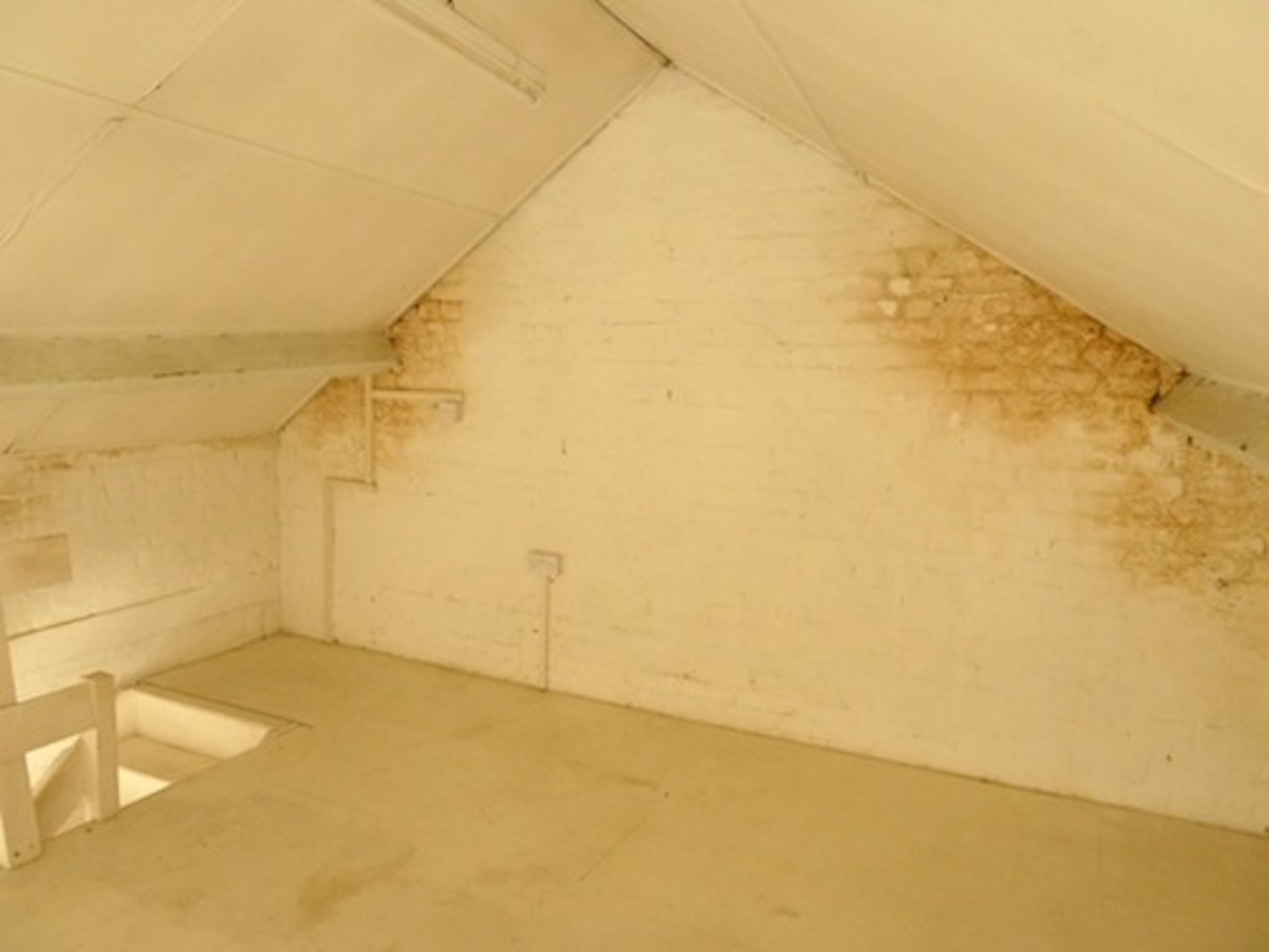 Space has a large open area, pitched roof, lots of windows, kitchen and a bath / toilet
