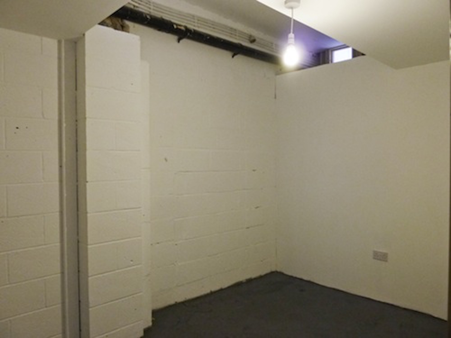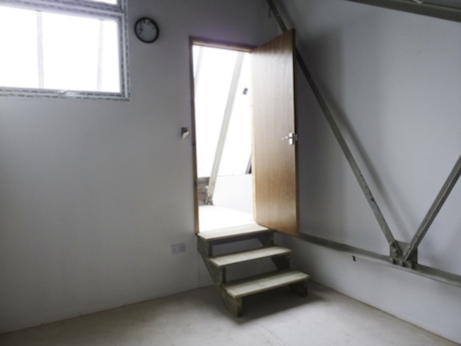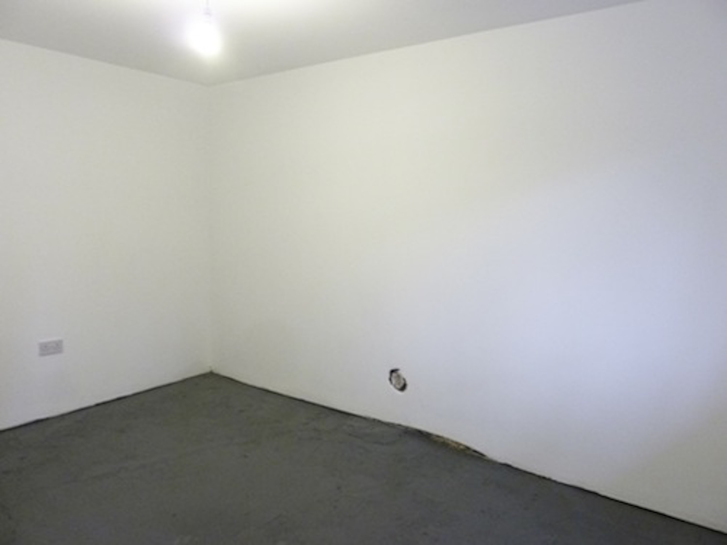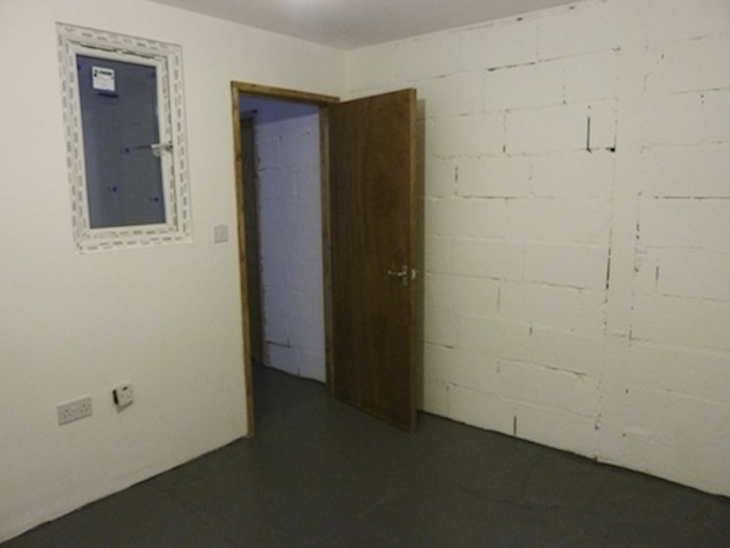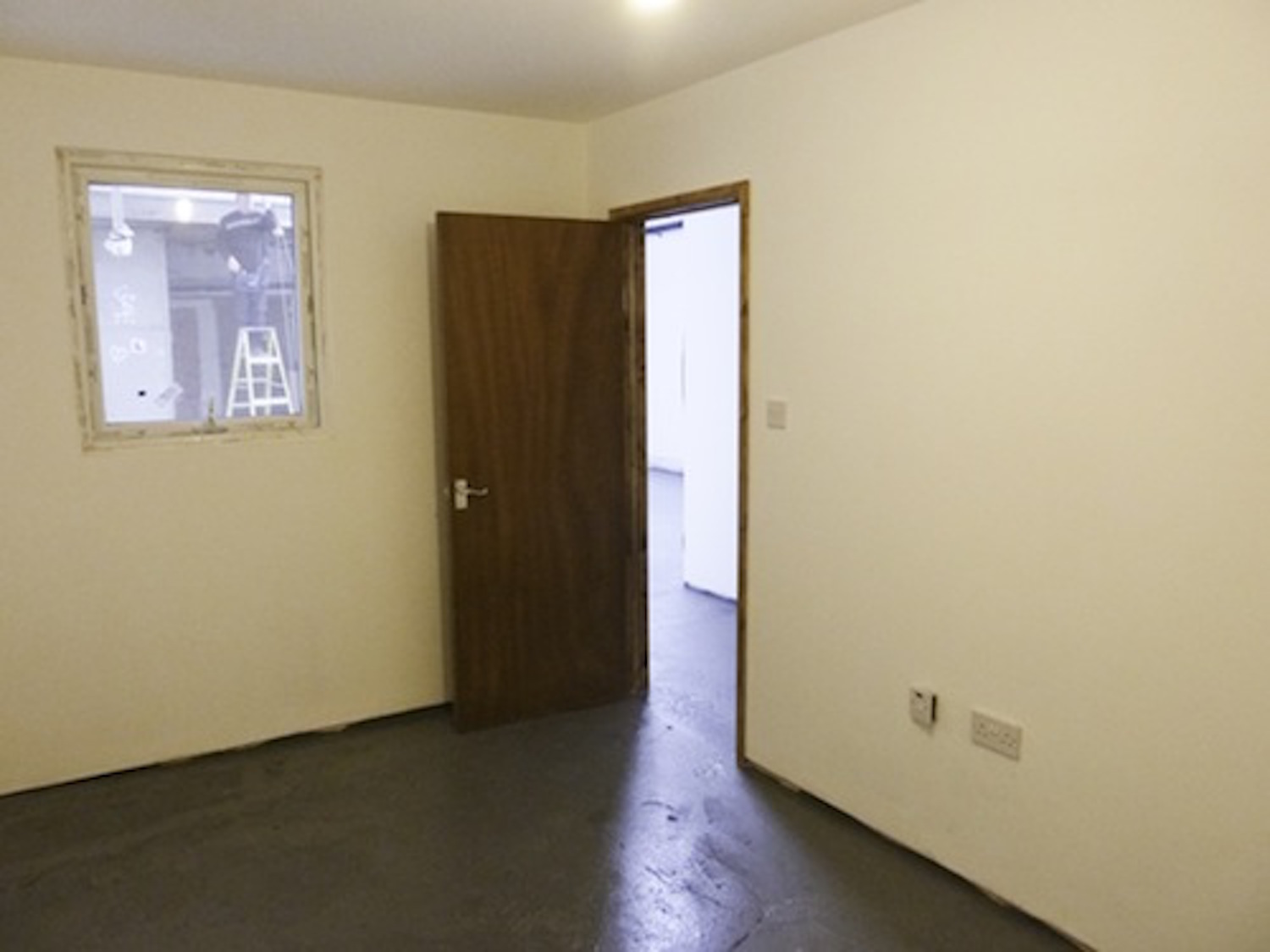 The unit has flint grey concrete flooring, bright white walls and huge window panels.