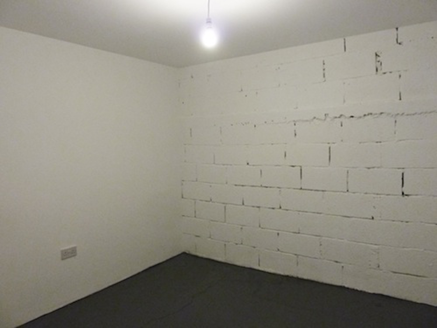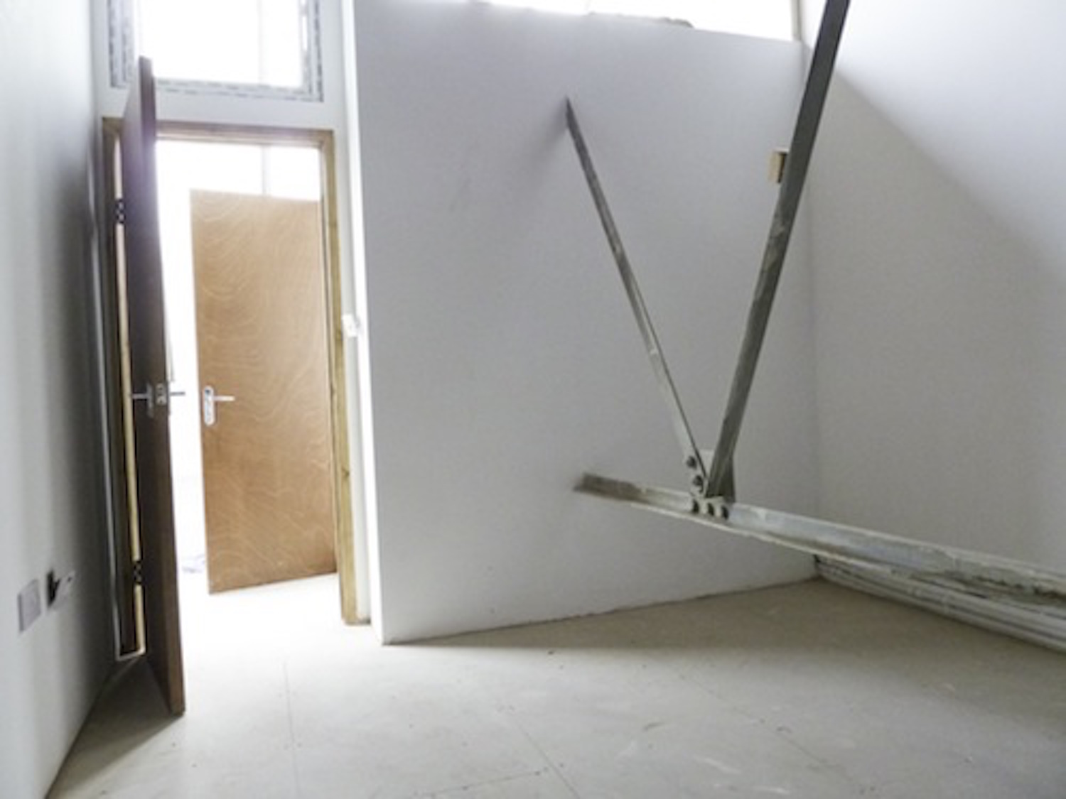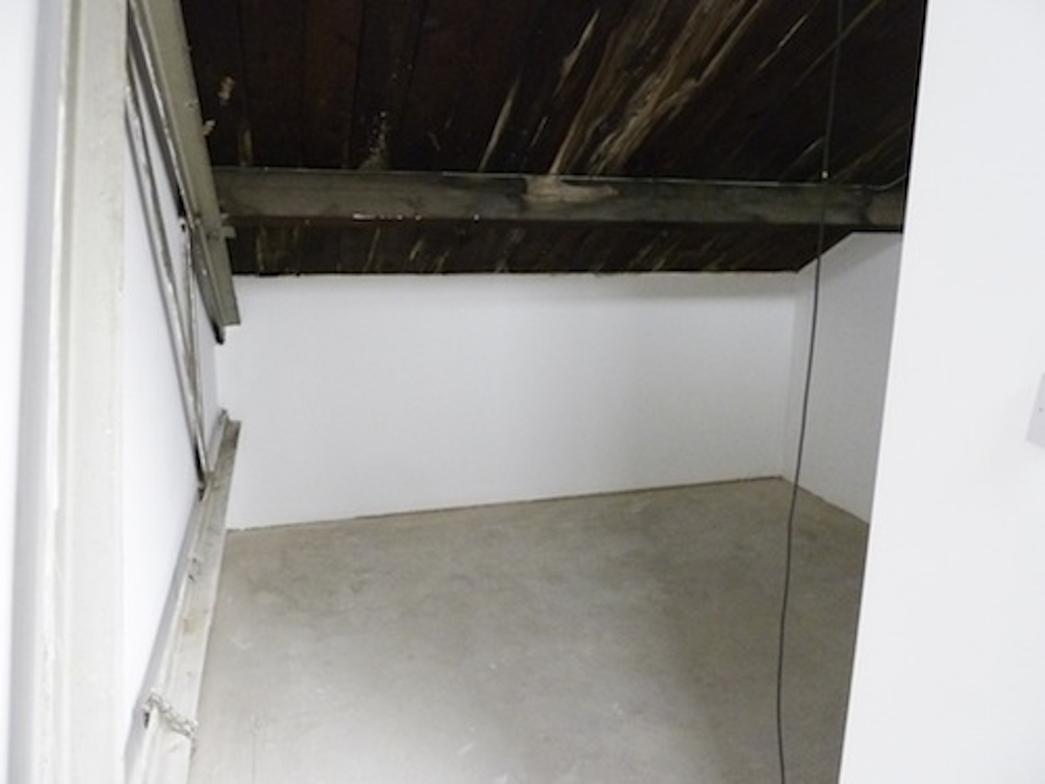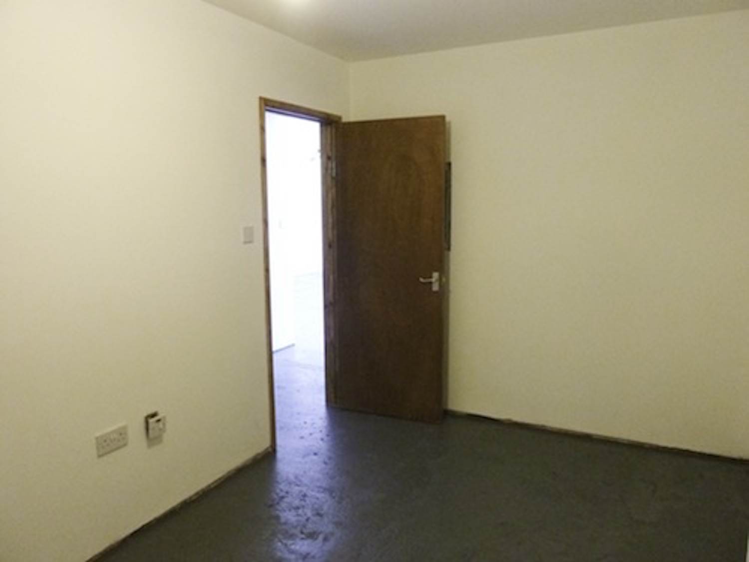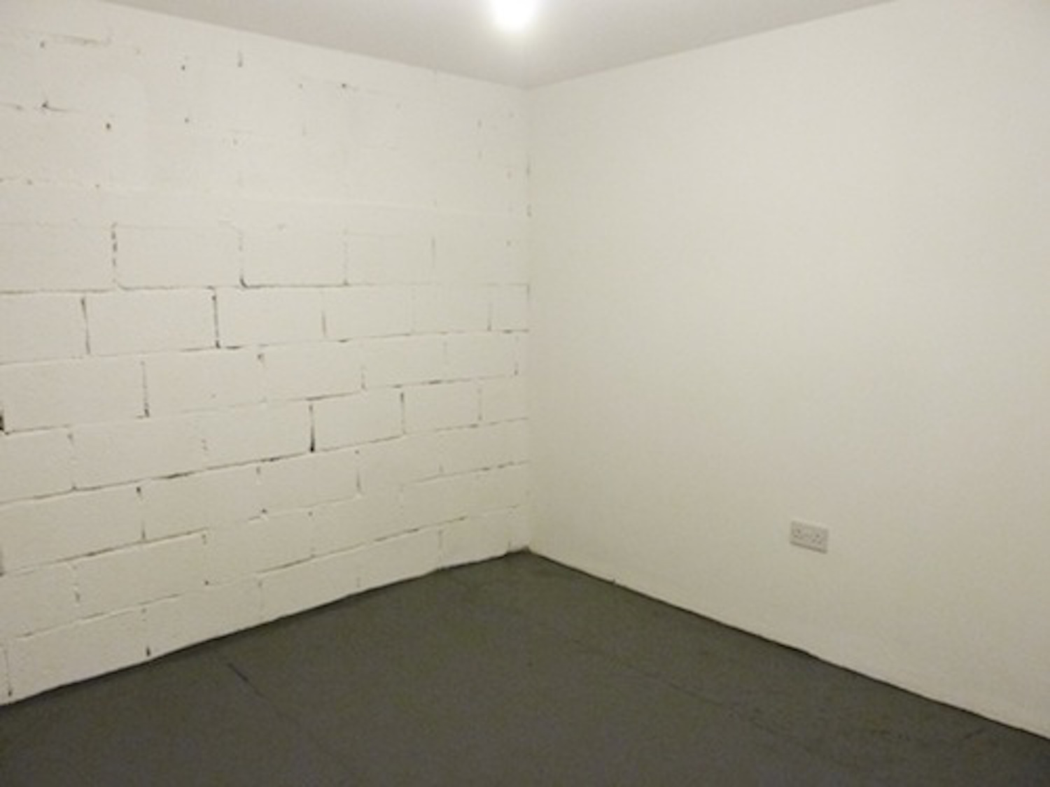 The unit has flint grey concrete flooring, bright white walls and huge window panels.