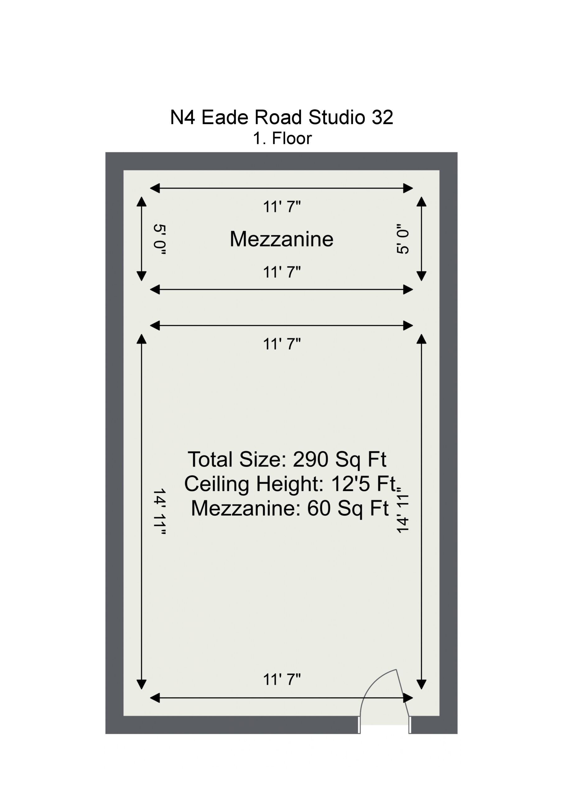 The studio is 230 sq ft with a 60 sq ft mezzanine and 12.5 ft high ceiling.