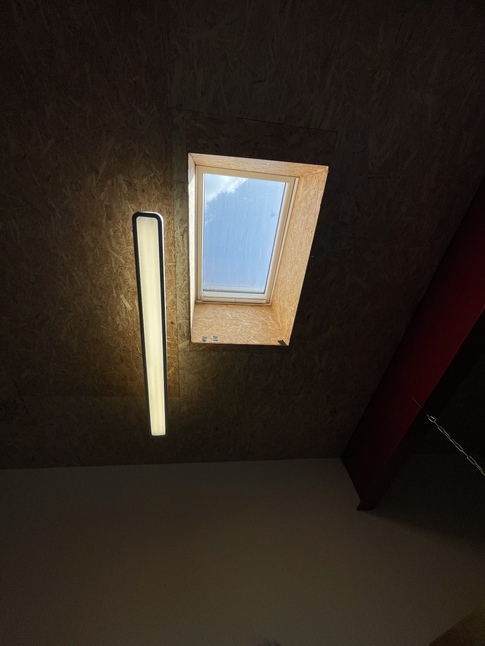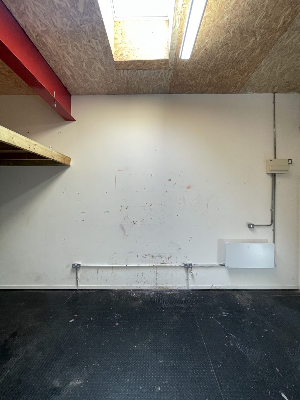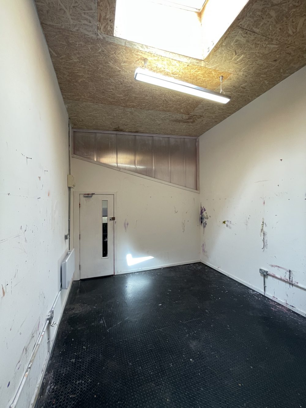 The studio is open plan, has bright white walls, a lino floor, skylight window, electricity and lighting. Heating?
