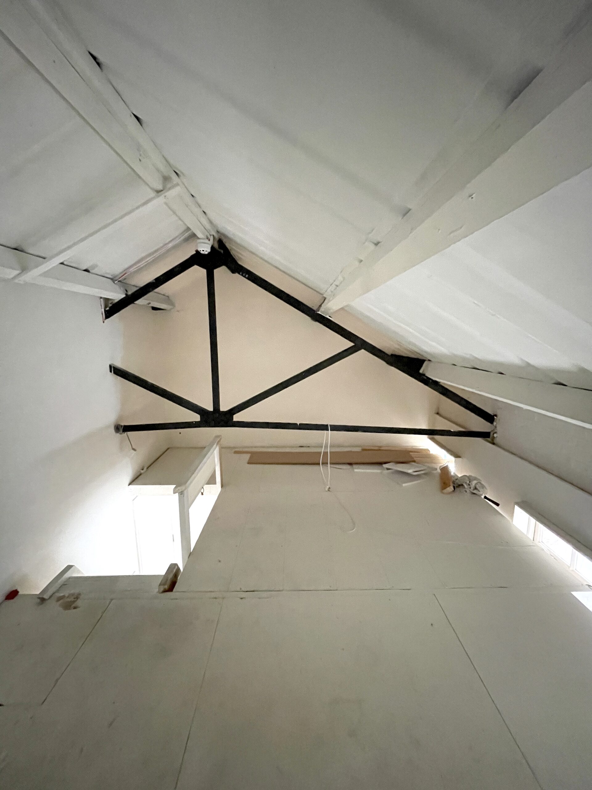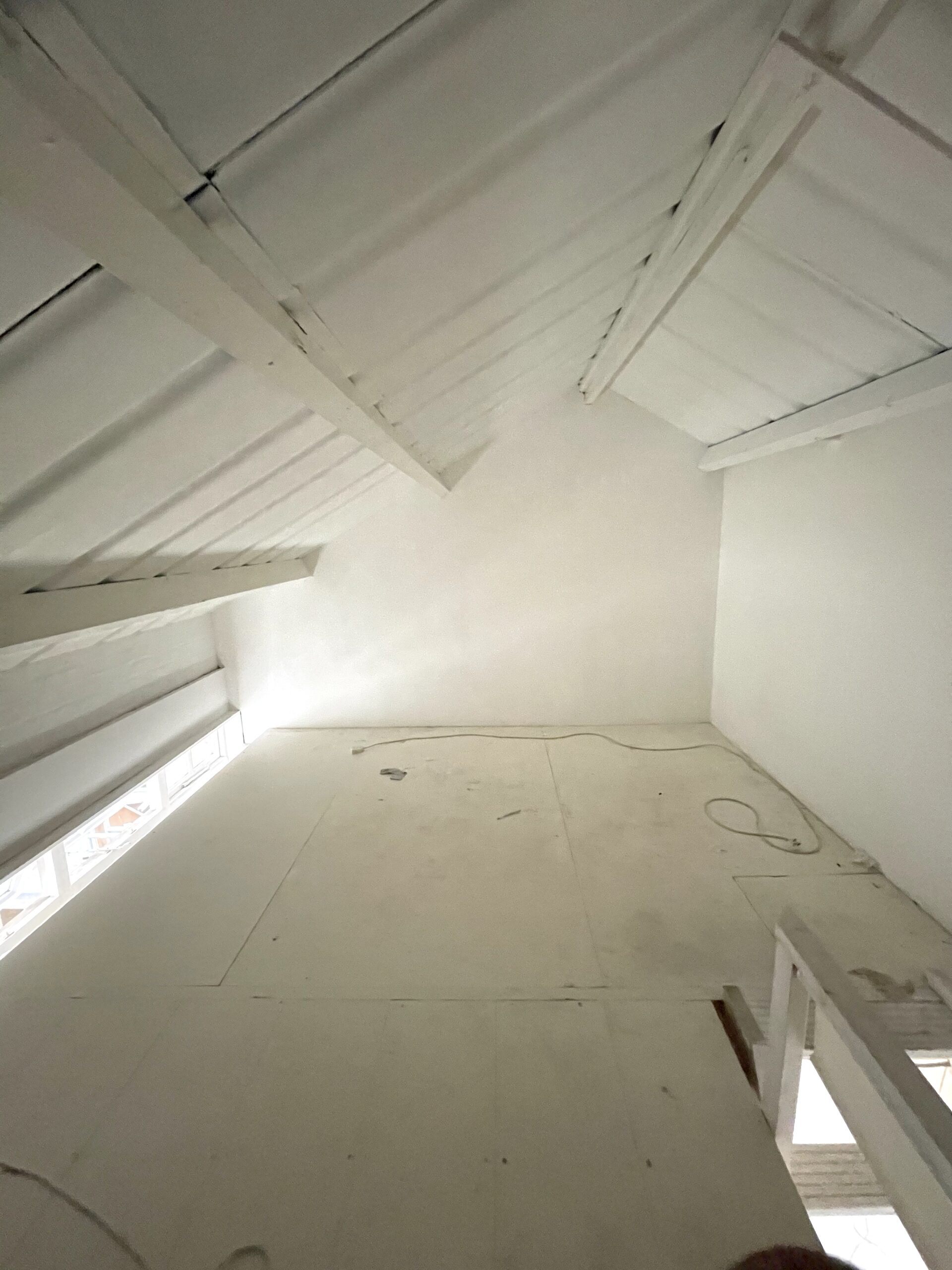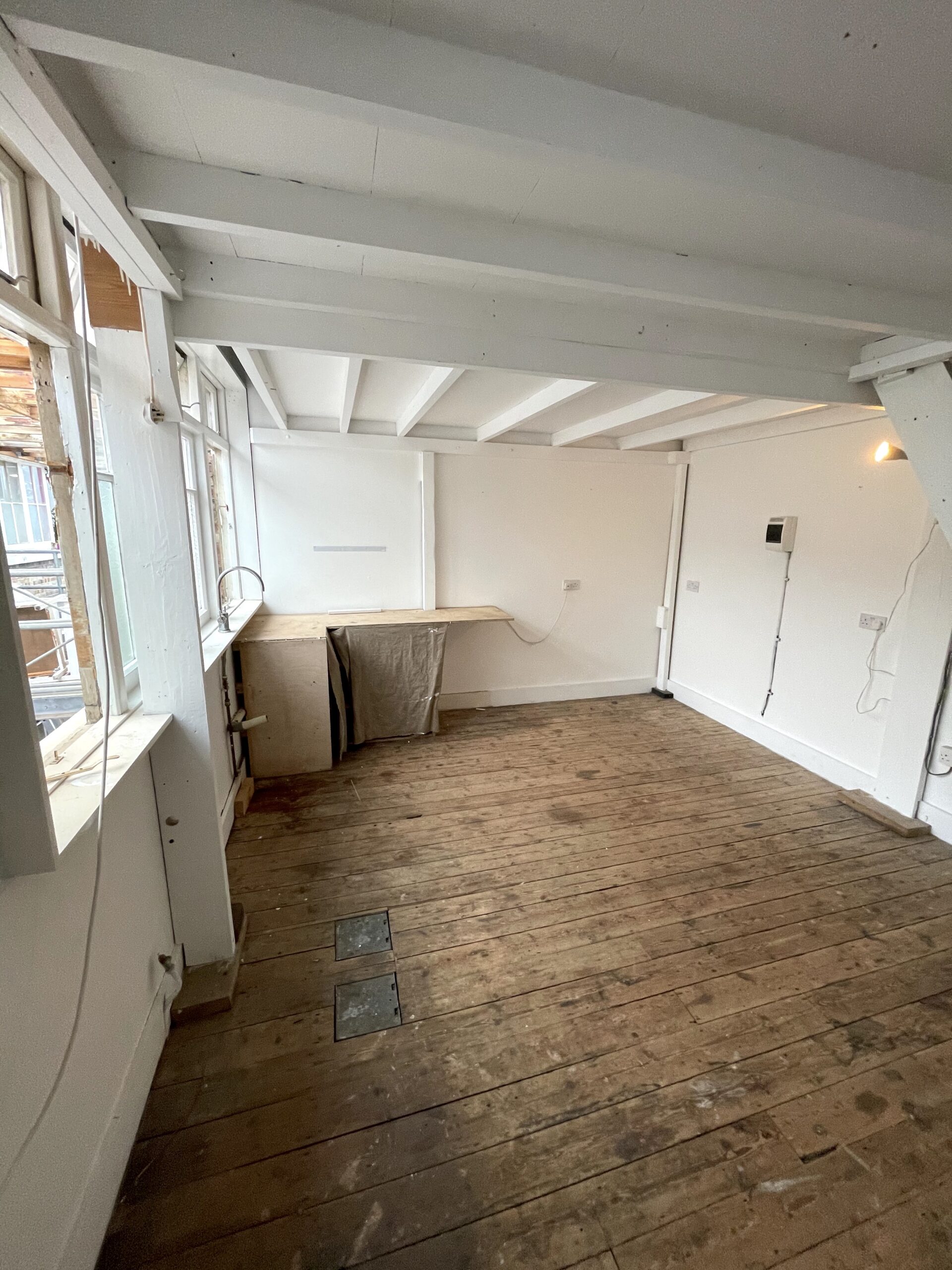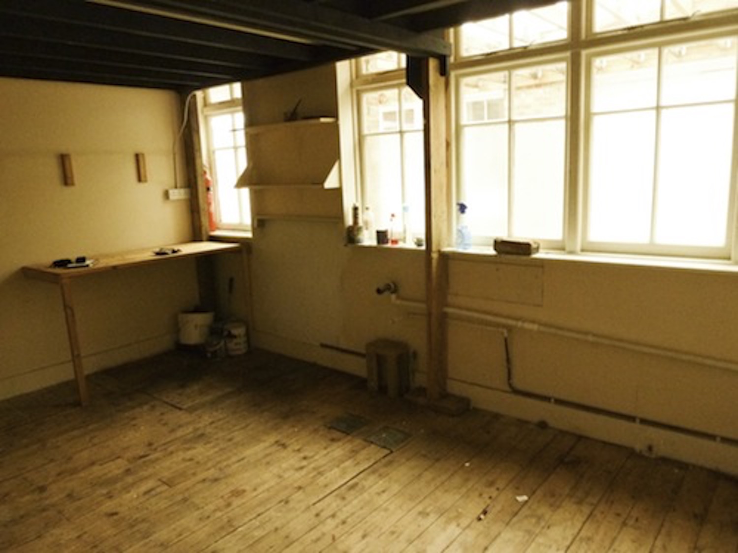 Studio has a pitched roof, 14’07 ceiling high, wooden floor, large windows, natural light, electricity, lighting and heating.