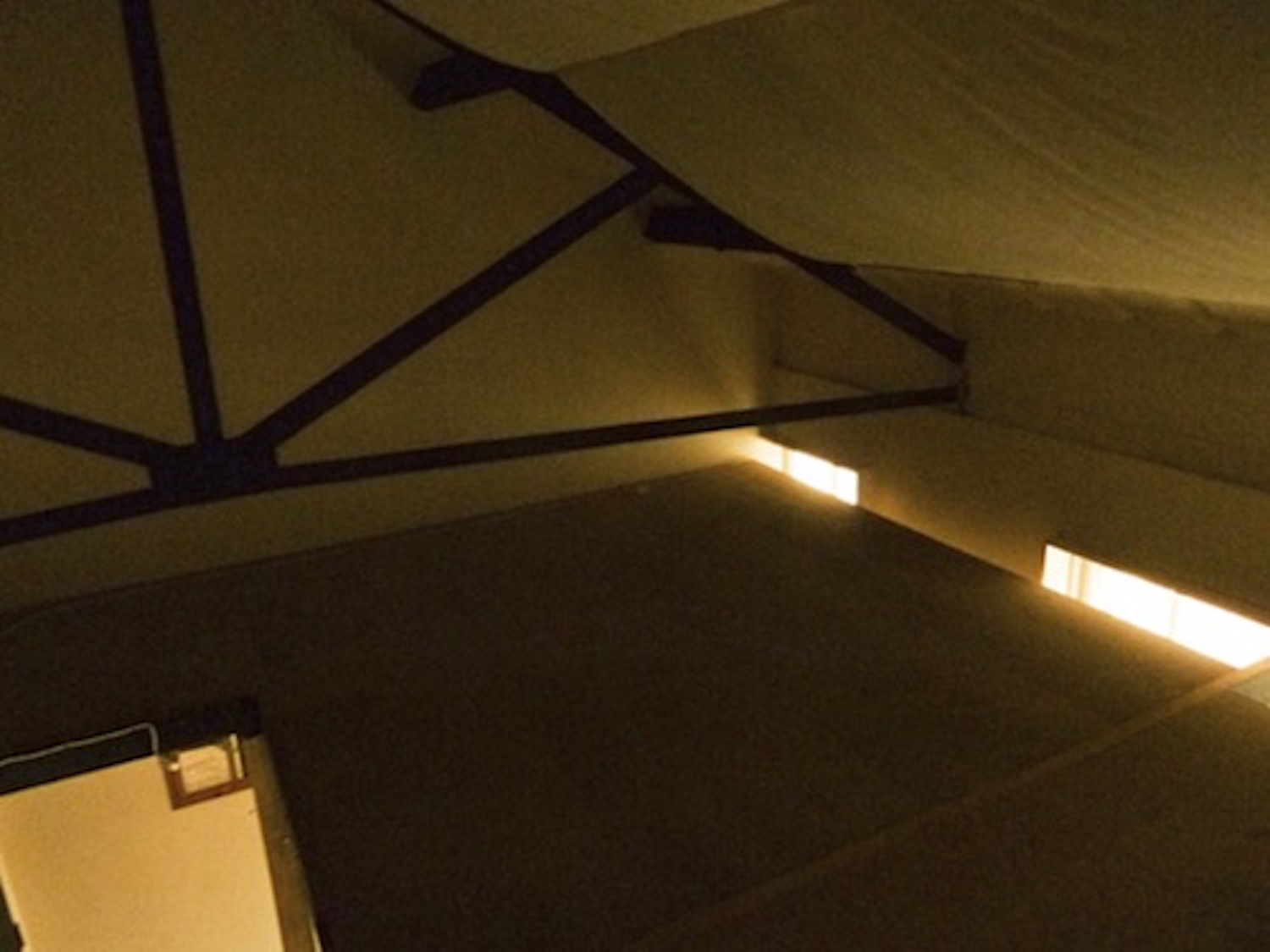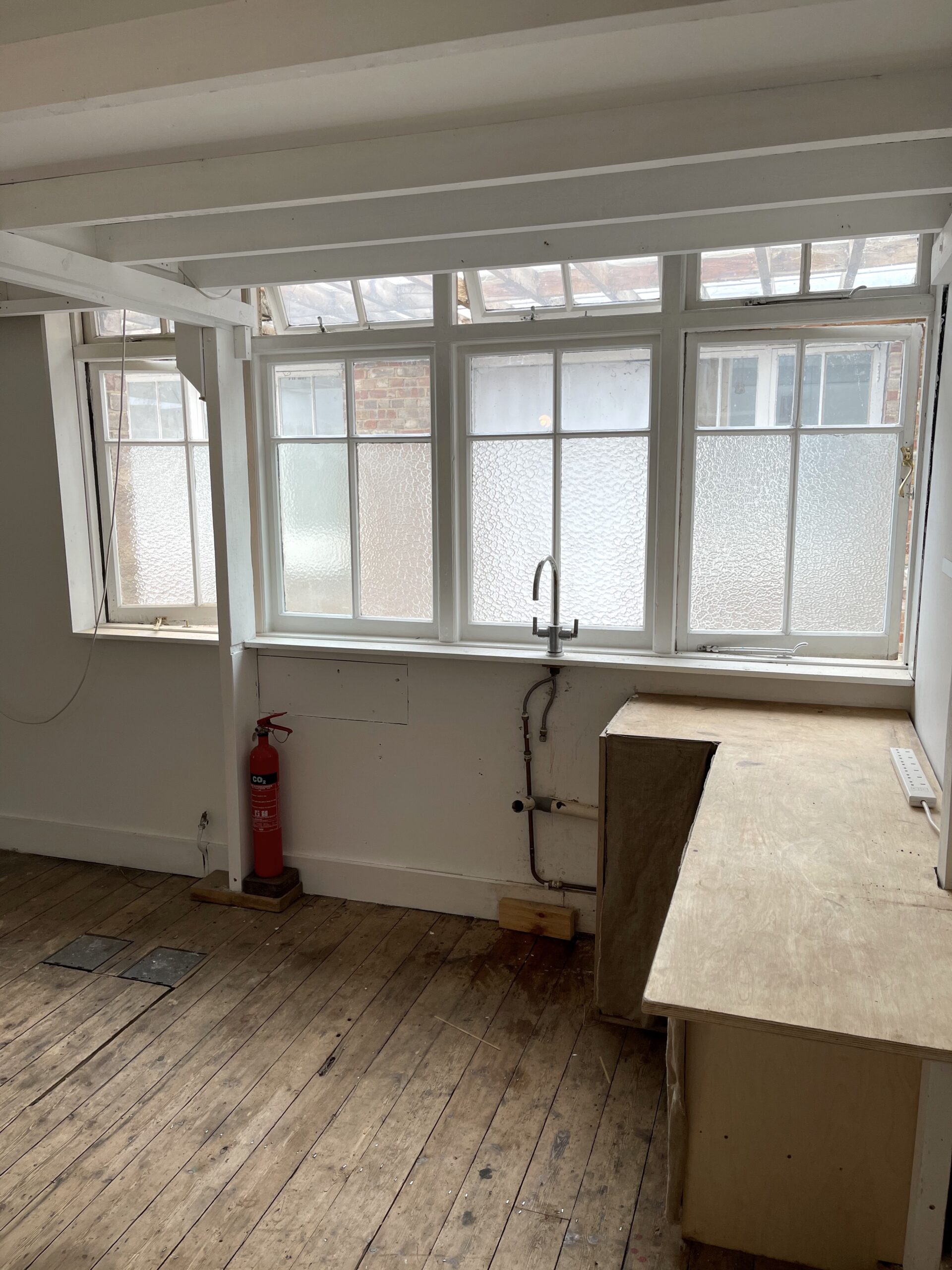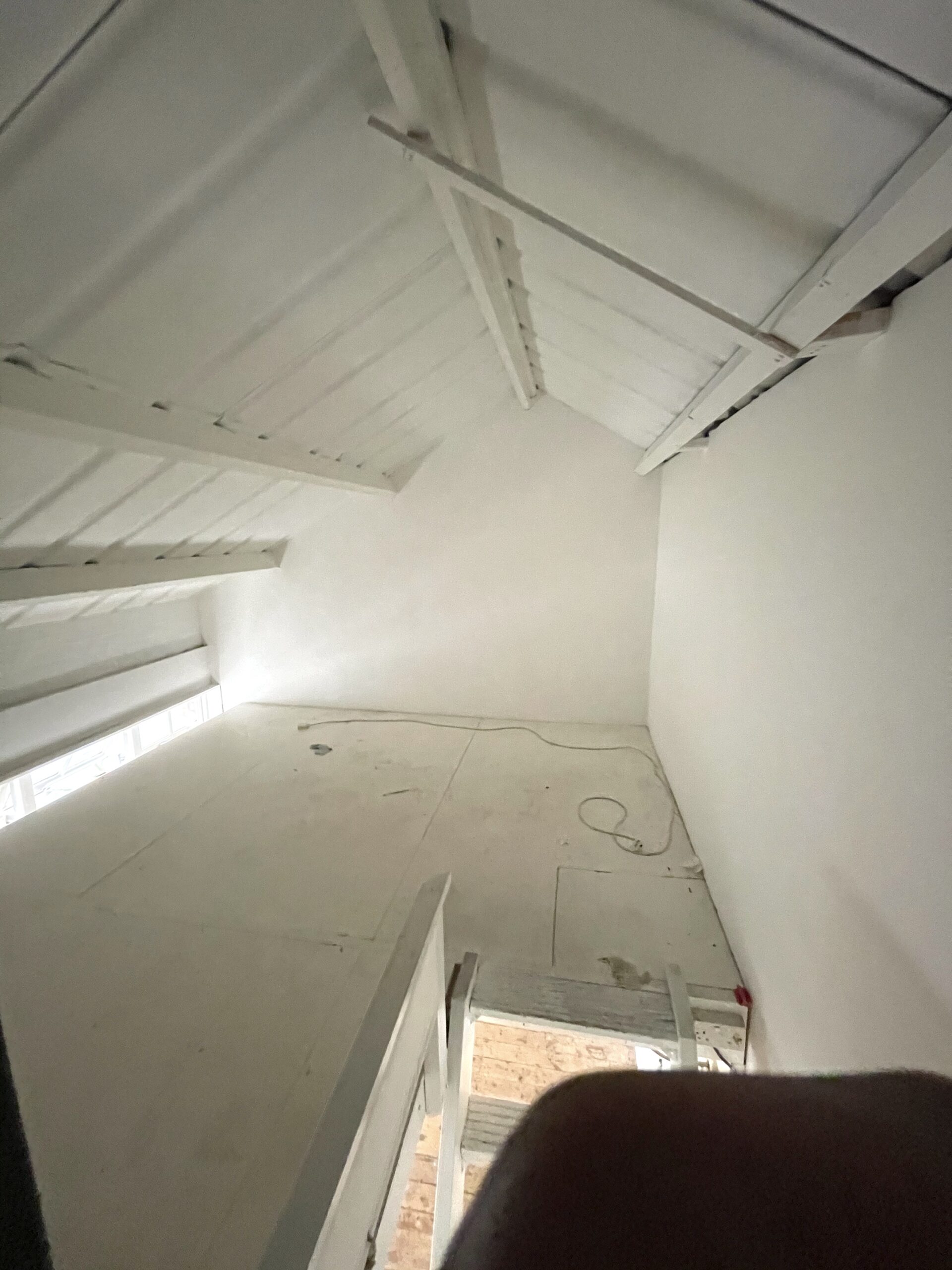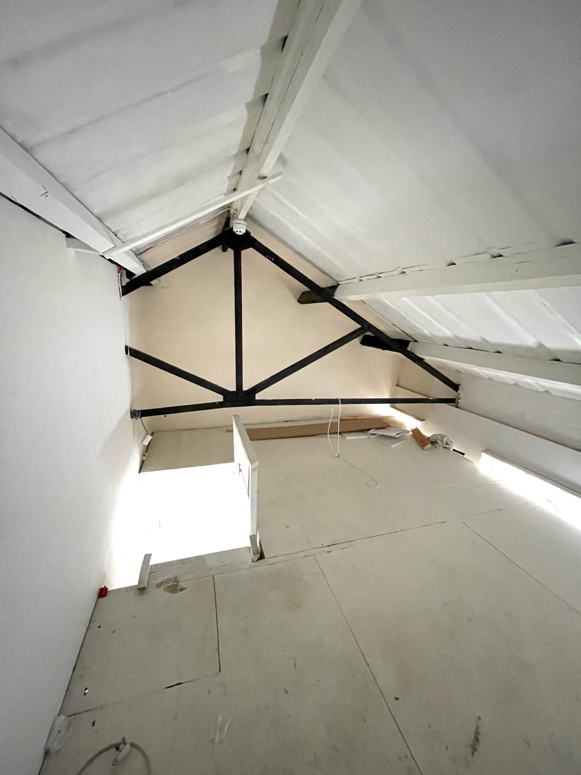 Studio has a pitched roof, 14’07 ceiling high, wooden floor, large windows, natural light, electricity, lighting and heating.