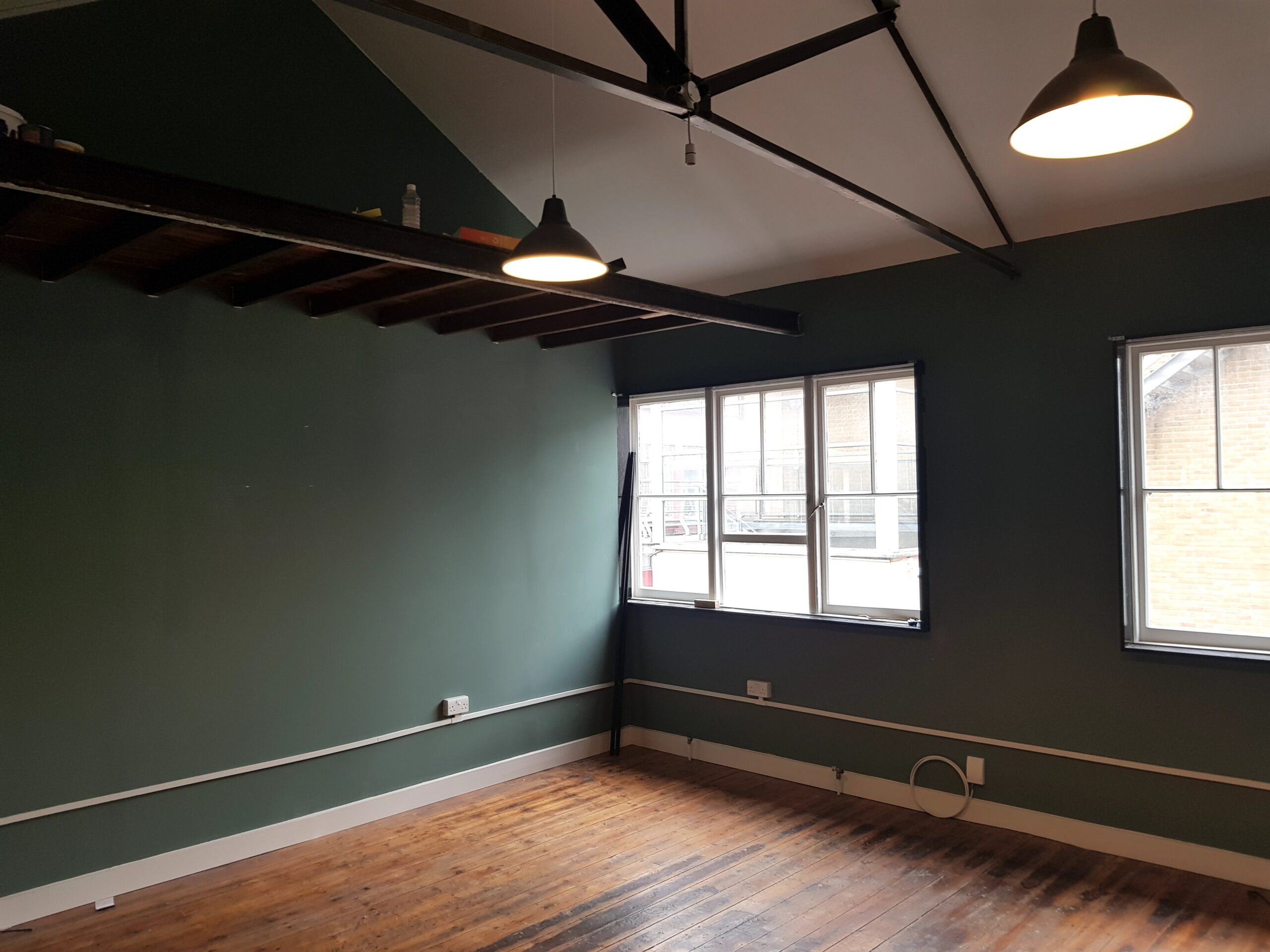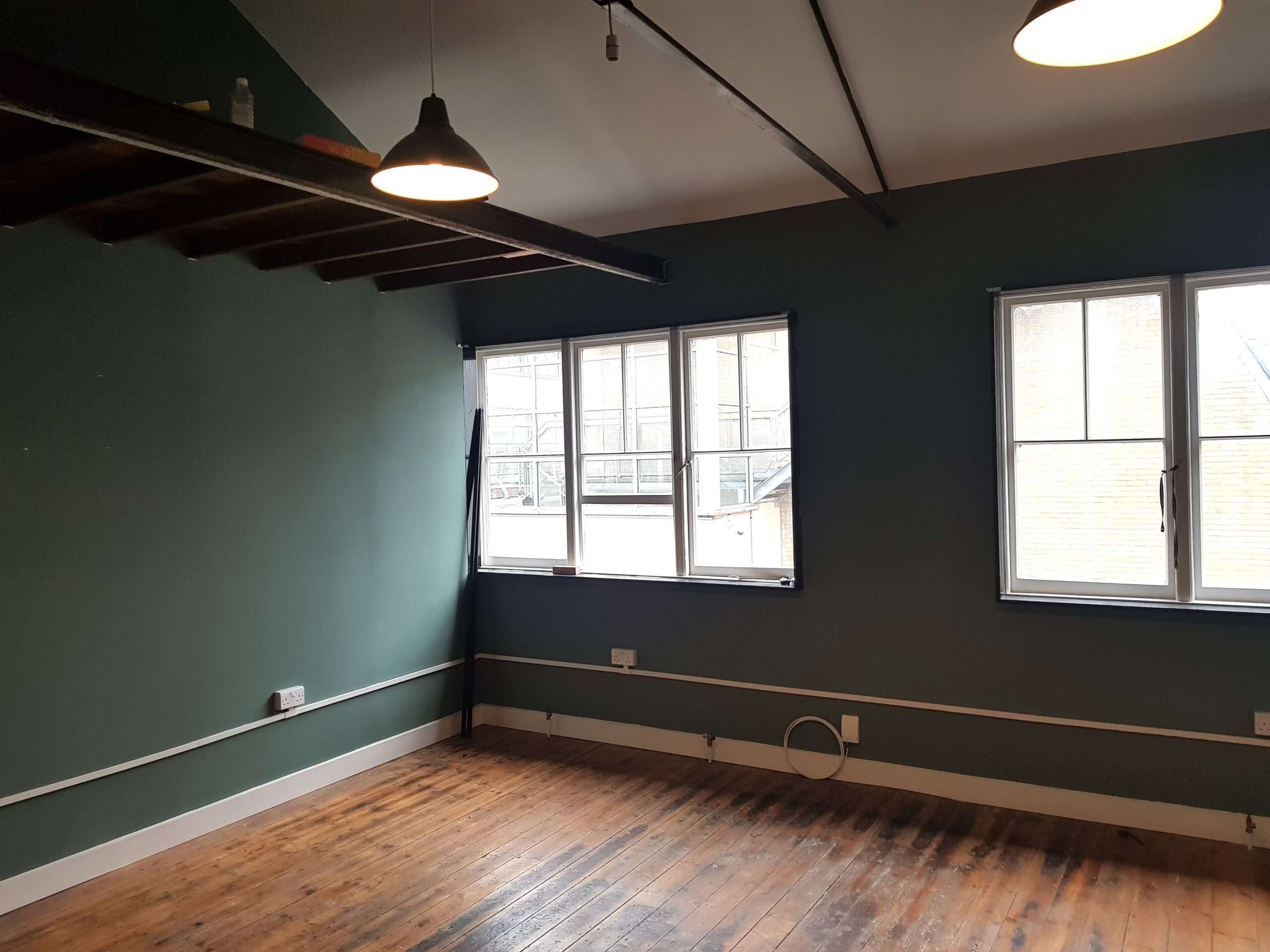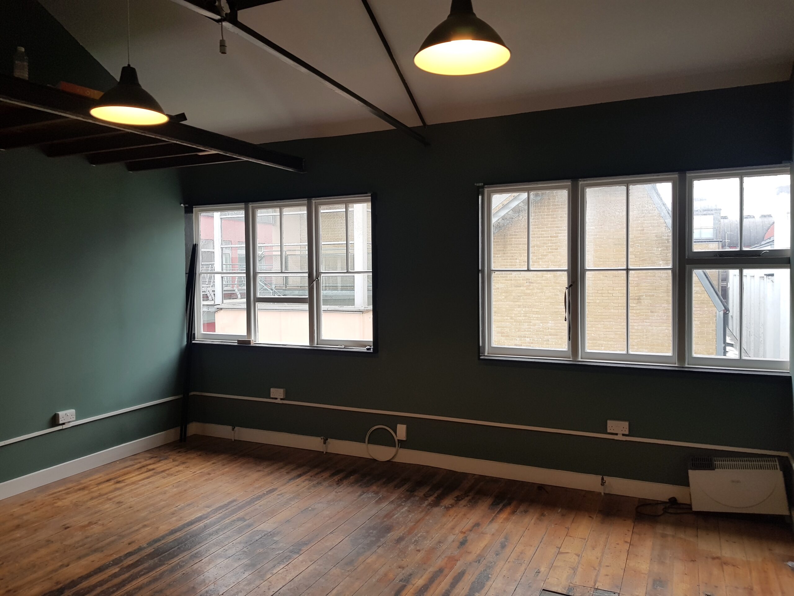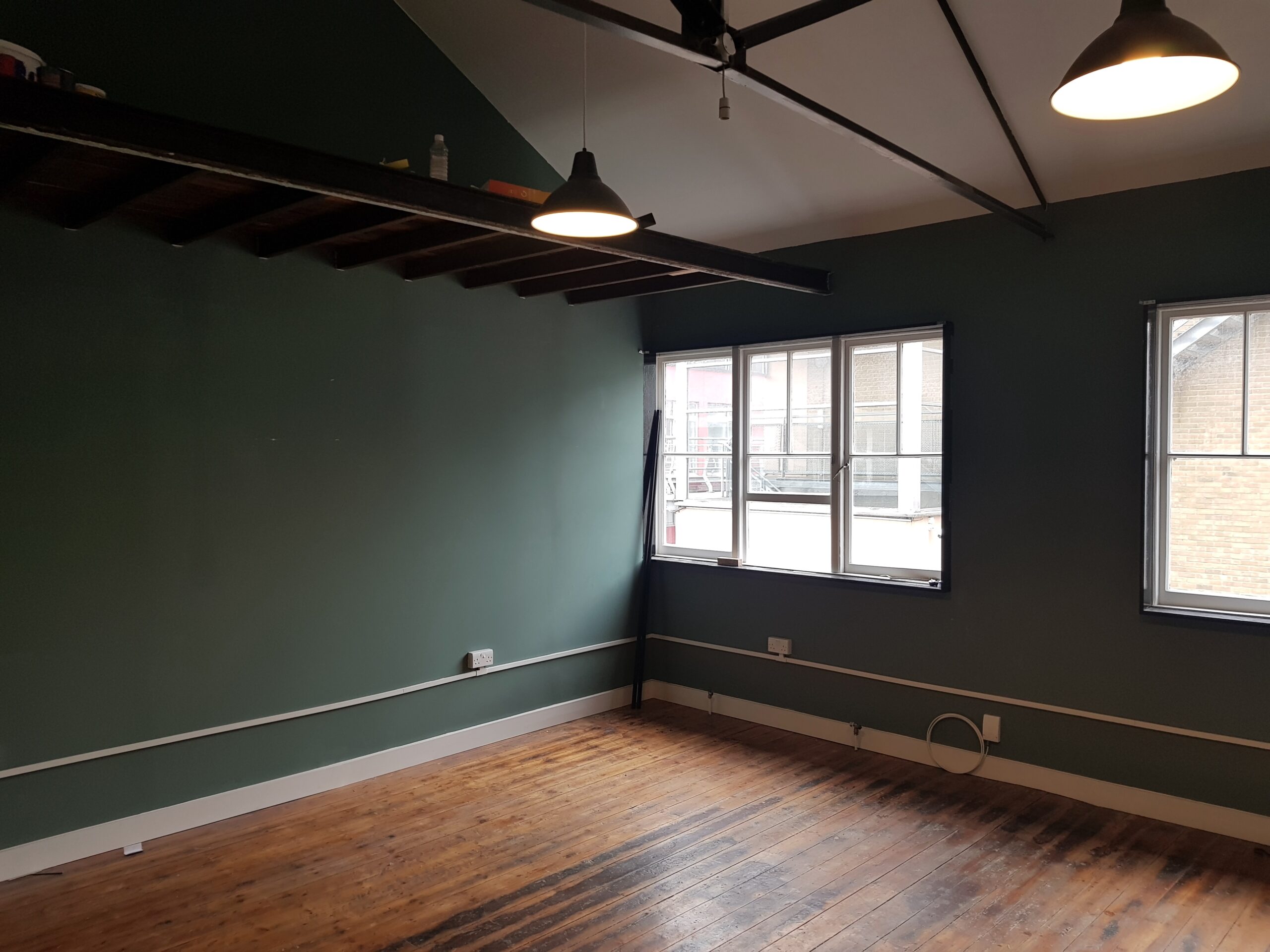 Studio has wooden flooring, dark green painted walls and huge windows for natural light and ventilation.