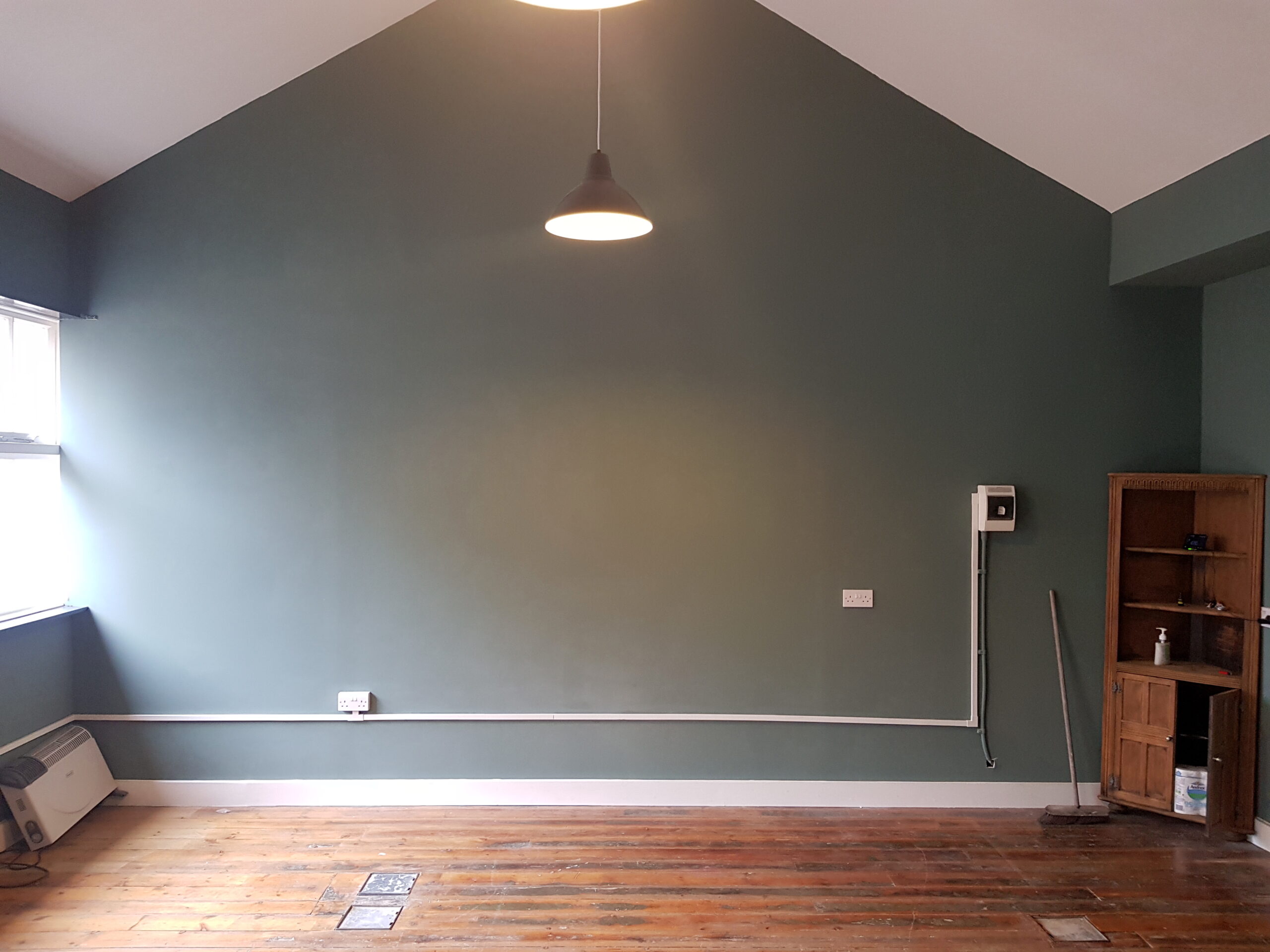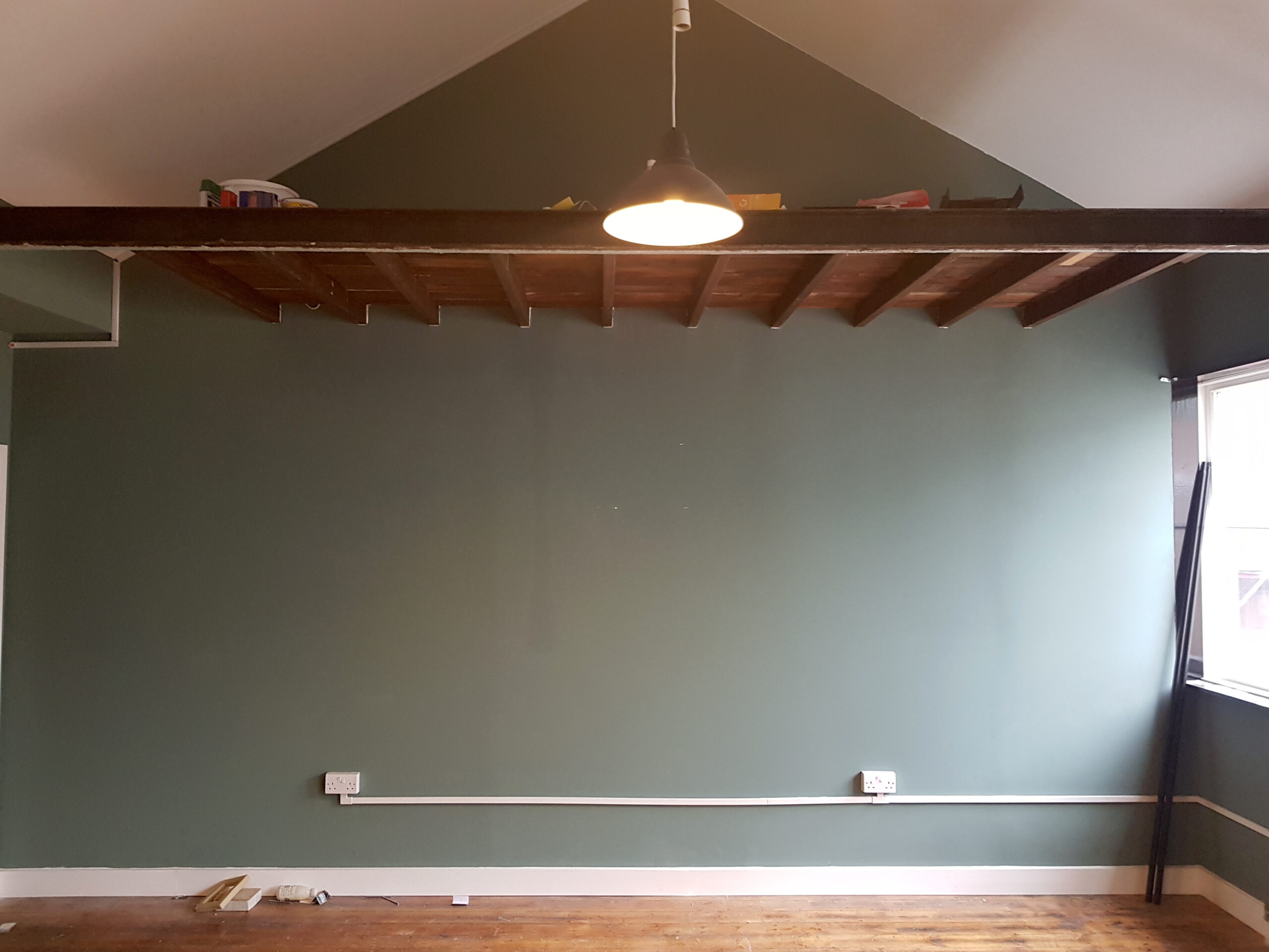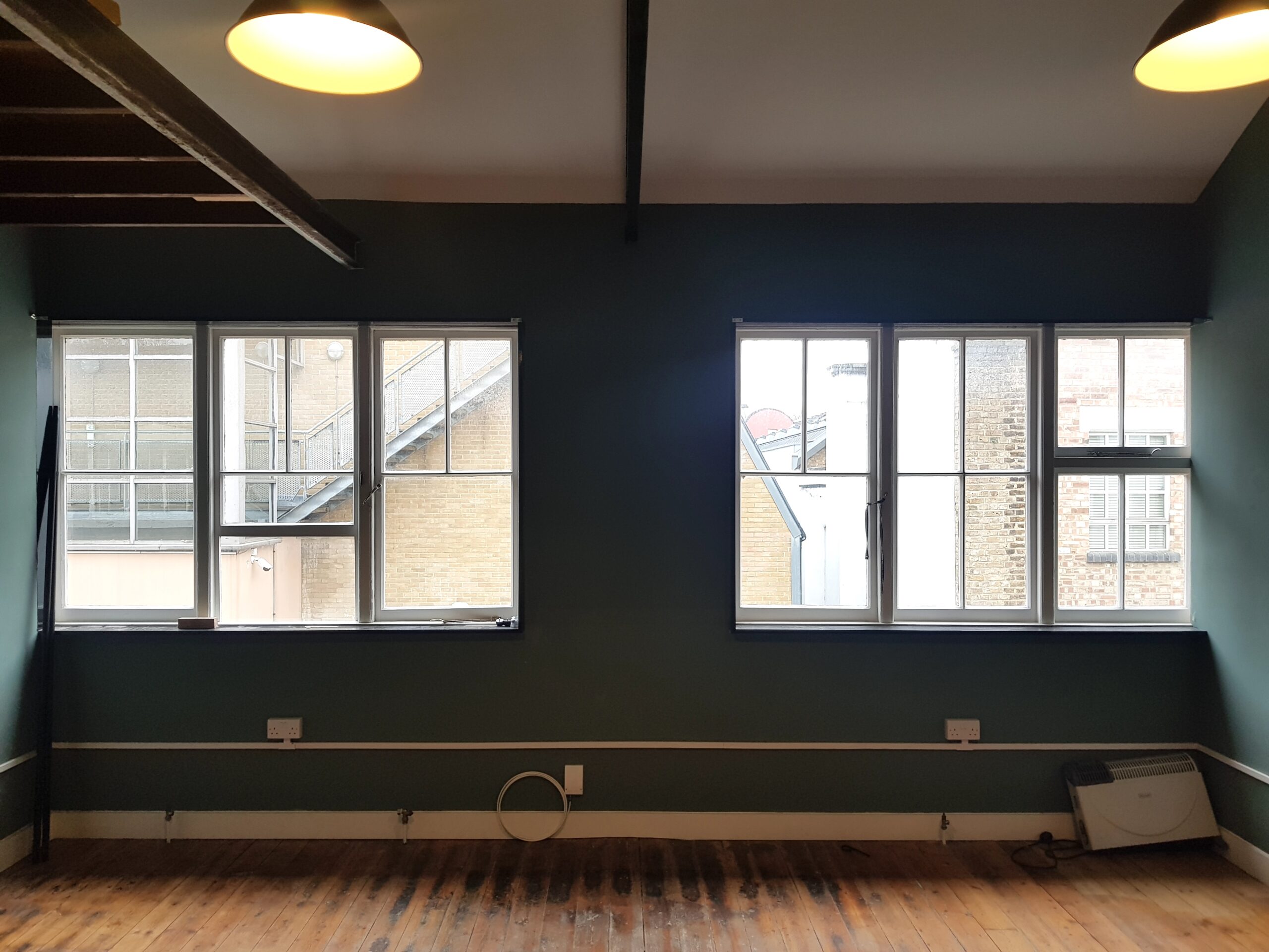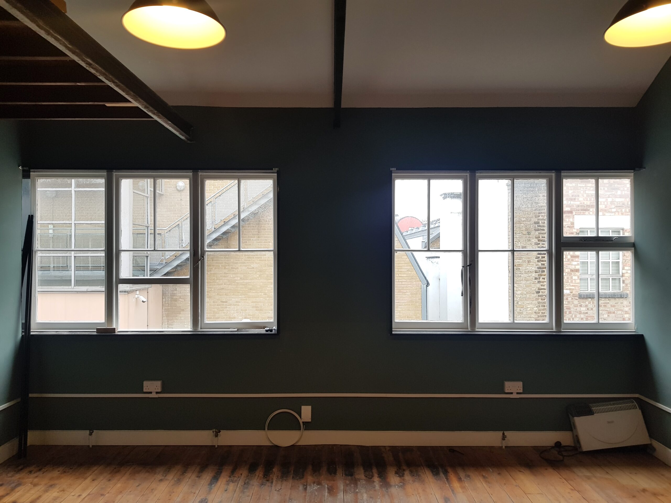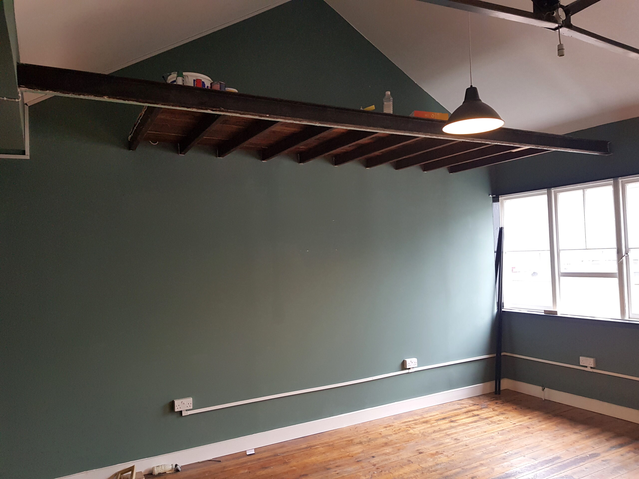 Studio has wooden flooring, dark green painted walls and huge windows for natural light and ventilation.