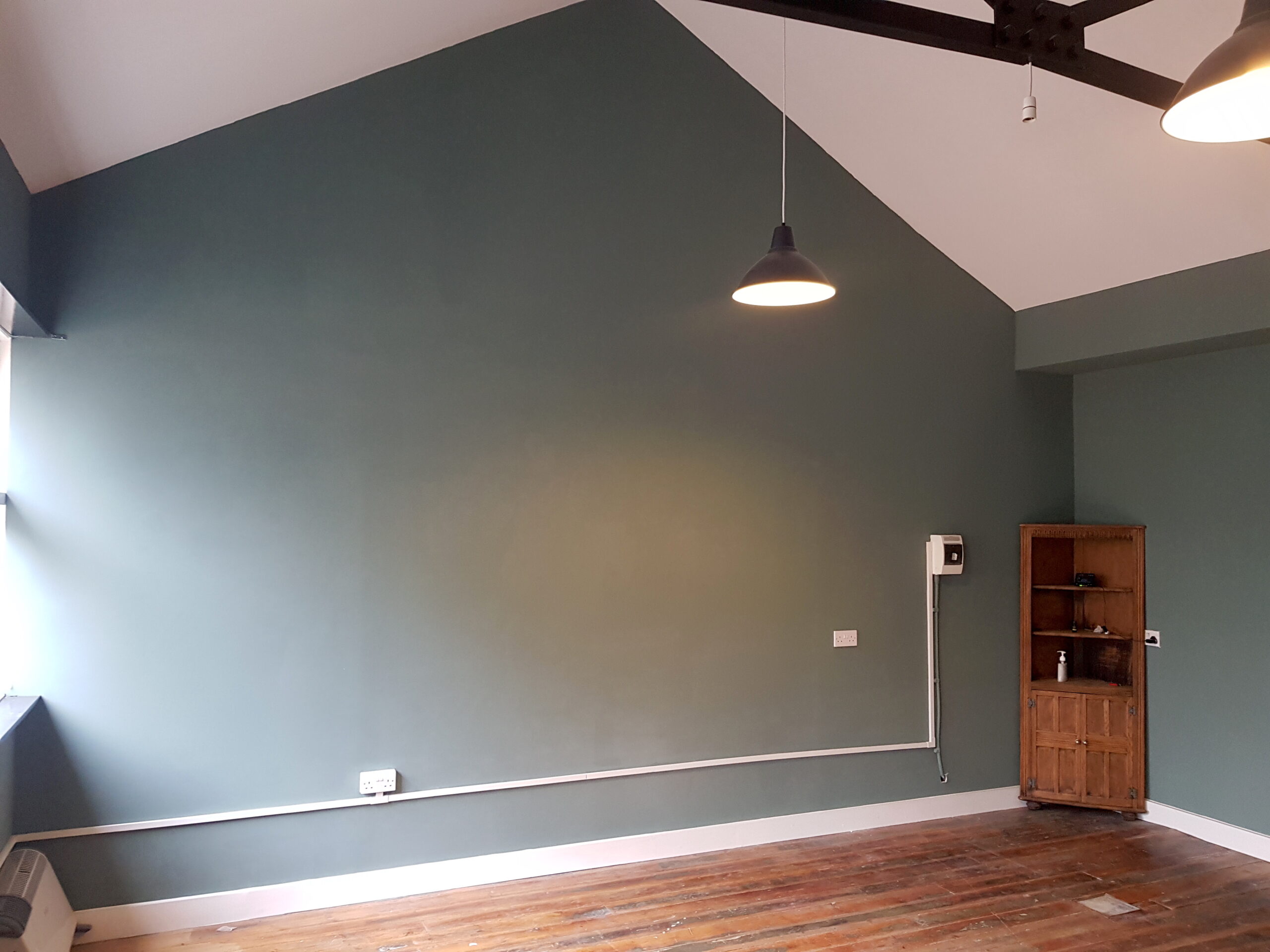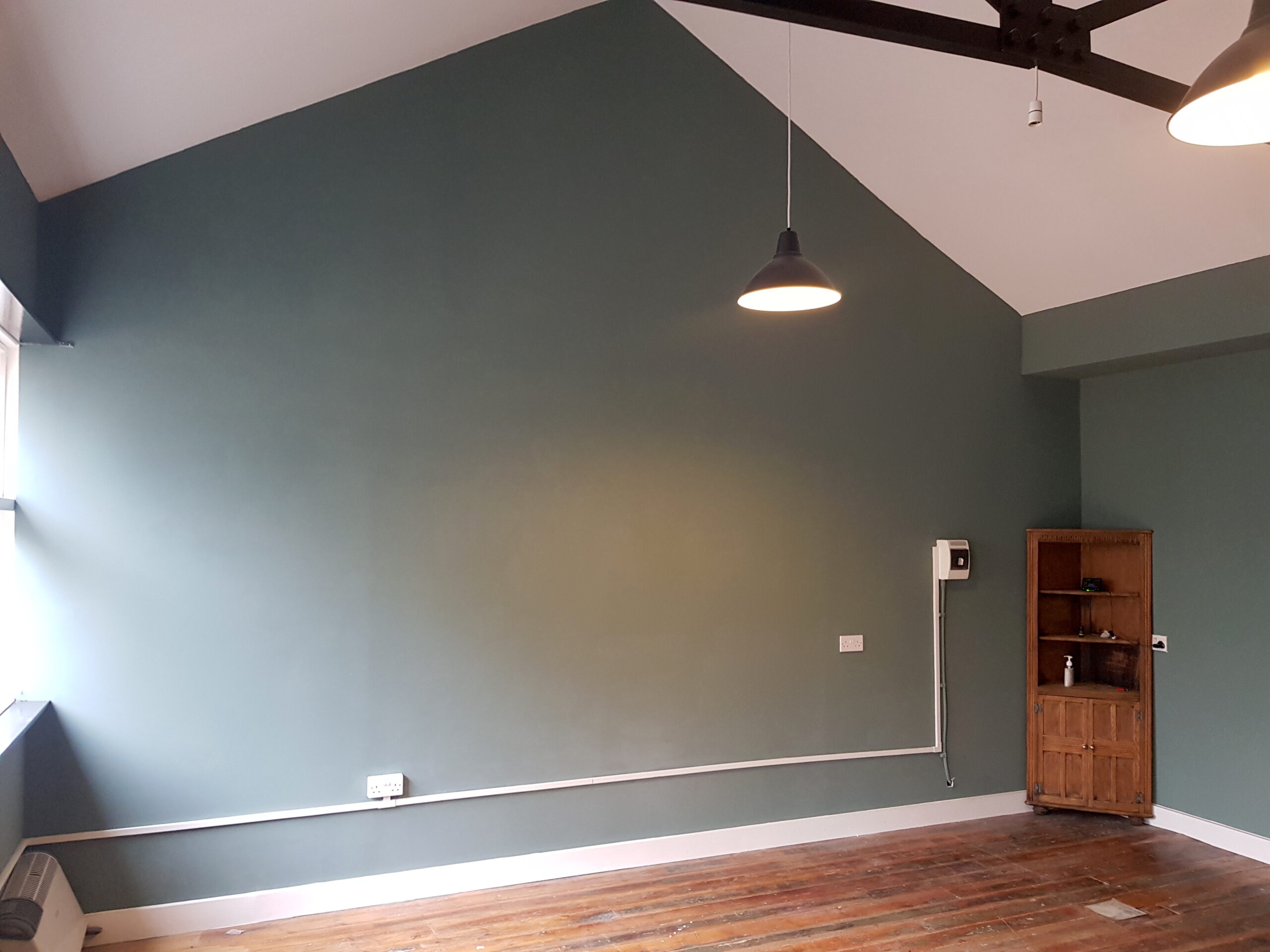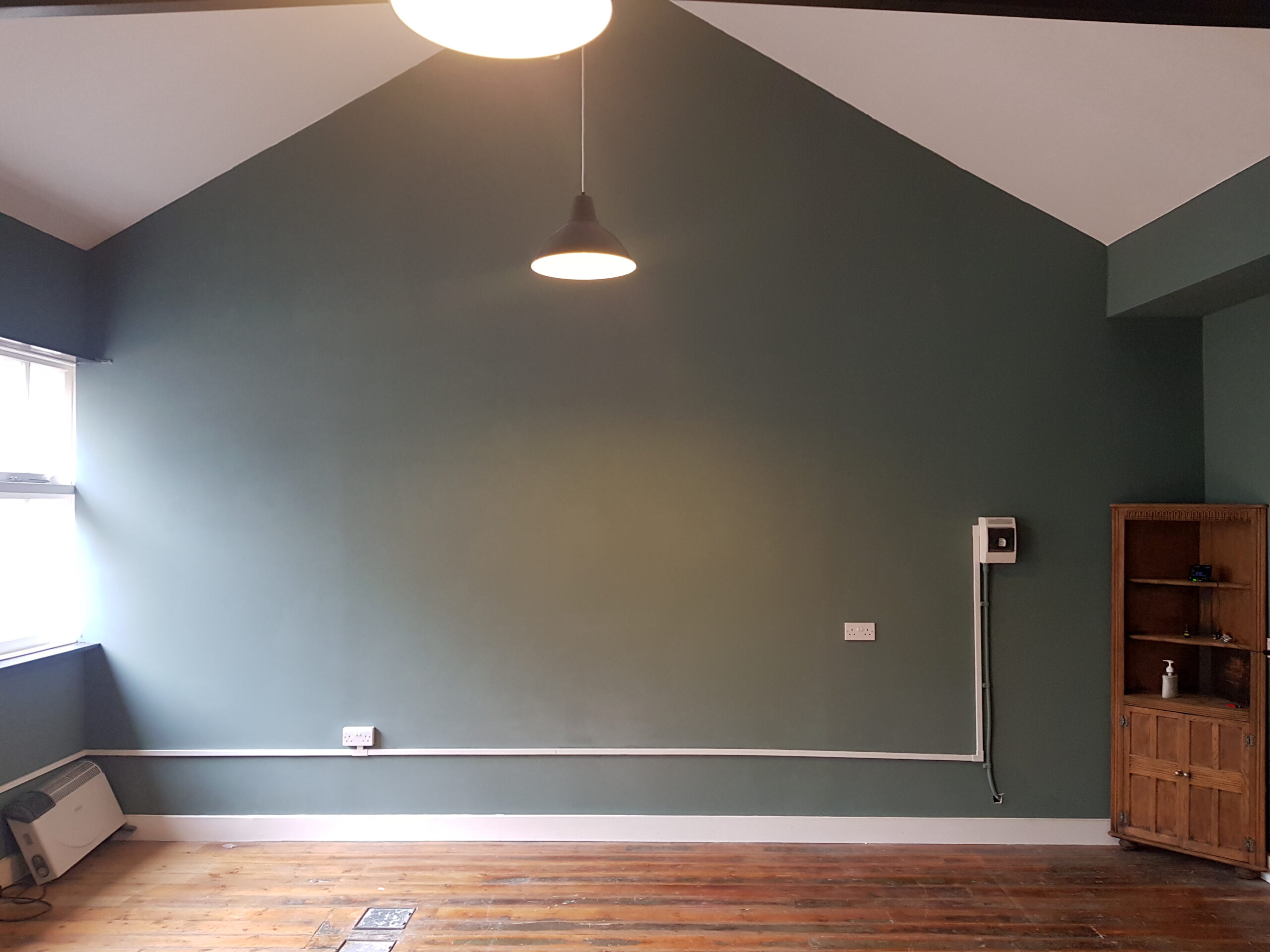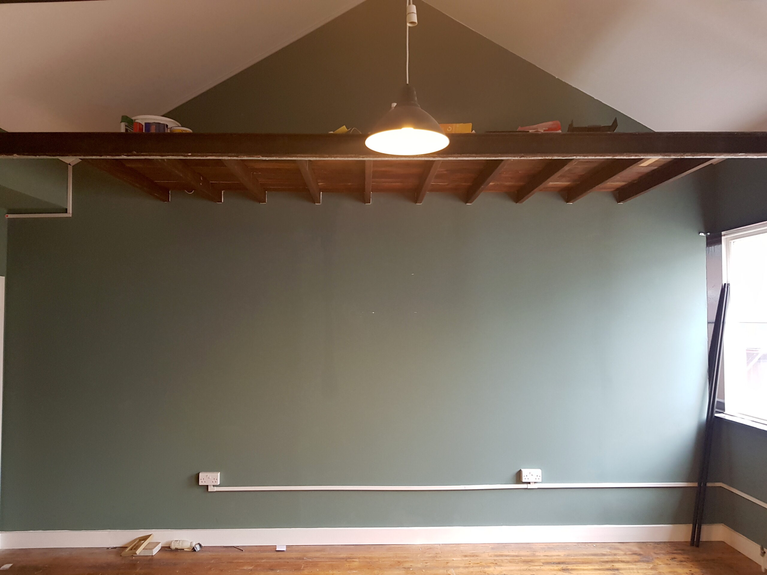 Studio has wooden flooring, dark green painted walls and huge windows for natural light and ventilation.