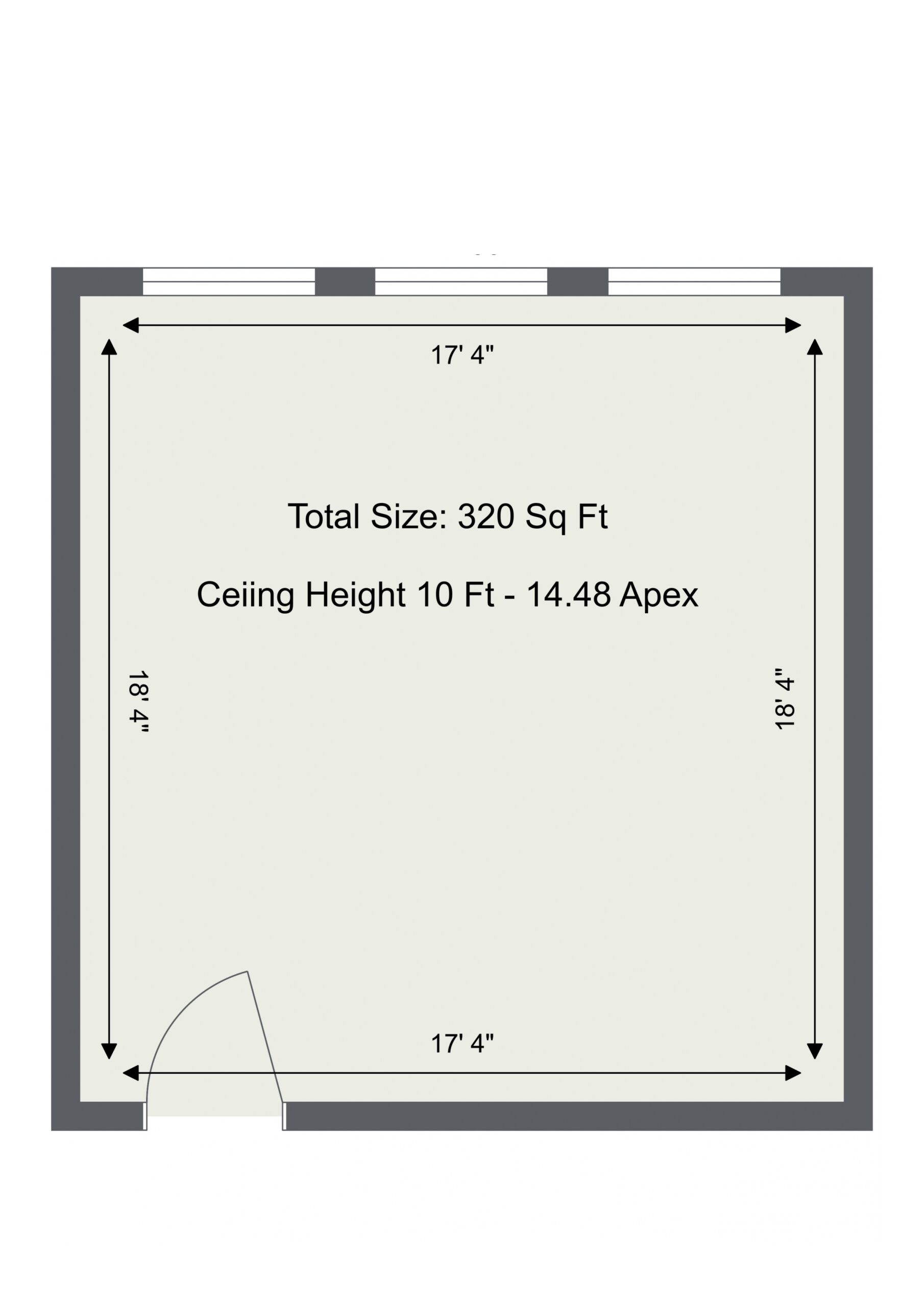 The studio is 320 sq ft in total and a has a pitched roof height of 15ft.