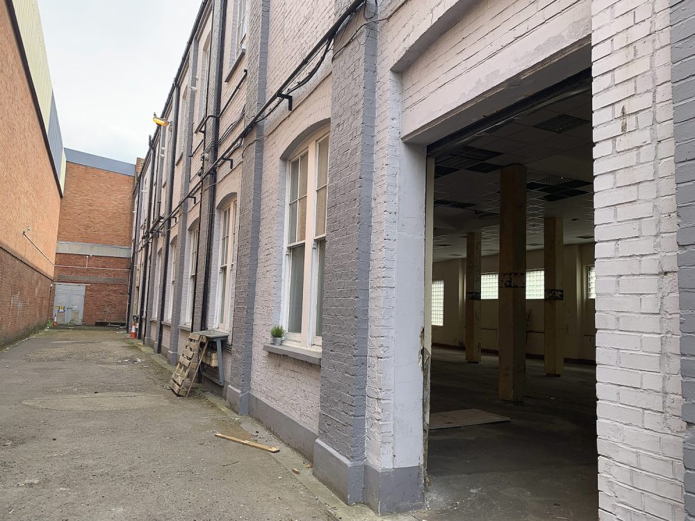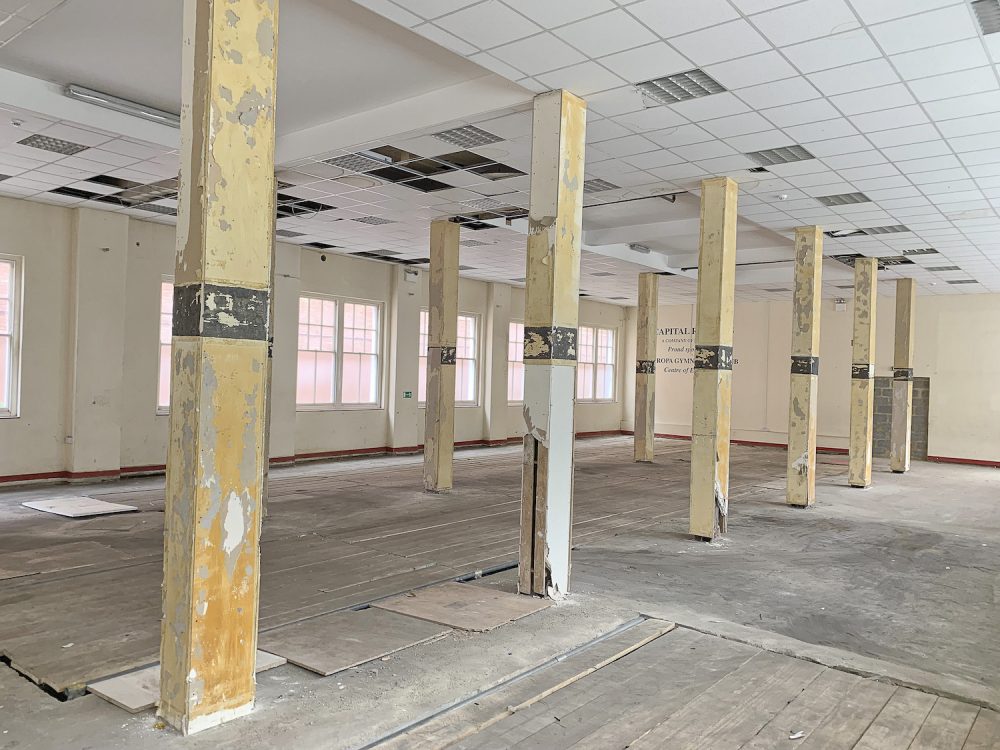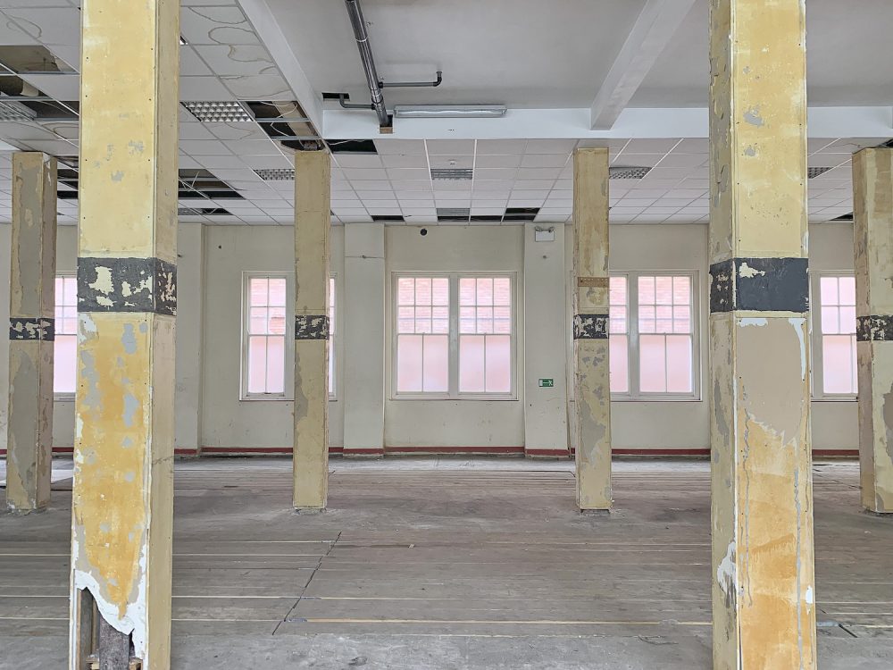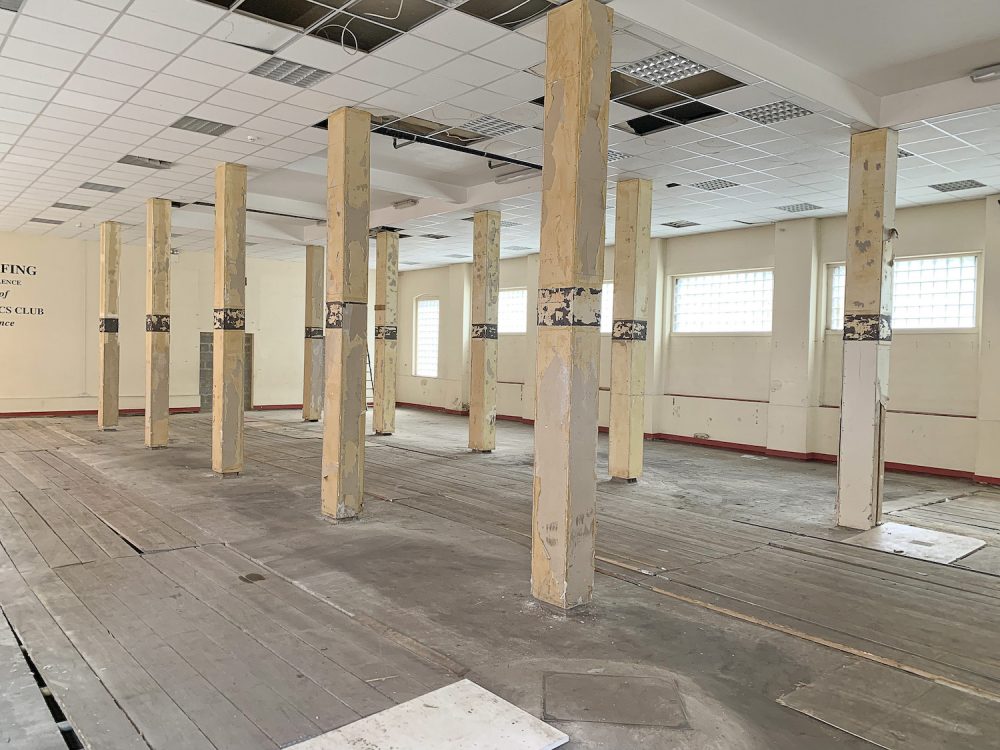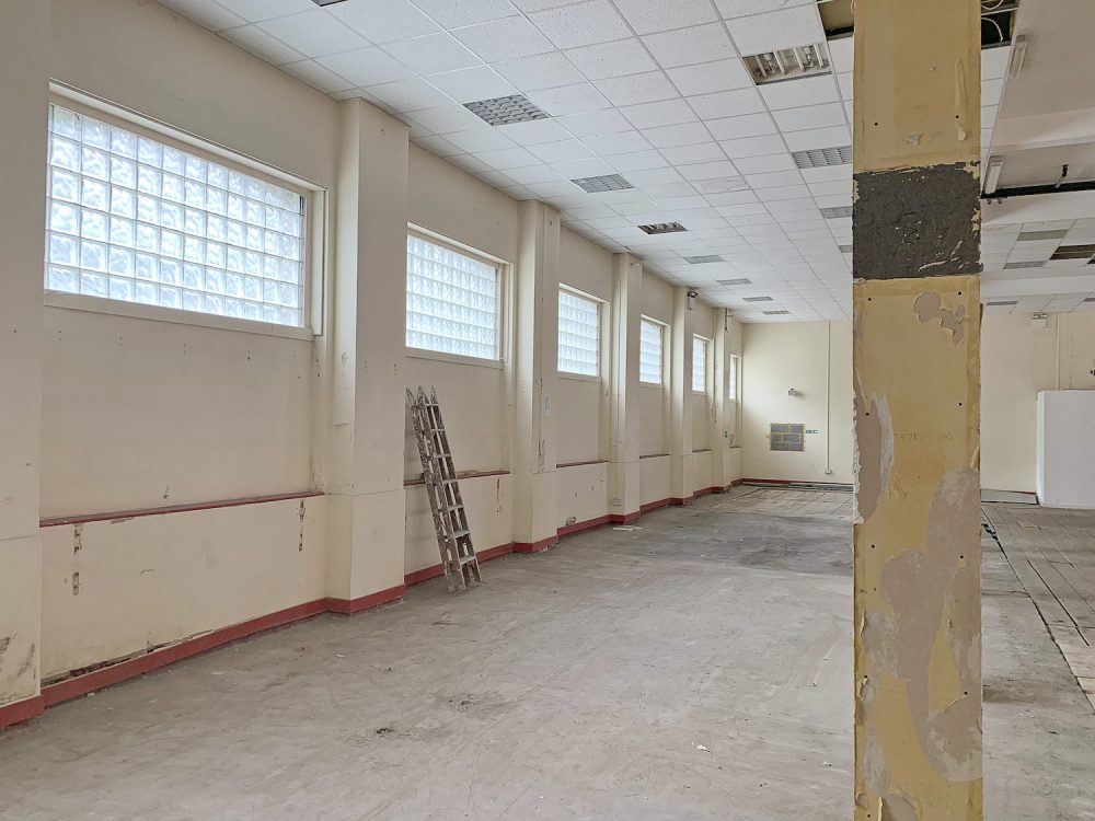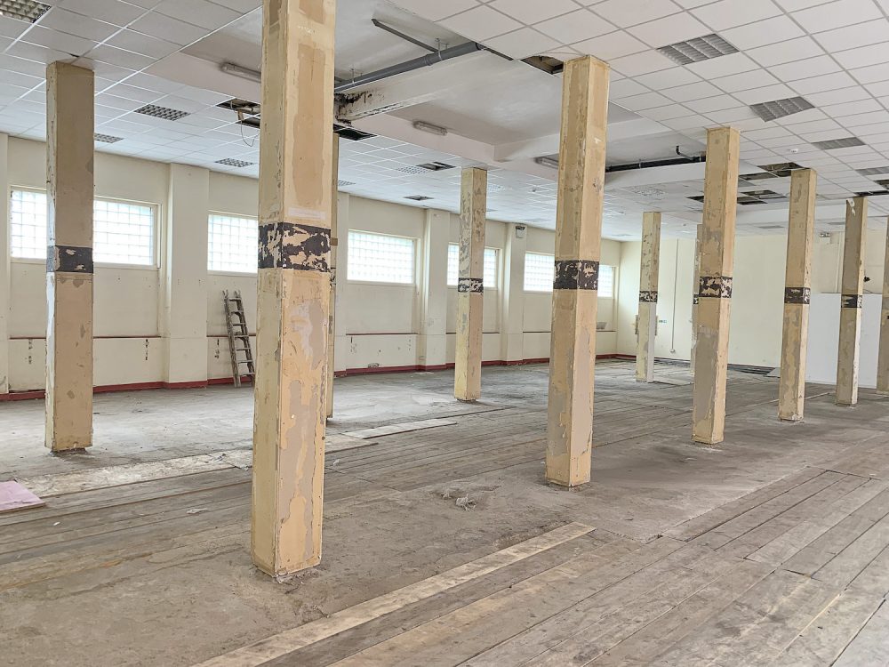 The ground floor warehouse unit has a ceiling height of 15ft, has bright white painted walls and natural light coming in from the windows in the open area.