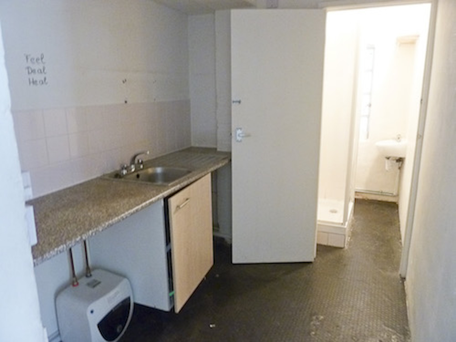 The unit consists of a large open area, 1 bedroom, separate WC/shower and a small kitchen area.