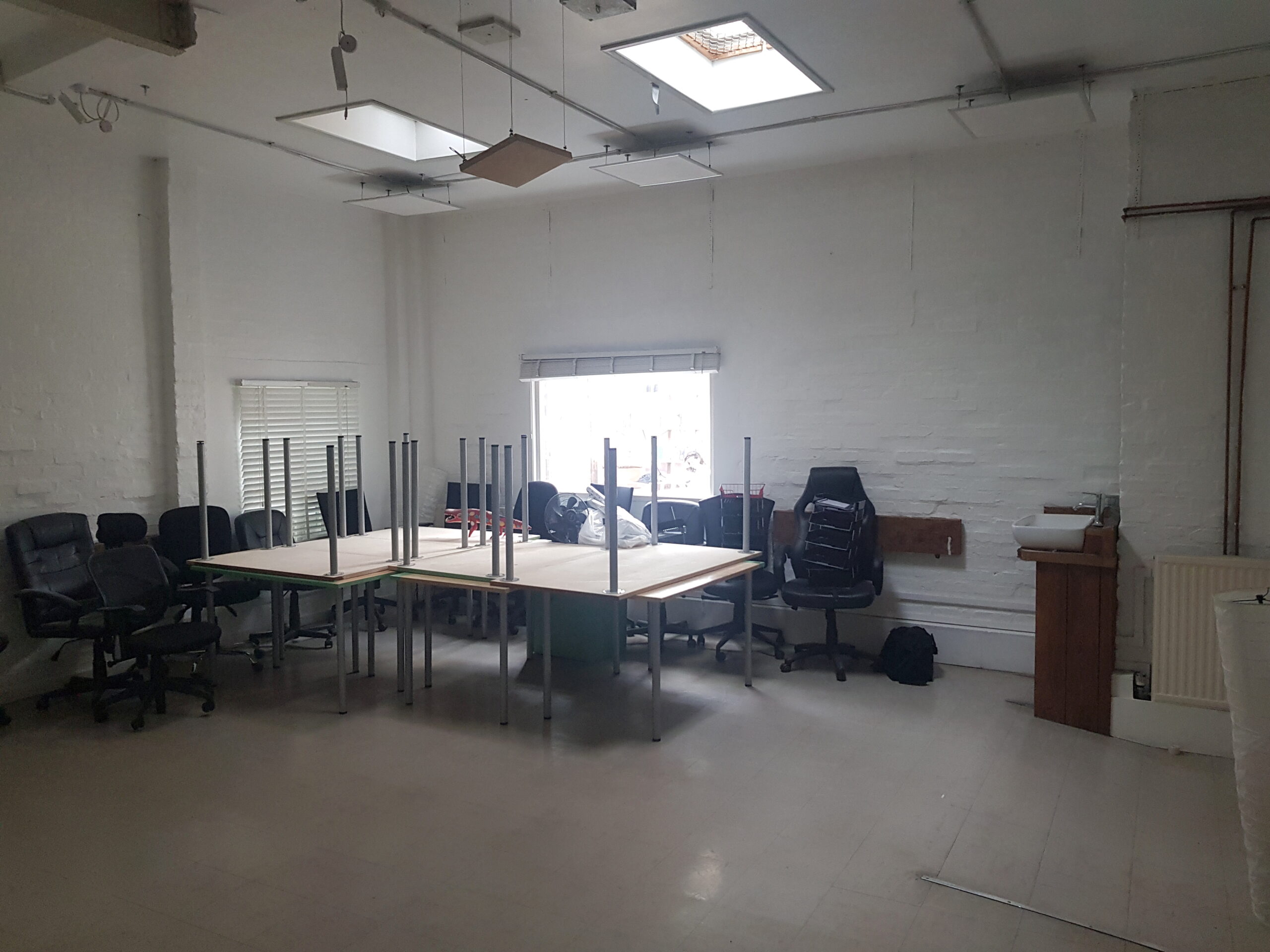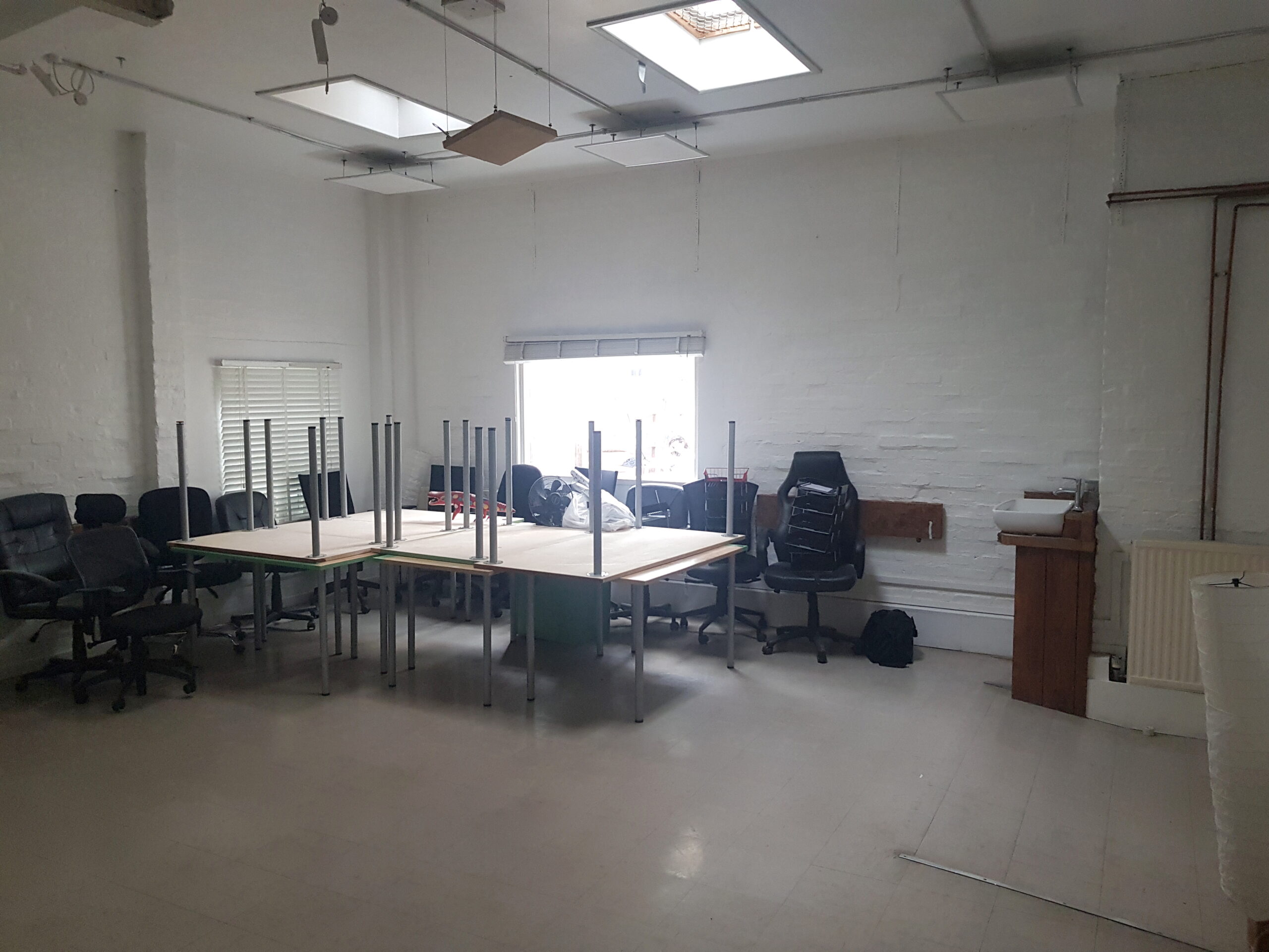 The studio has bright white painted walls, flint grey concrete flooring, multiple windows and skylights for natural light.