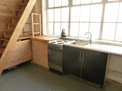 600 sq ft ground floor live work unit in converted warehouse, with mezzanine floor and a large open area