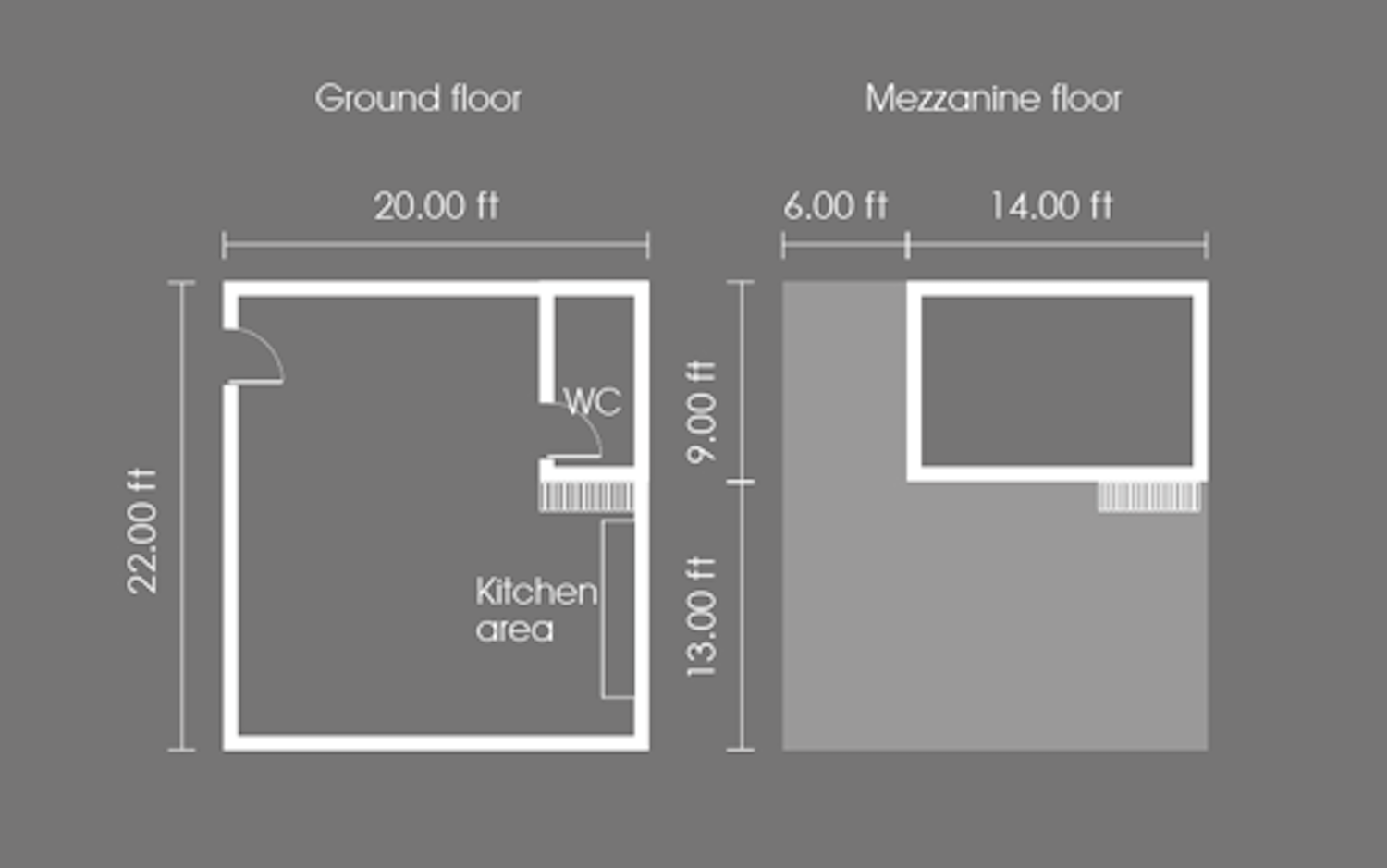 Unit consists of 450 sq ft on the ground floor, and 150 sq ft on the mezzanine floor.