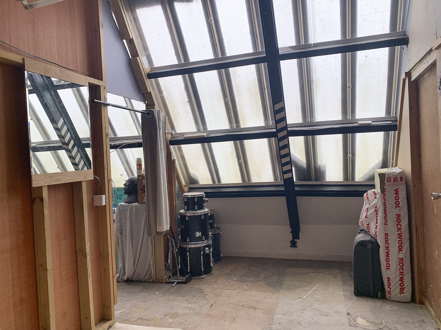 Studio has wooden panel floors, sky light windows to let in lots of natural light and a pitched roof with a 10ft ceiling height at its peak.