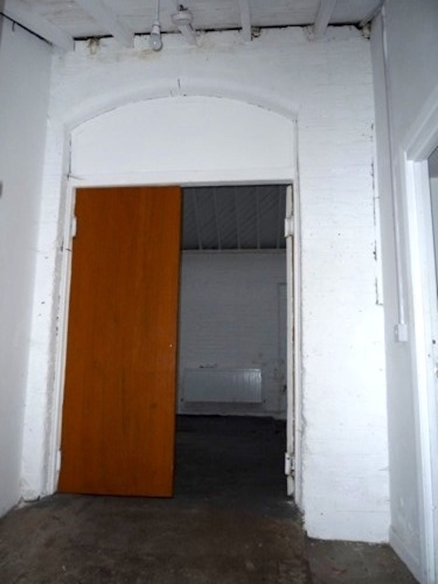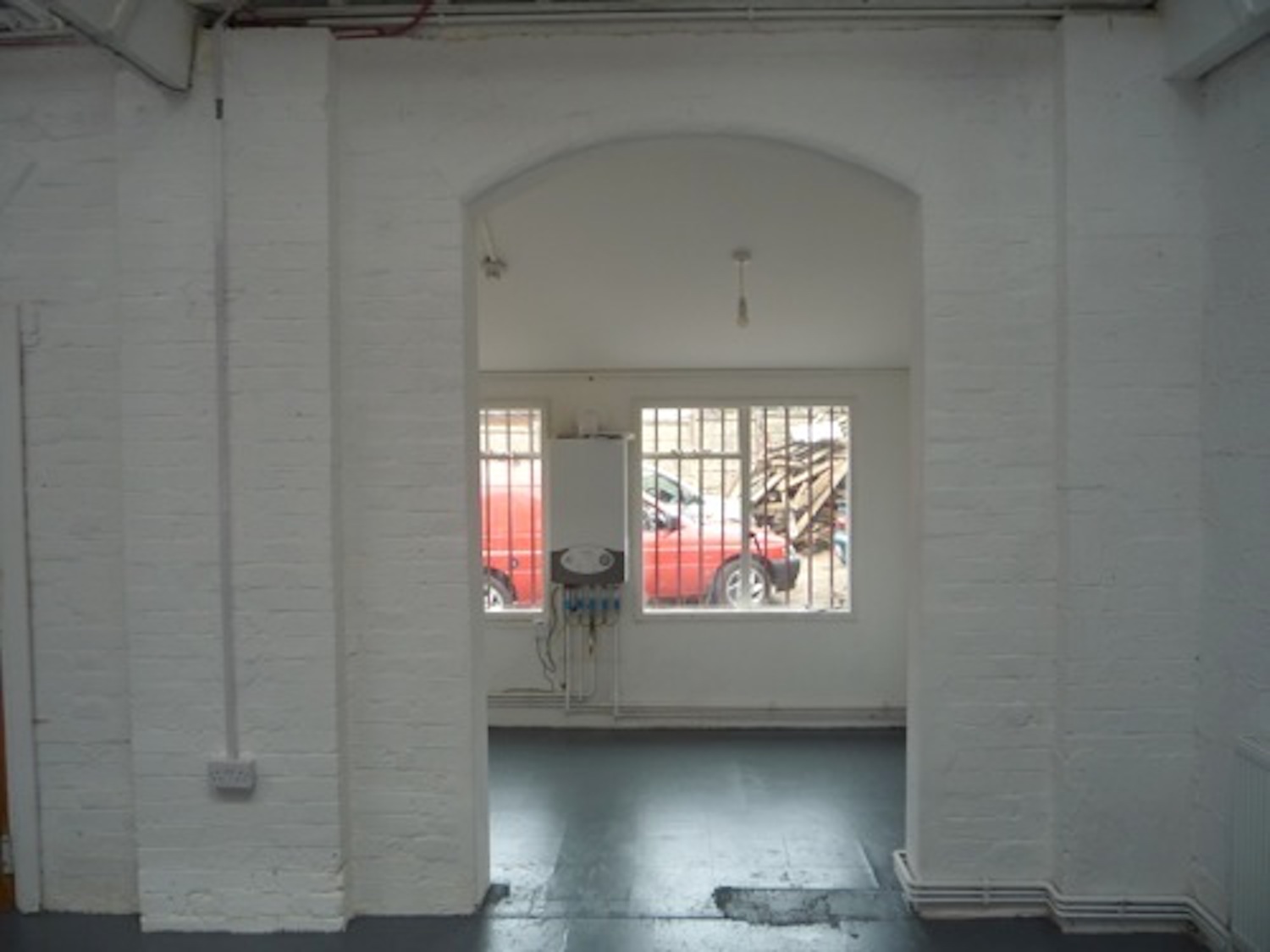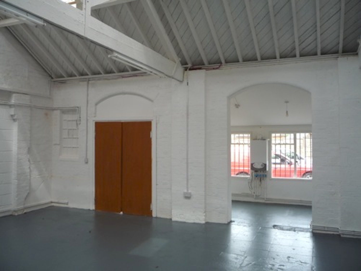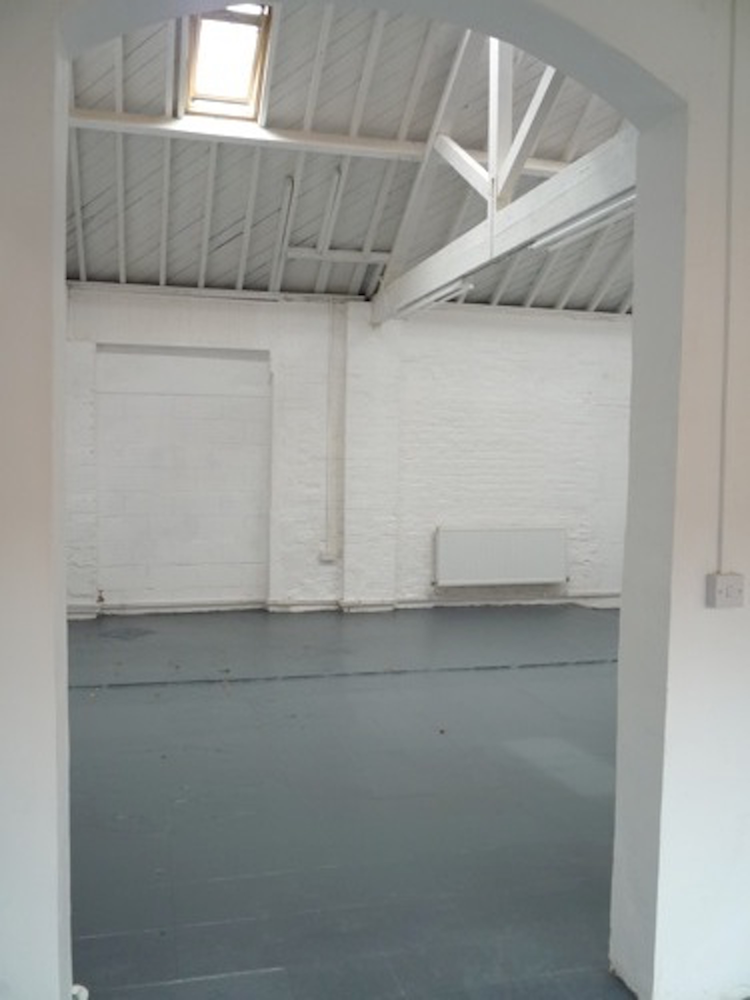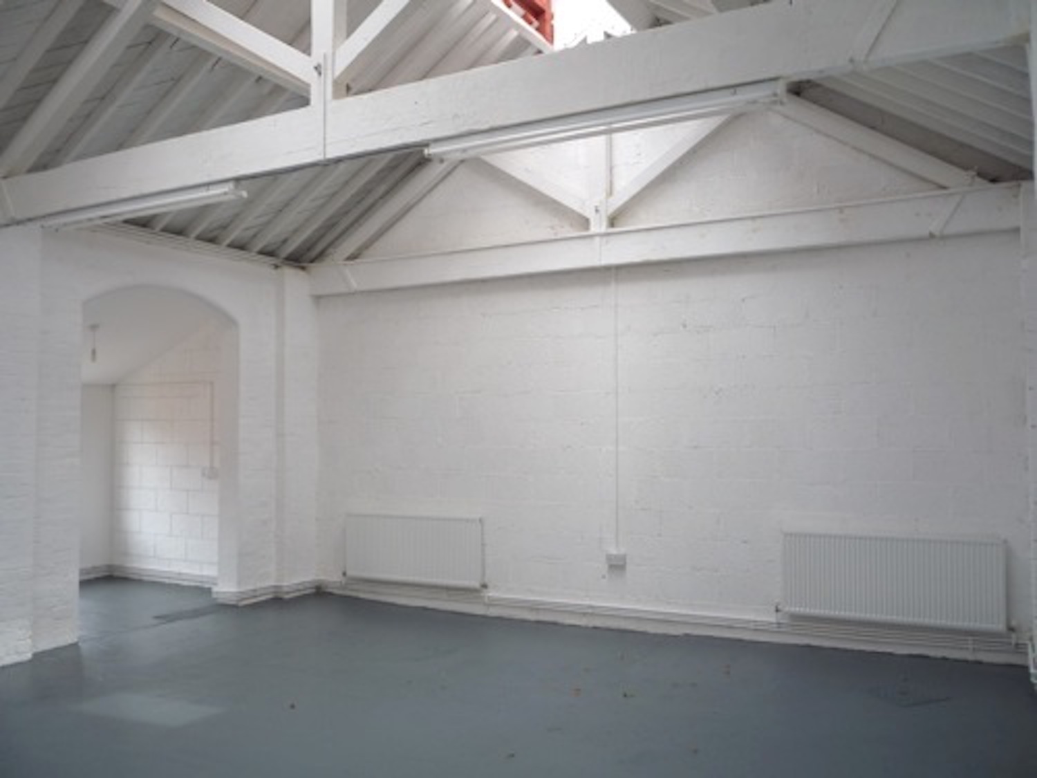 Warehouse has a concrete floor (painted flint grey), white walls, pitched roof with panels to let in lots of natural light.