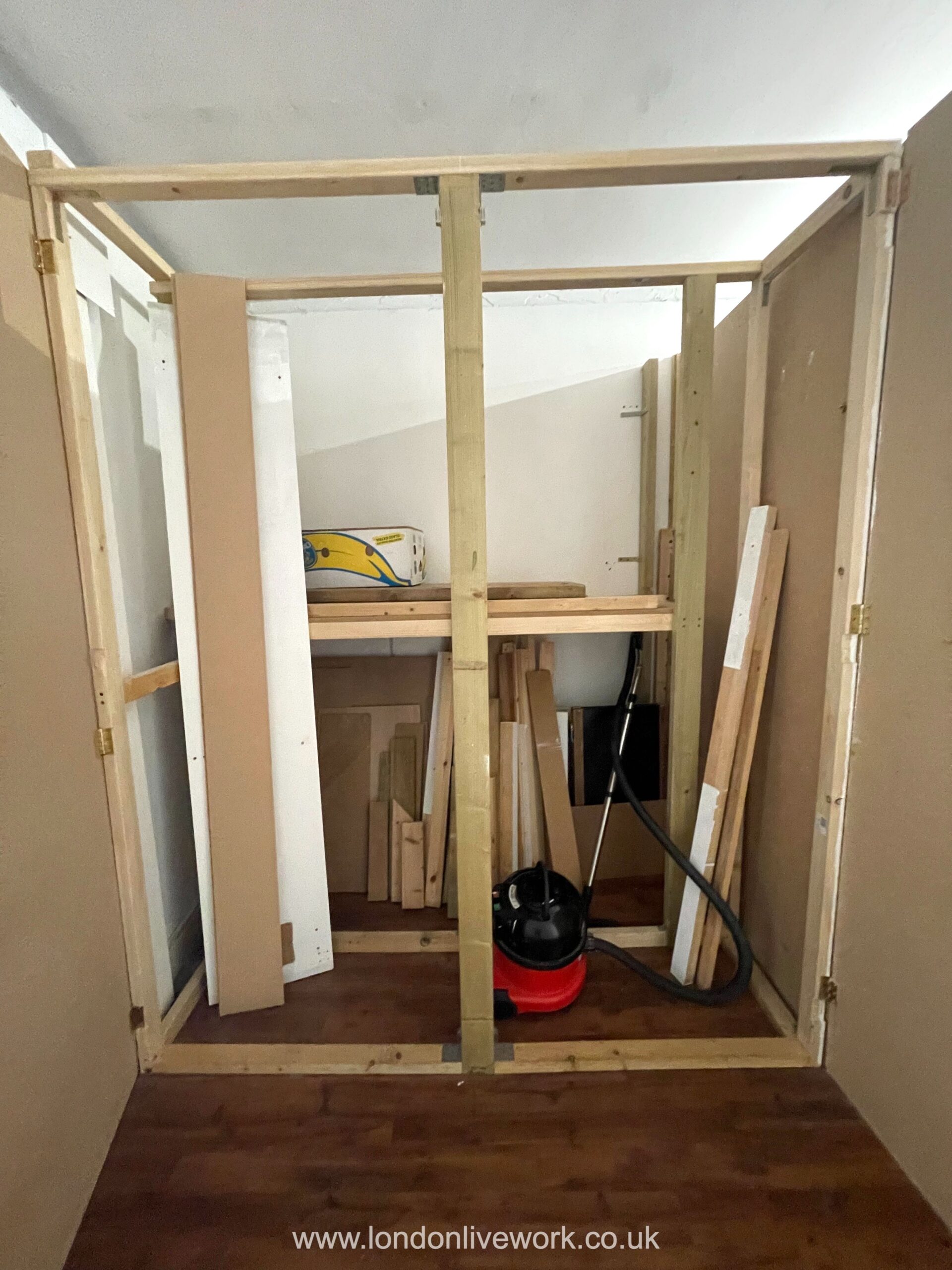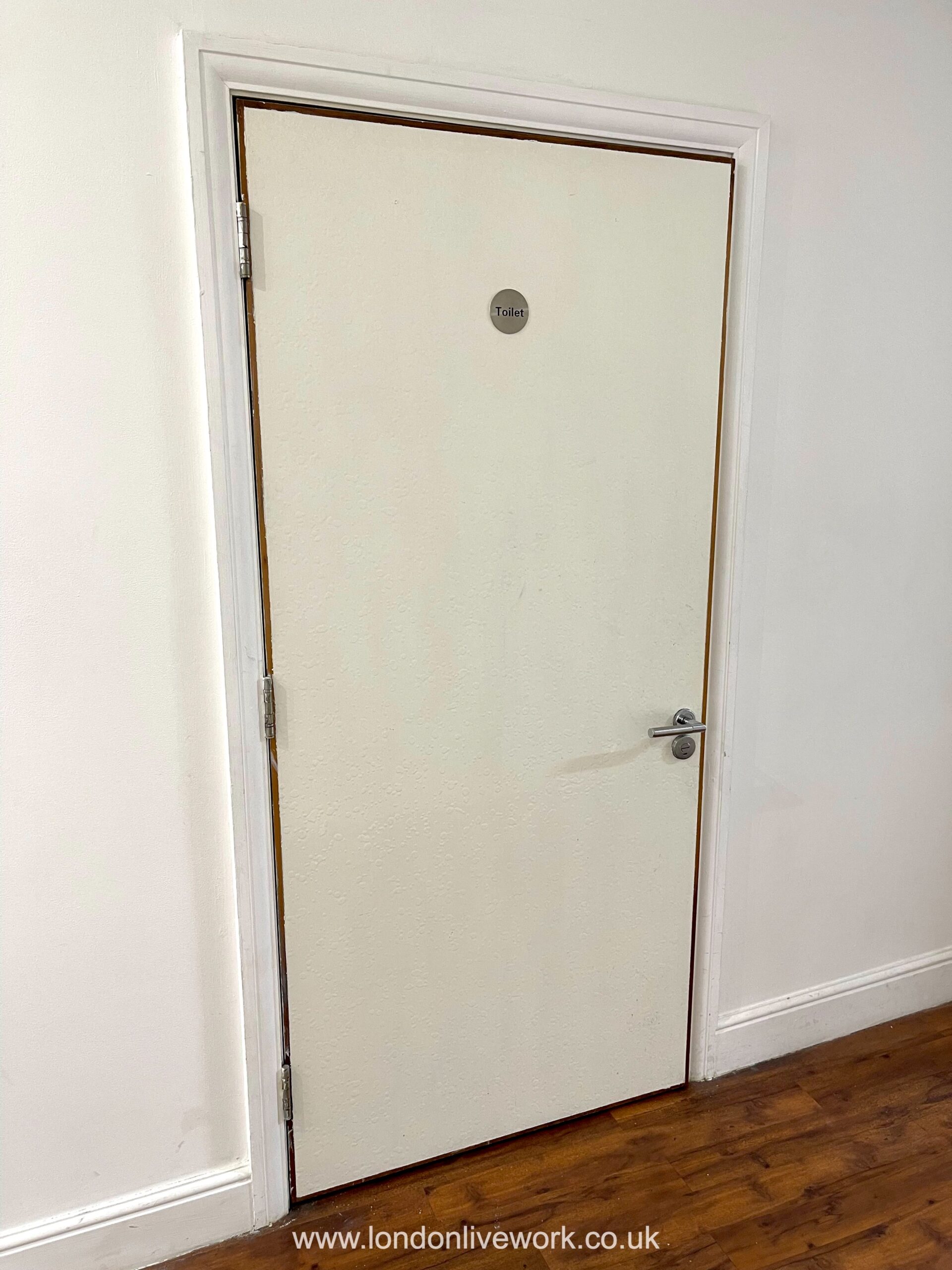 There are bright white walls and the floor is mainly oak brown laminate, with a small section of the floor tiled.