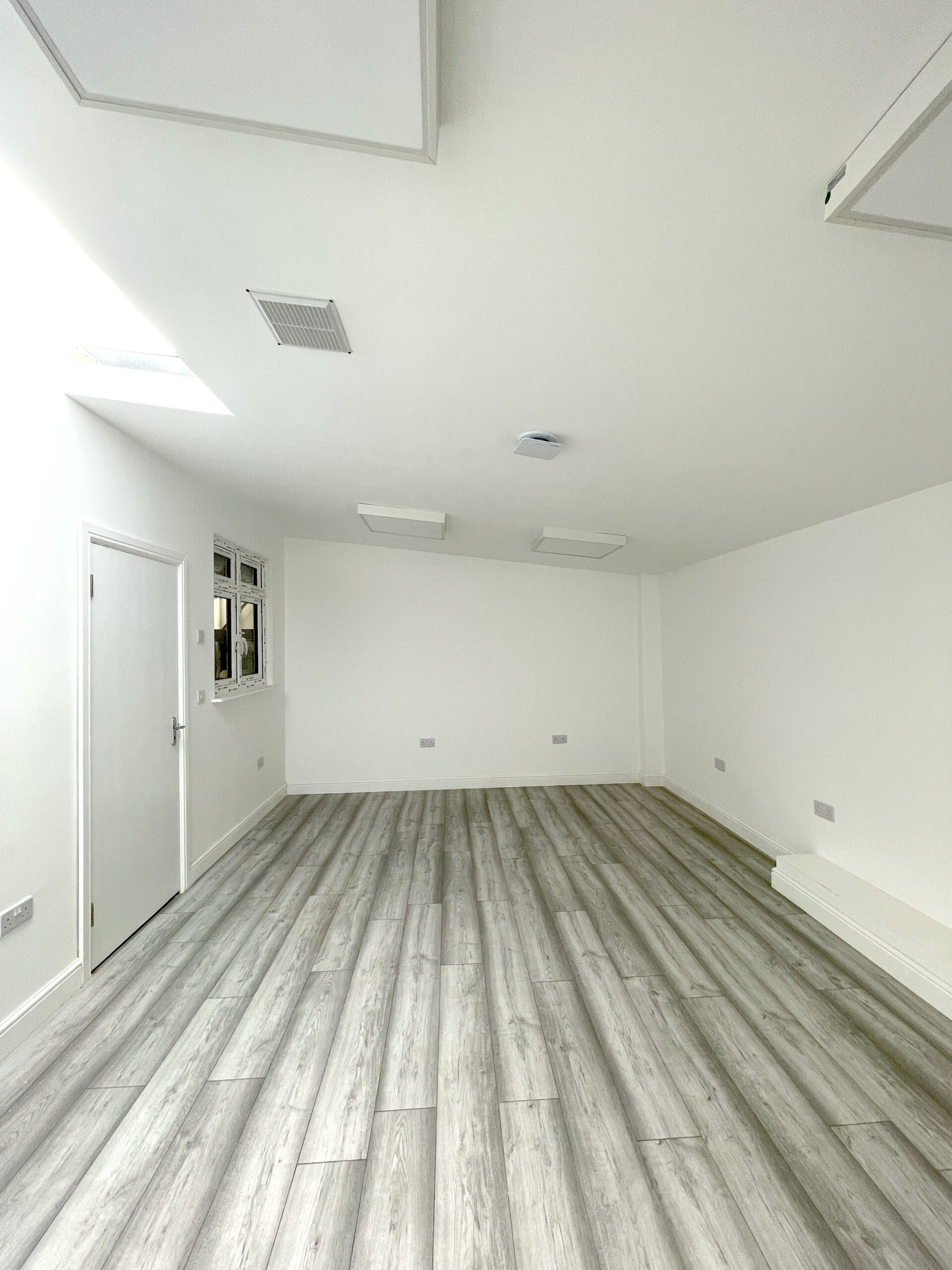 - Bright white walls and wooden flooring