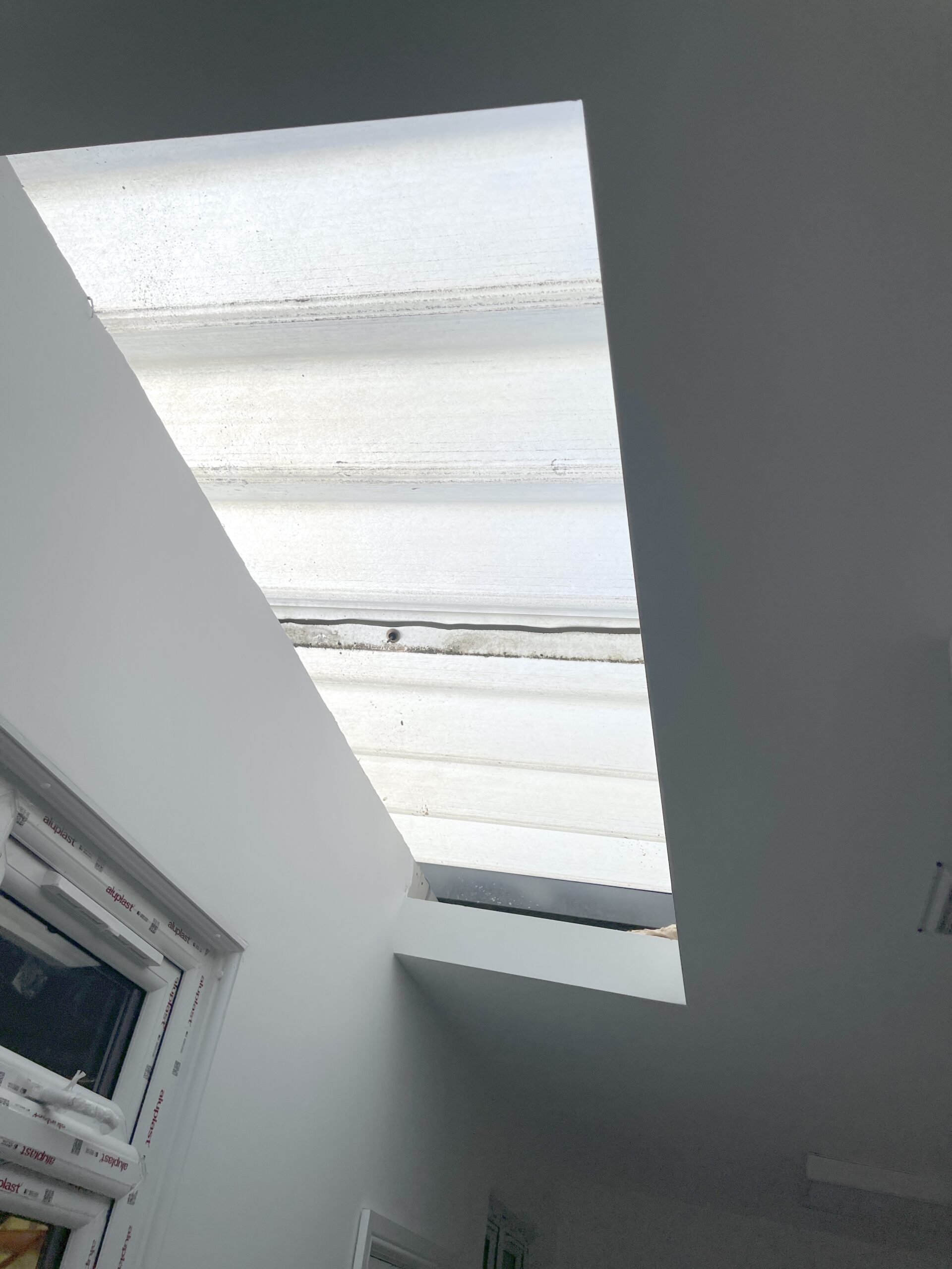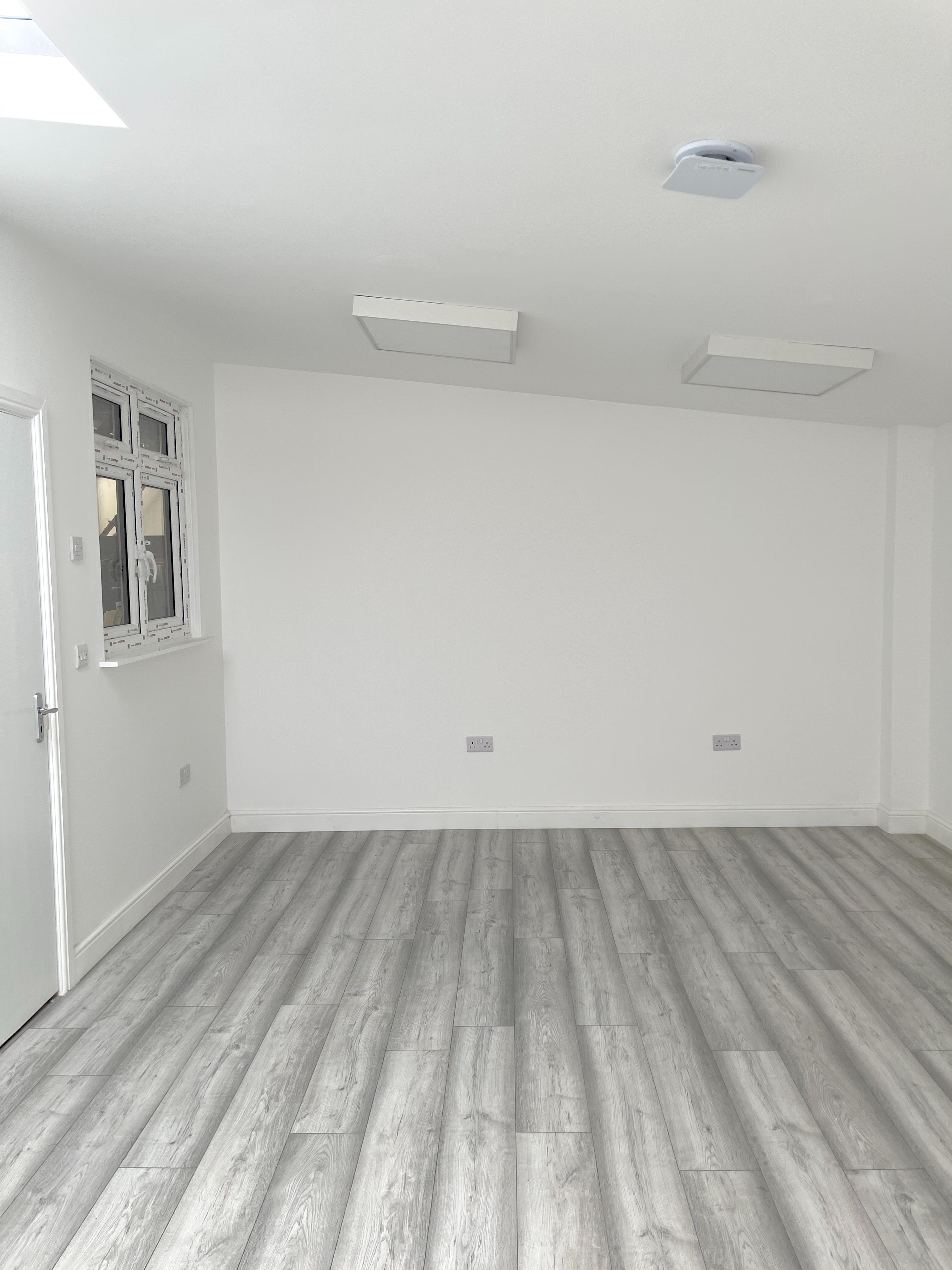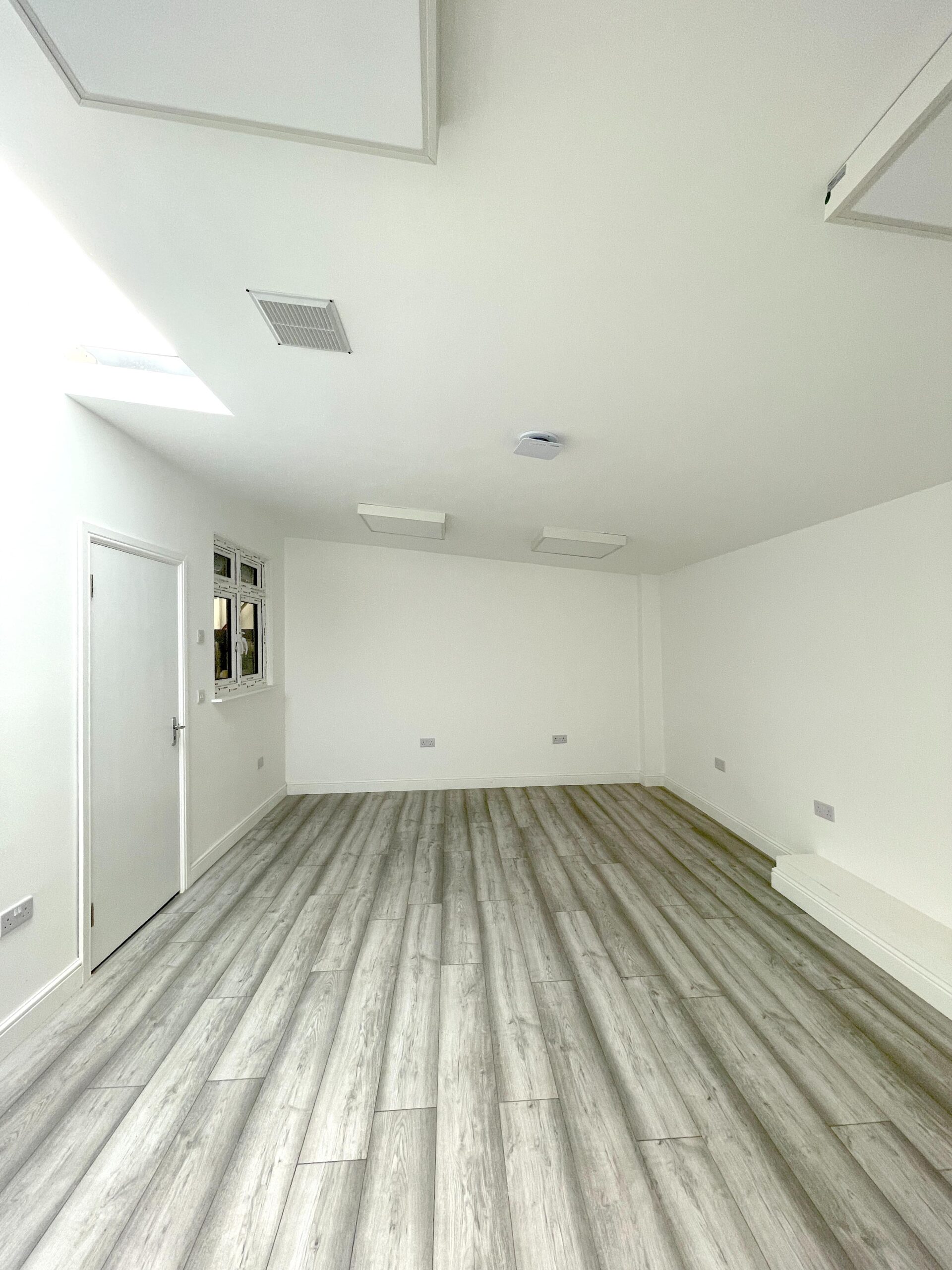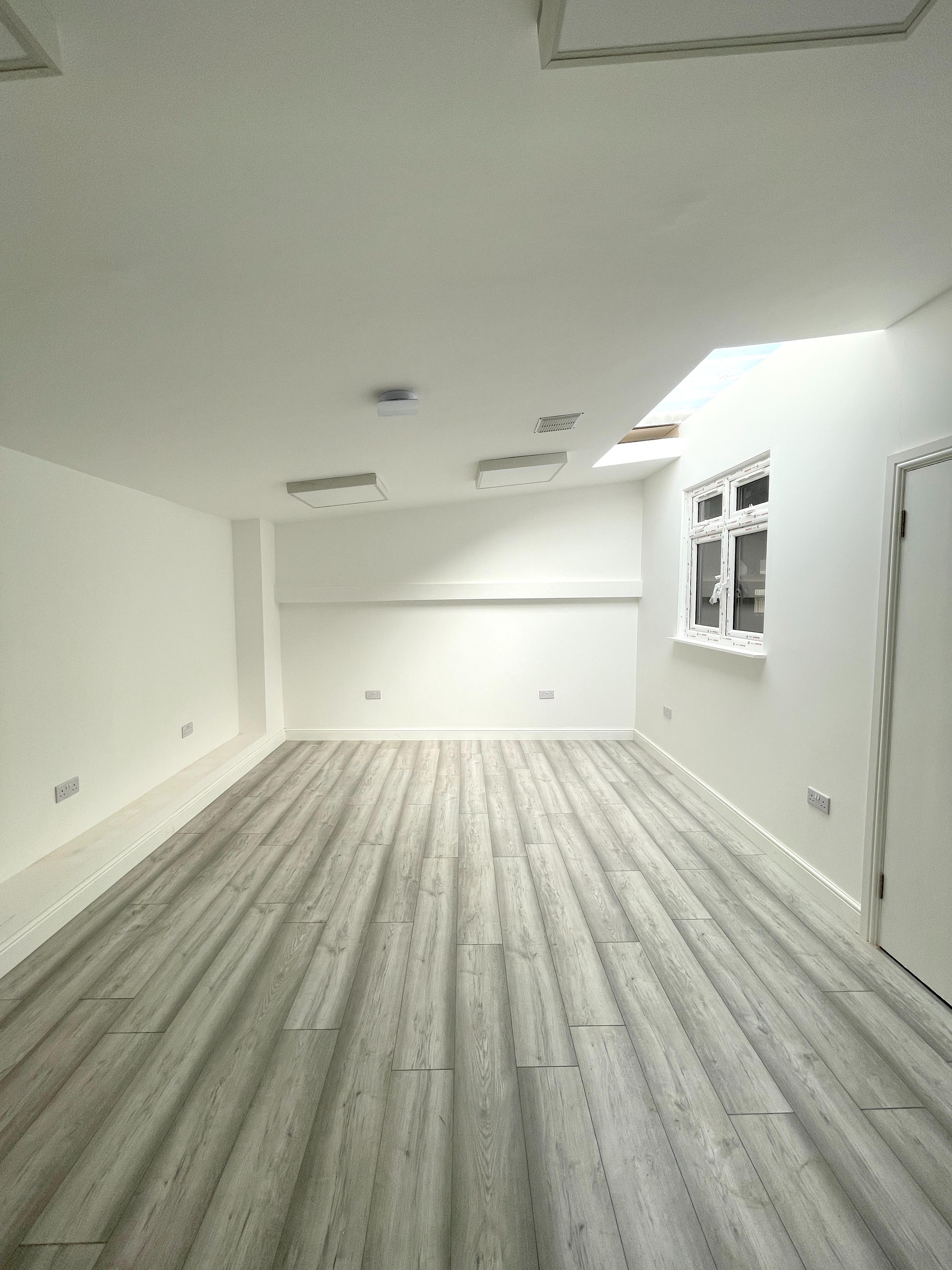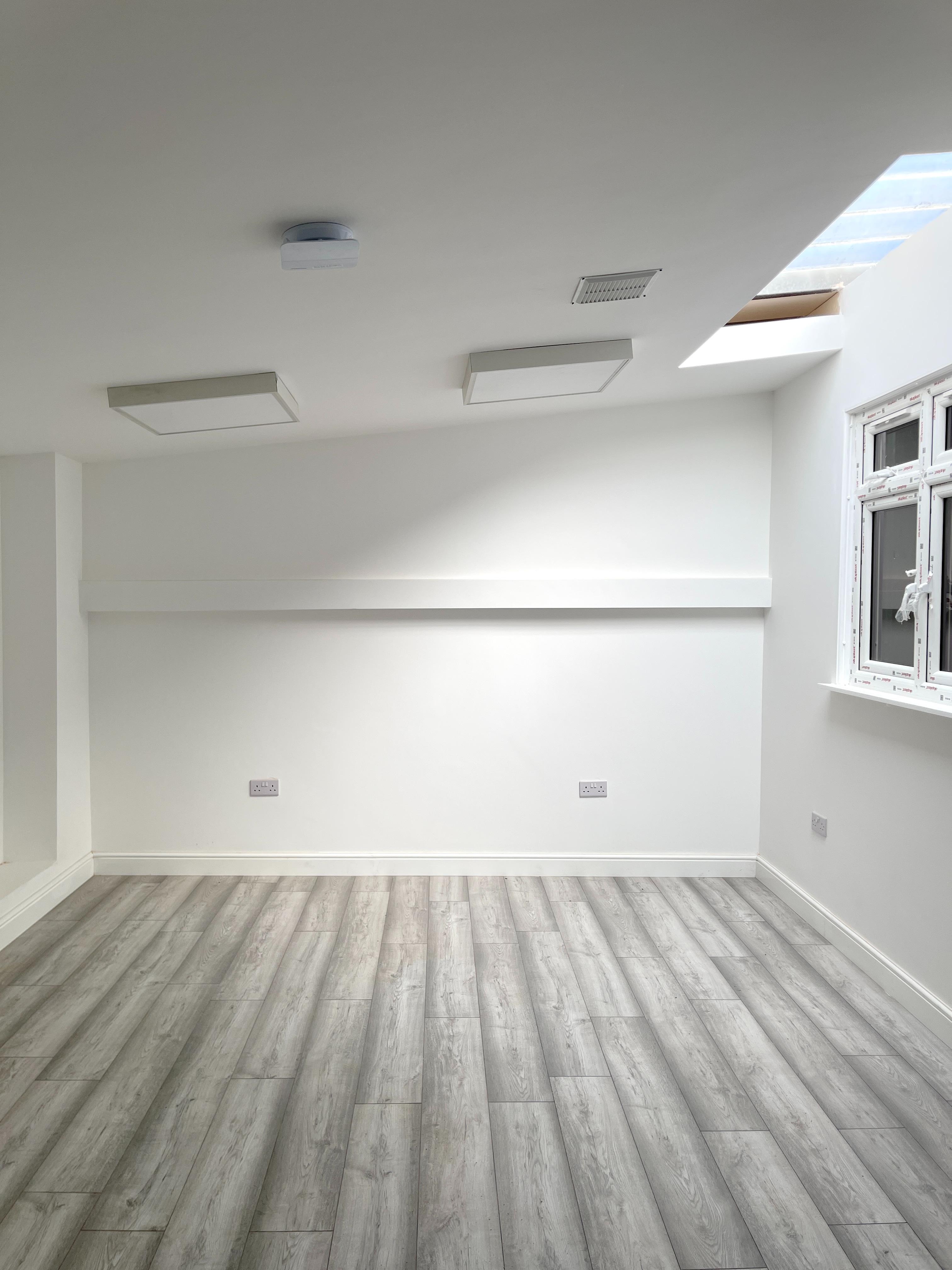 The space is bright and versatile, featuring white walls, wooden floors, and skylights — perfect for creative or production work.
