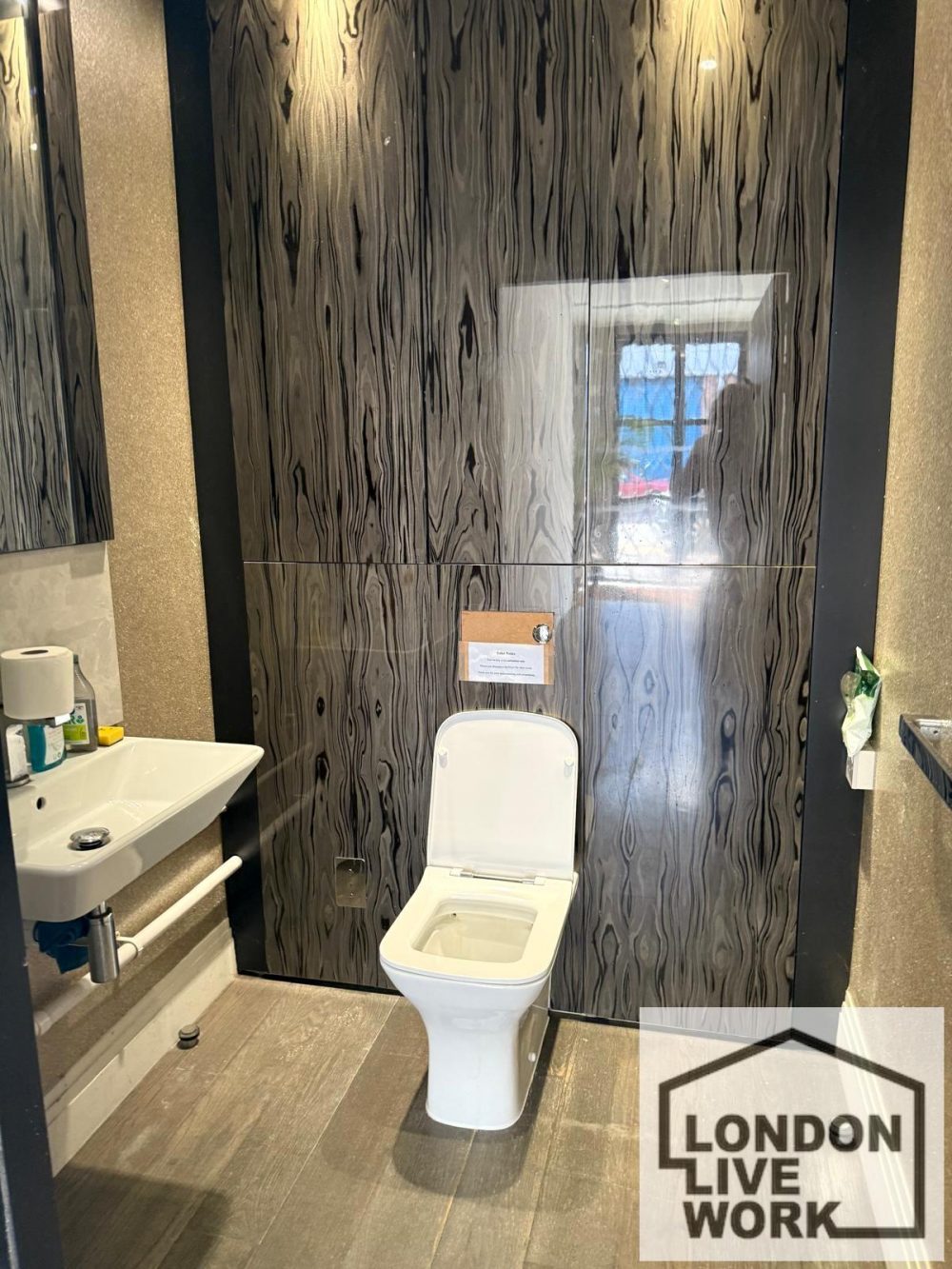 The studio is 250 sq ft in size, with bright white walls, large windows to let in plenty of natural light, and a wooden floor. The space has underfloor heating, and the front curved window is made of acoustic glass, for sound insulation. There is also a shutter over the window (electric) for added security, and an intercom to let people in the building. The ceiling height is 9’07.