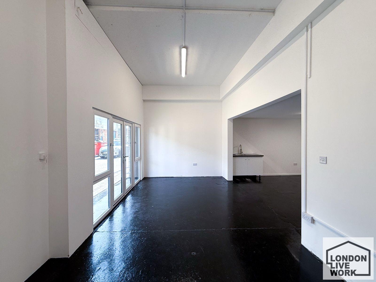 The studio is 500 sq ft in size, with white painted walls and a grey floor, plus large windows to let in plenty of natural light. There are also glass double doors leading out onto the street.