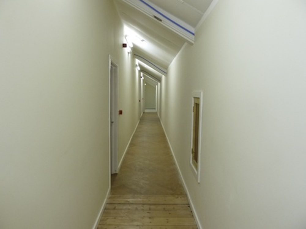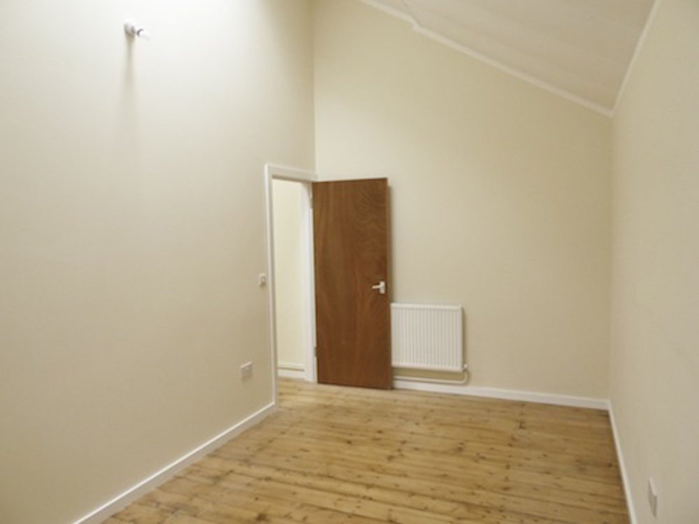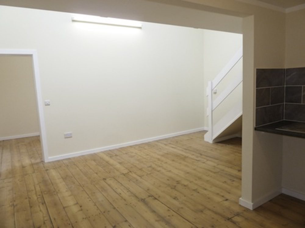 The studio has been painted white, and has a wooden floor throughout.