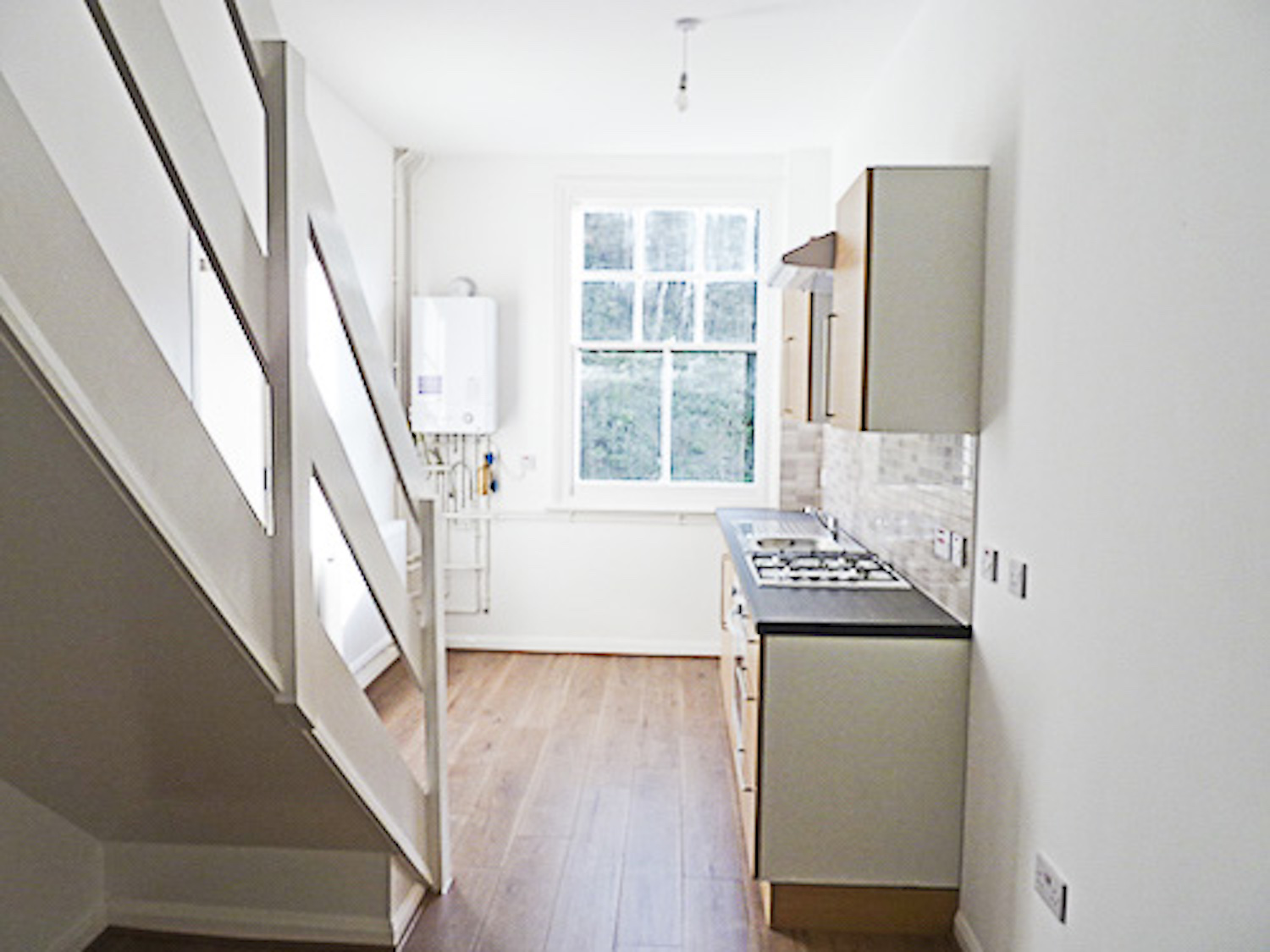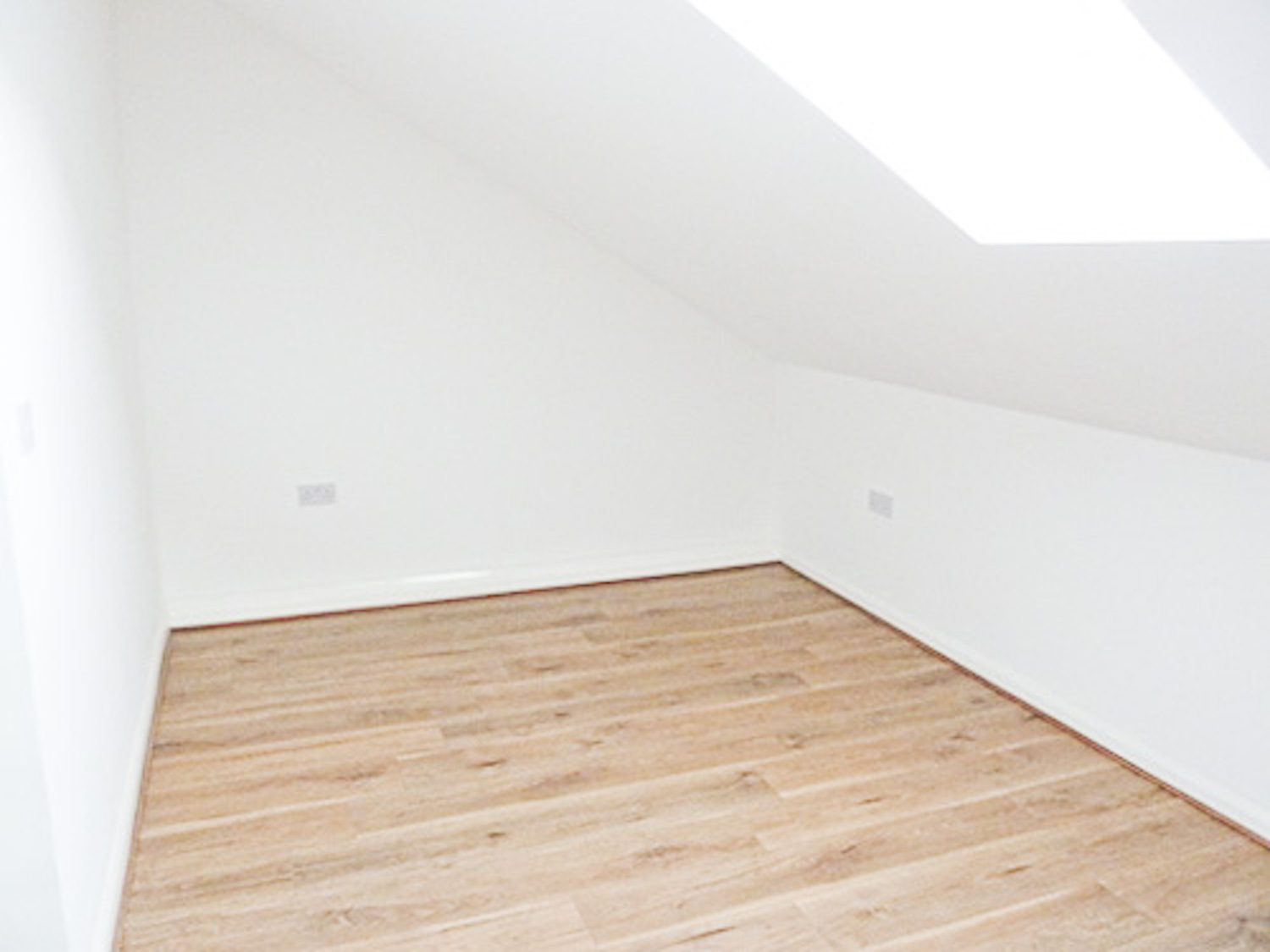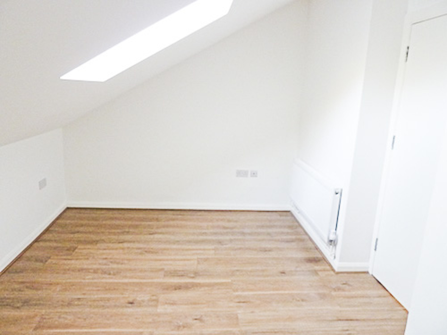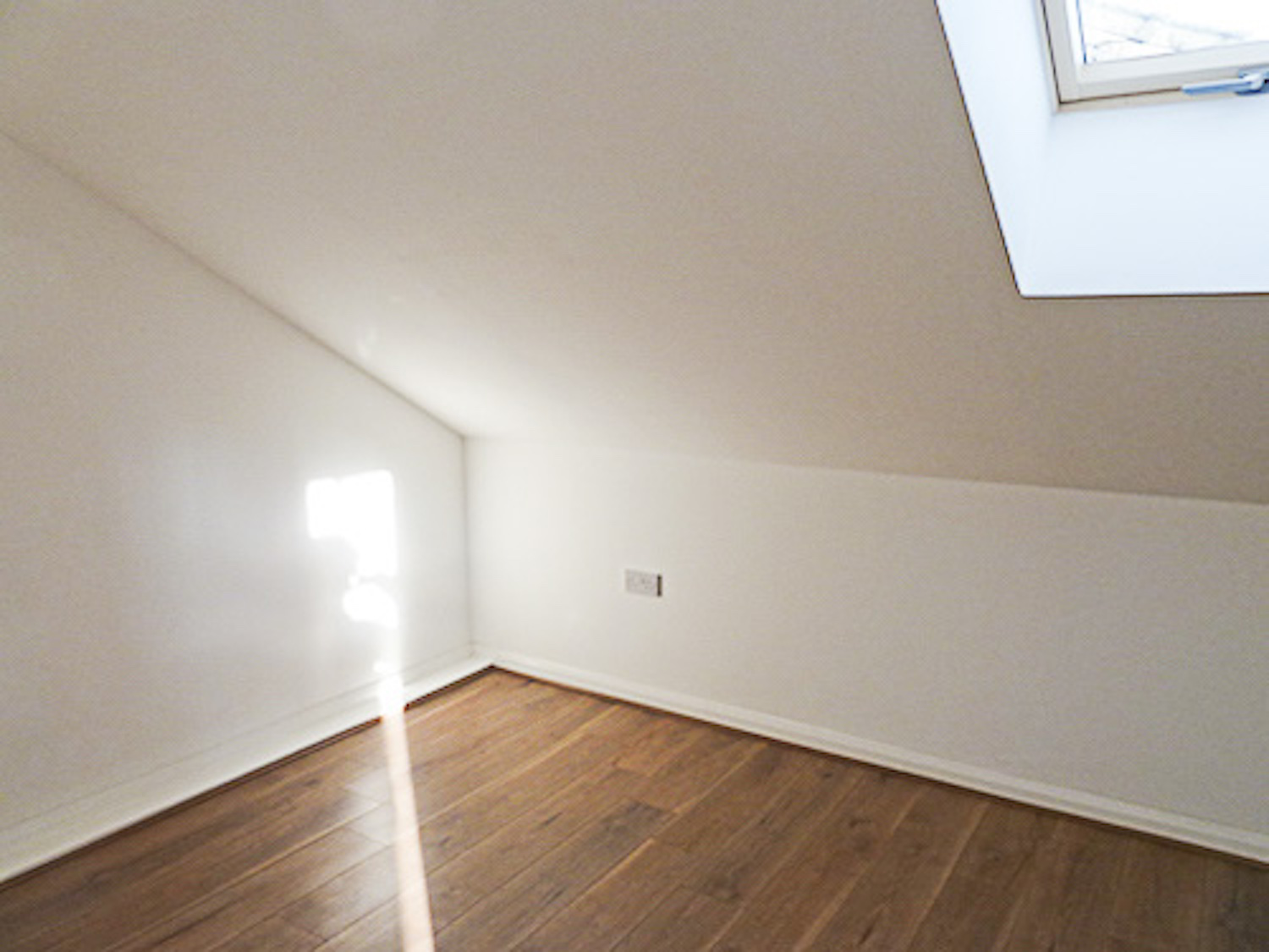 The studio has bright white painted walls, brand new laminate flooring and lots of natural light coming in from the windows in the open area and the velux skylight windows in the mezzanine floor.