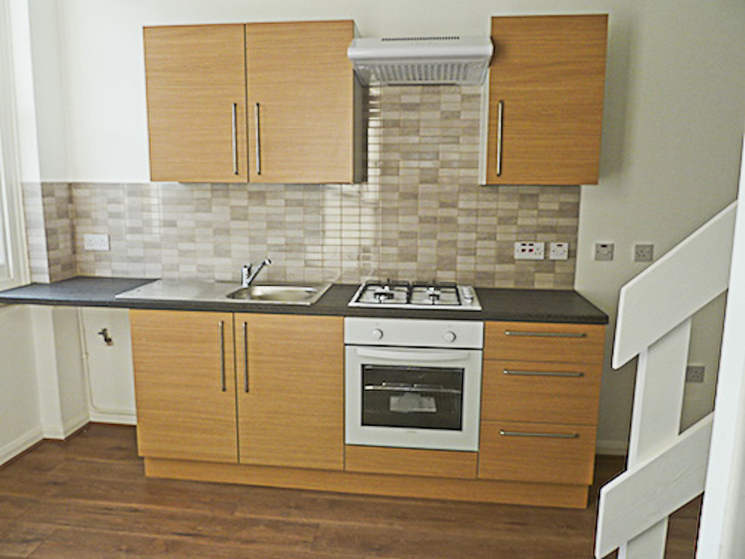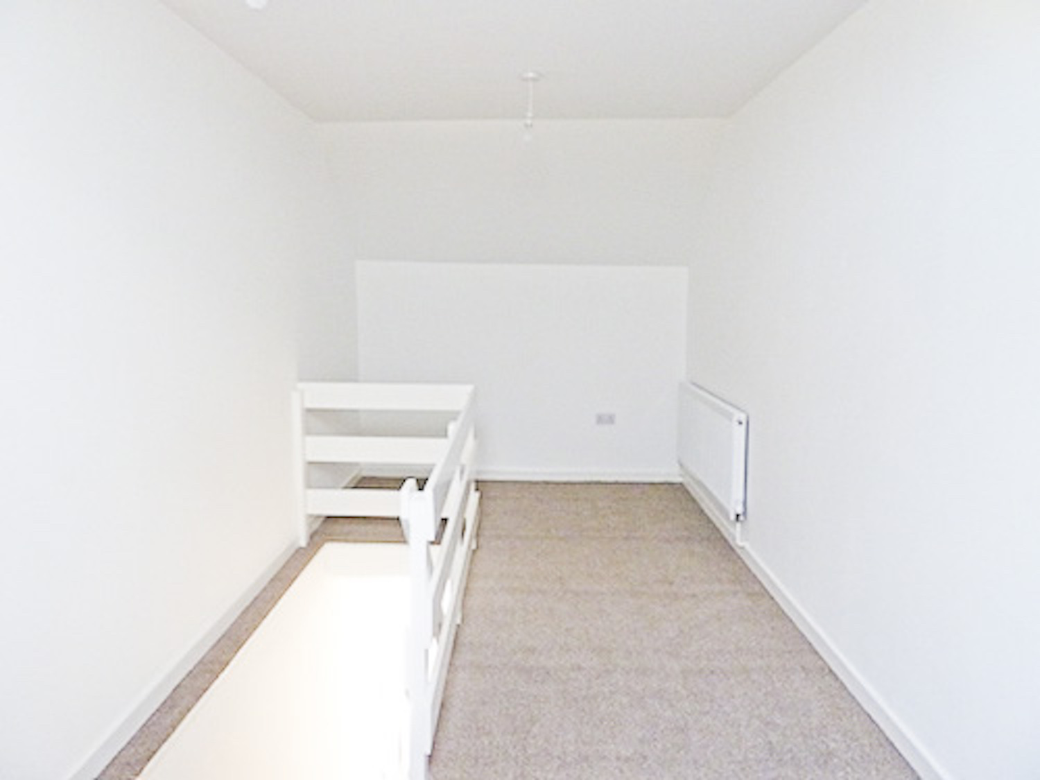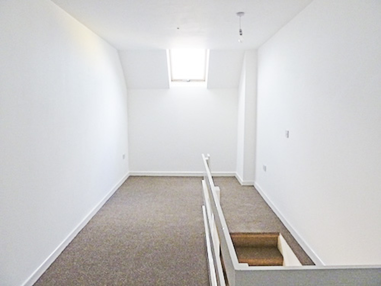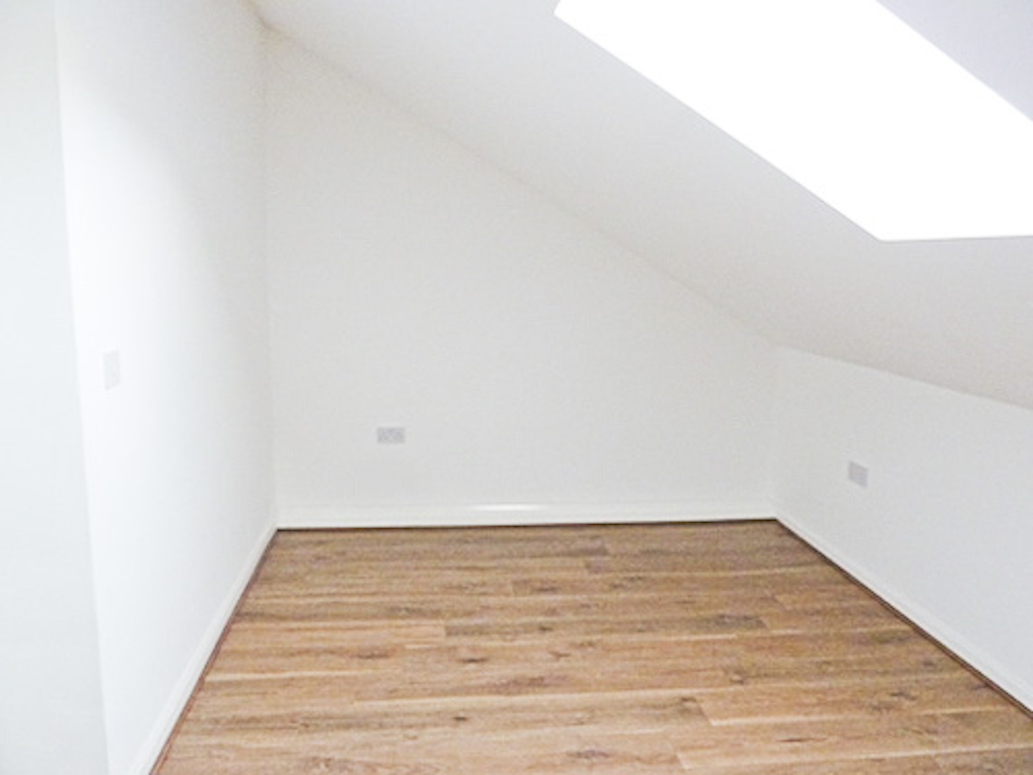 The studio has bright white painted walls, brand new laminate flooring and lots of natural light coming in from the windows in the open area and the velux skylight windows in the mezzanine floor.