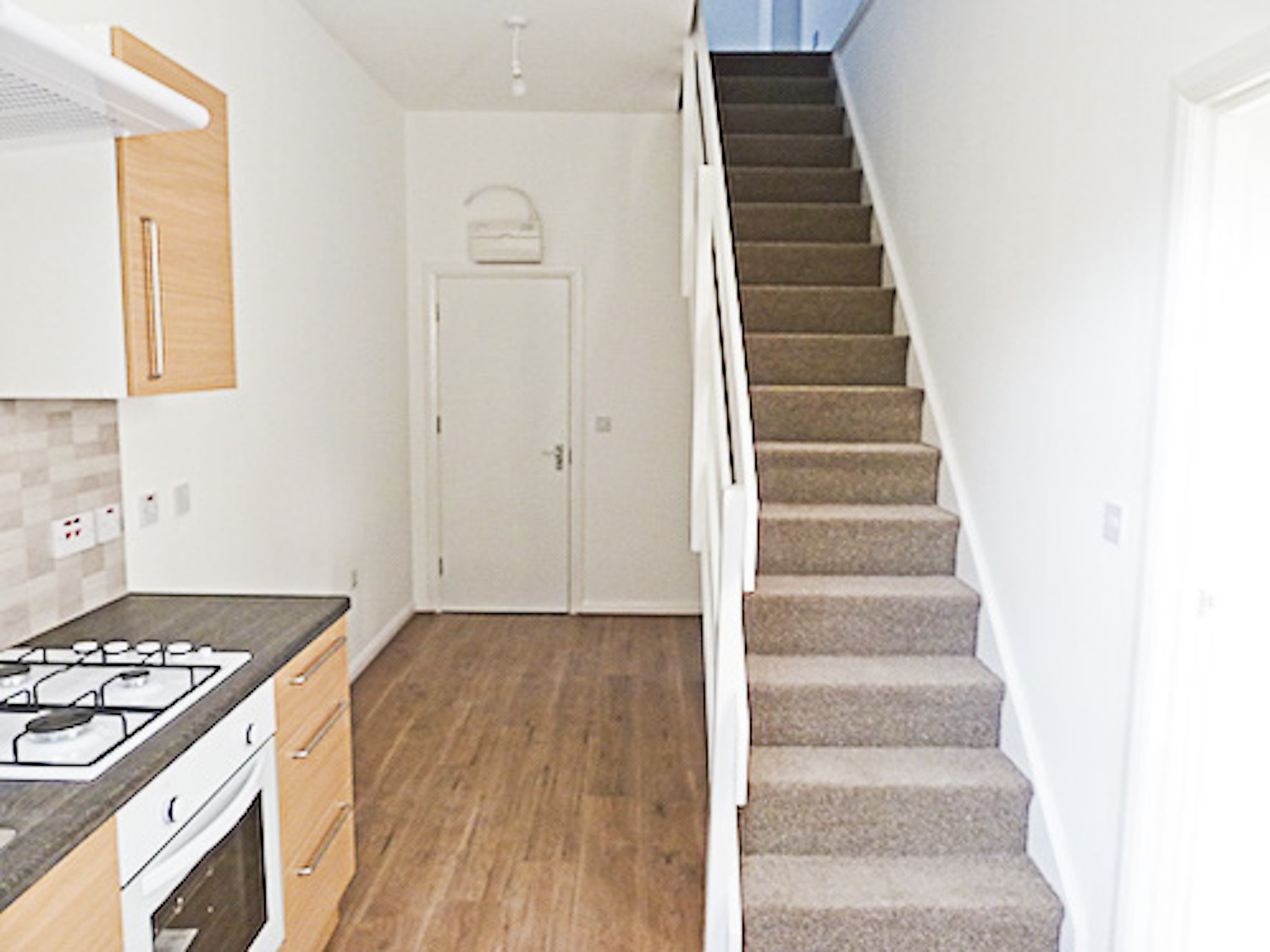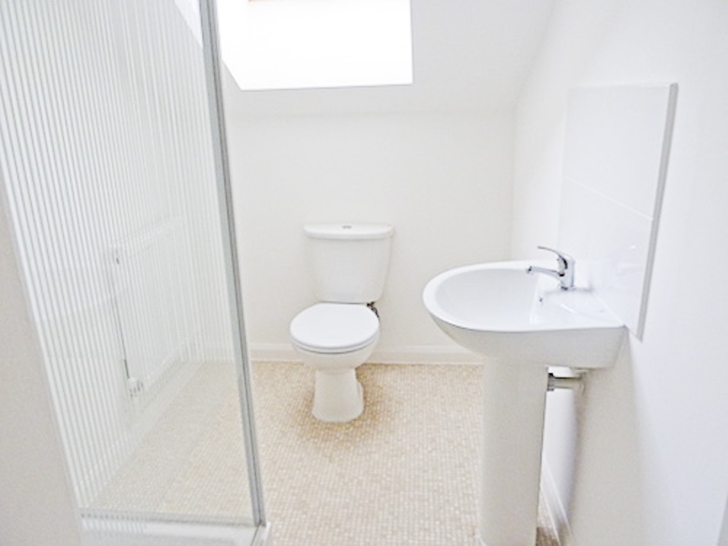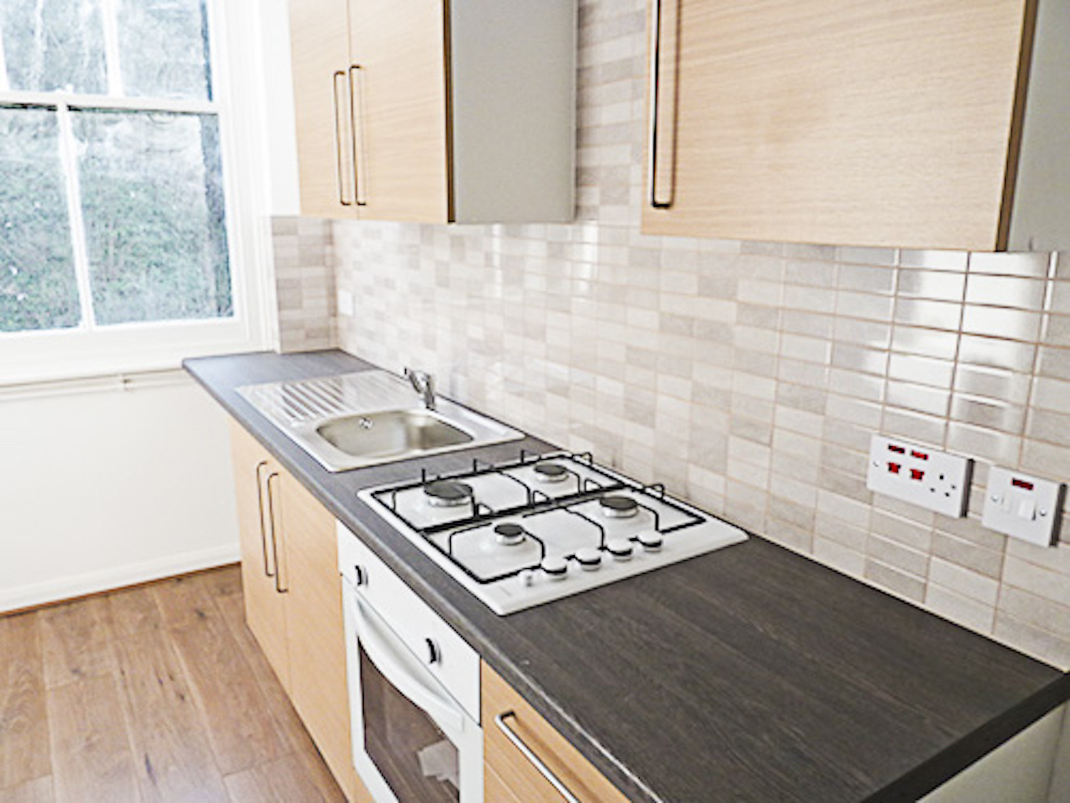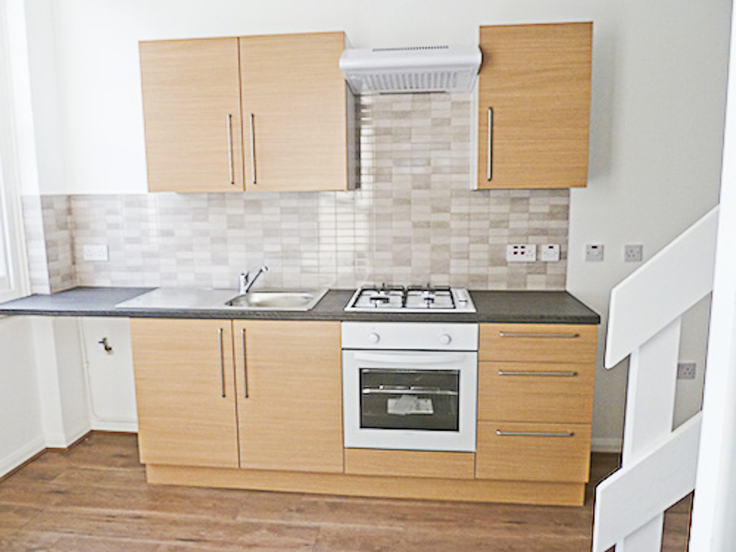 The studio has bright white painted walls, brand new laminate flooring and lots of natural light coming in from the windows in the open area and the velux skylight windows in the mezzanine floor.