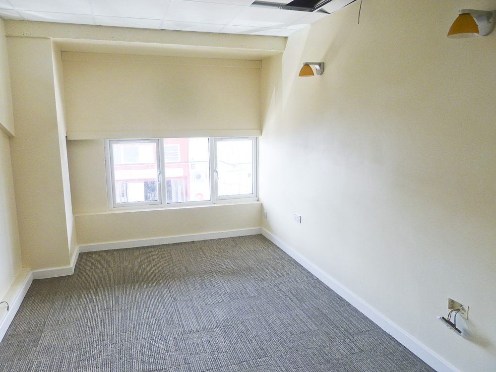 The studio has newly painted walls with grey carpet and large windows for natural light.