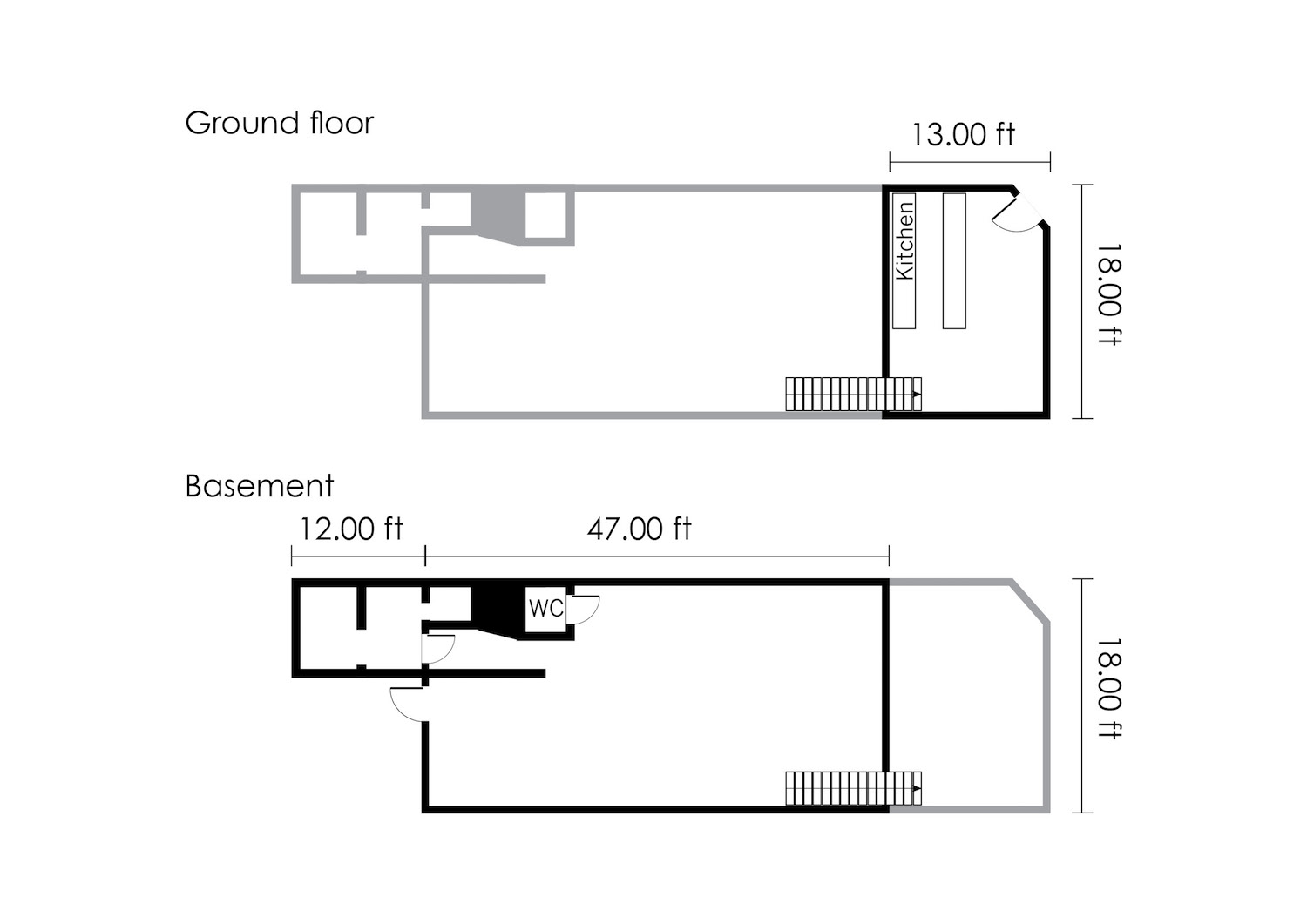 The floor on the ground floor is wooden, and is concrete in the basement. The ground floor has black painted walls, with an exposed brick wall with lots of windows to let in natural light.