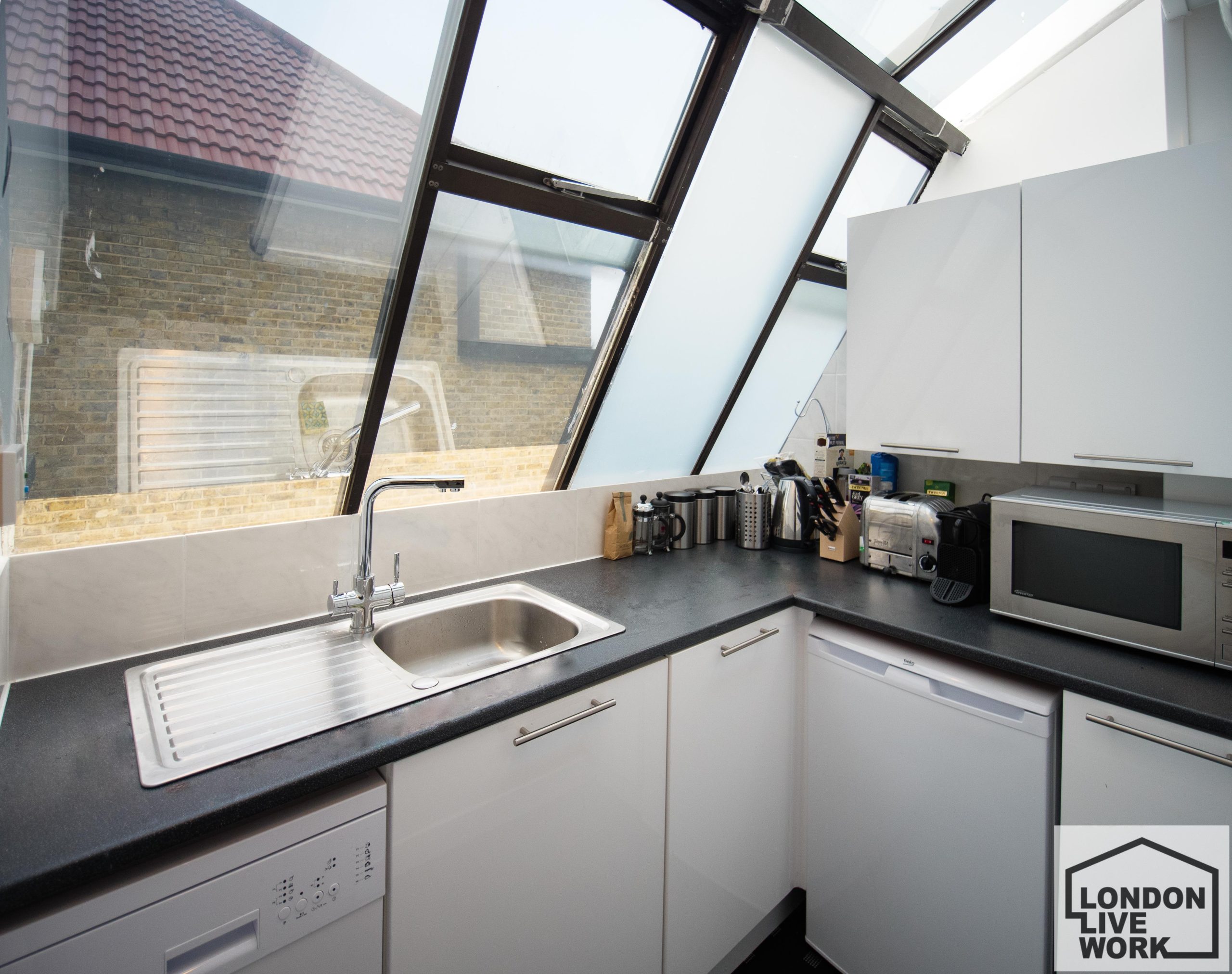 The space is fully carpeted and has bright white walls, with skylights running the length of the unit for lots of natural light, and large windows in the main area.