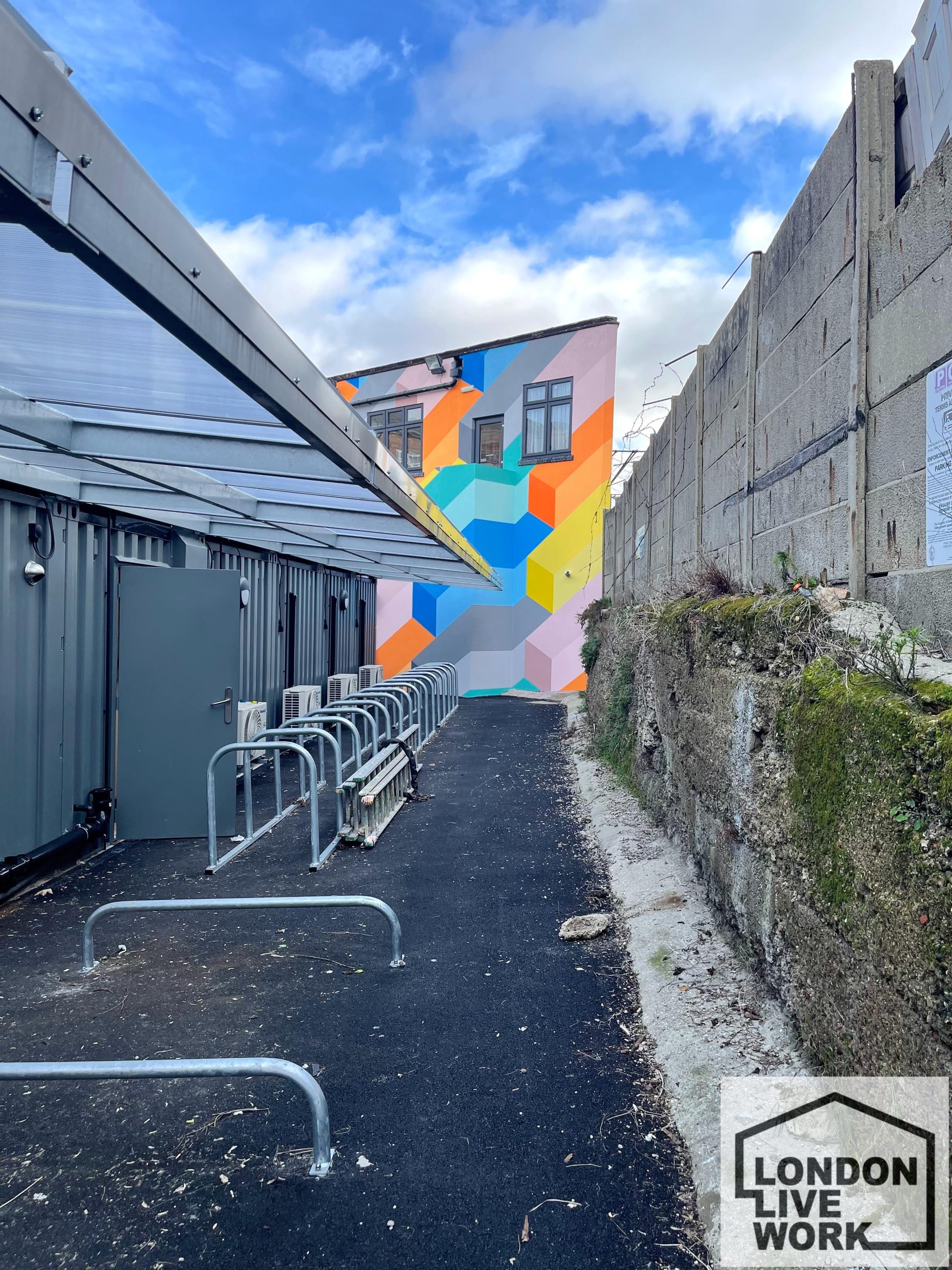 Outside the unit there is a 3000 sq ft yard, with communal seating, as a place for people to relax and get head space, WCs, and covered bicycle parking.