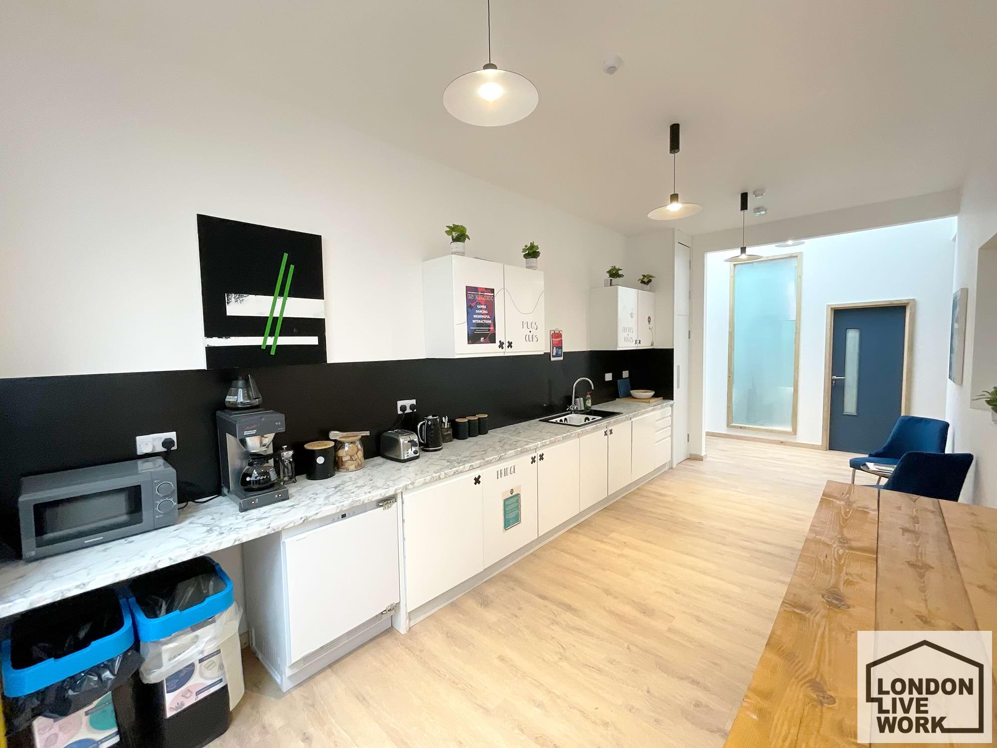 The building has a separate communal break room area for lunch so you can take a break from your work and studio. the break room comes with lots of seats and tables and a fully fitted kitchen.