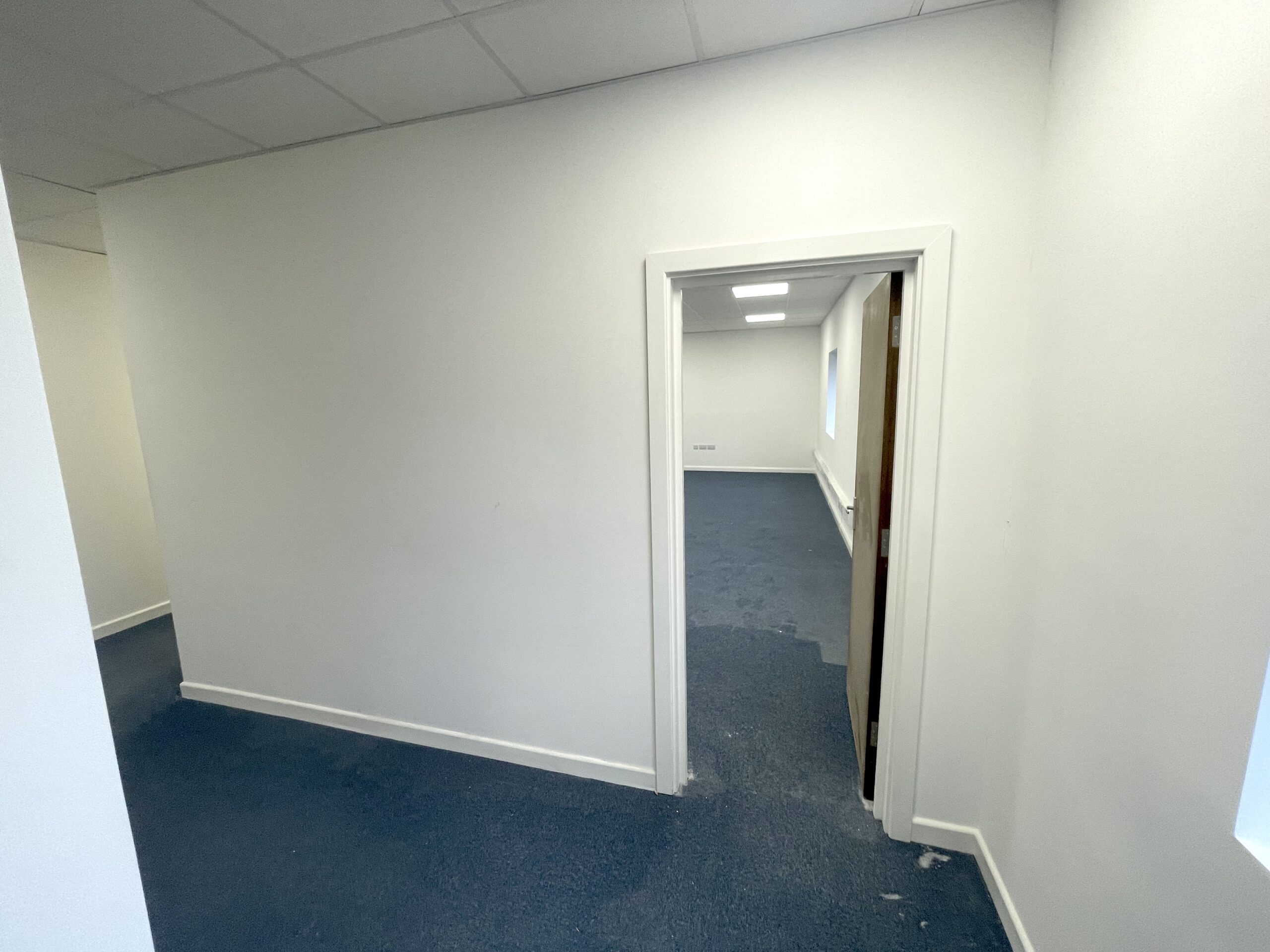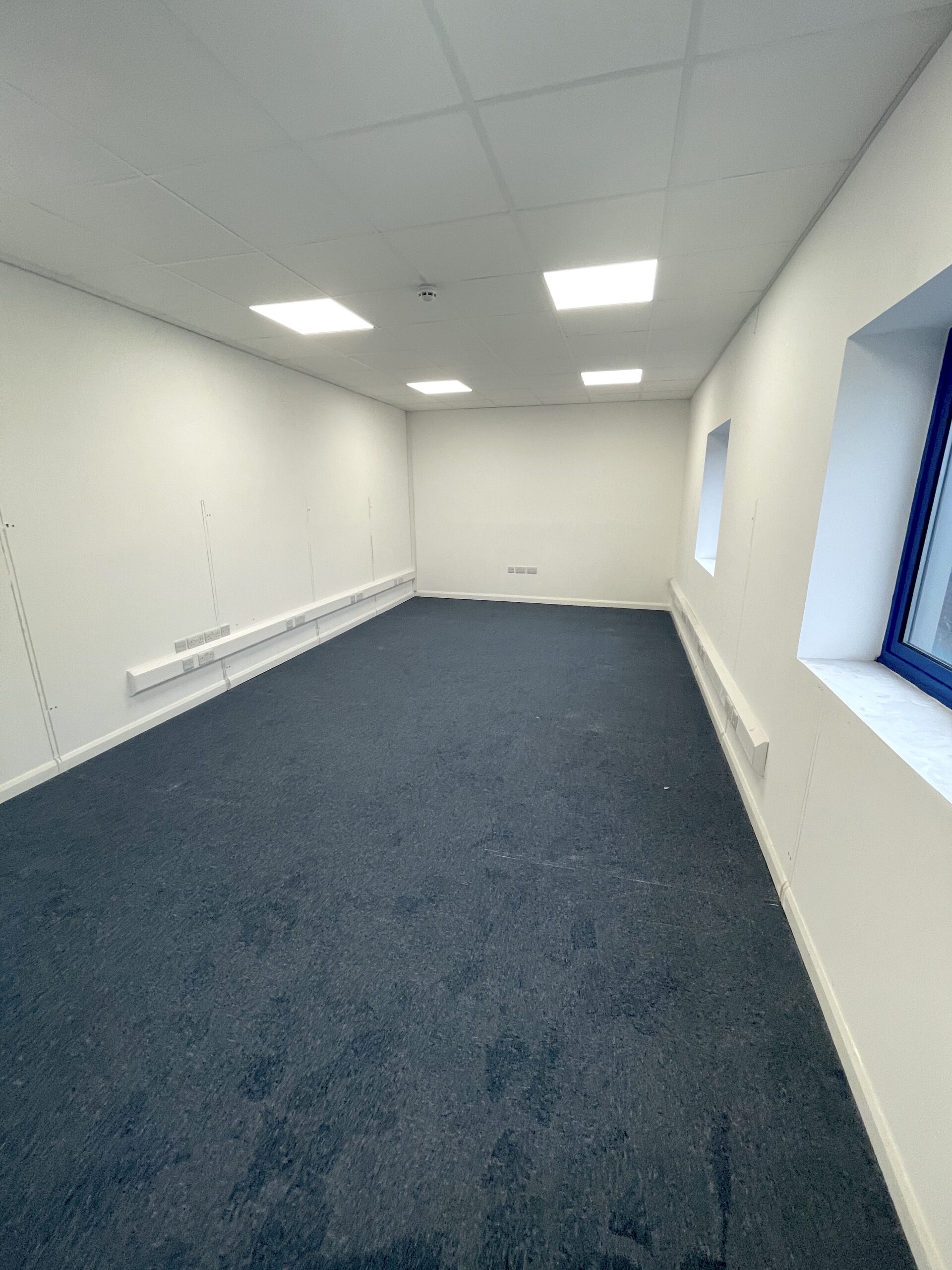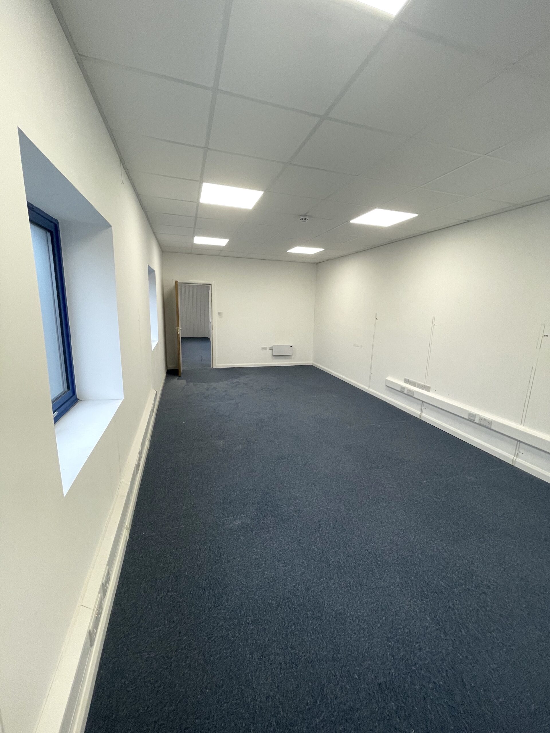 The entire unit has bright white walls, double glazed windows for lots of natural light, blue carpeted flooring and a suspended ceiling height of 8ft and a ceiling height of 12ft.