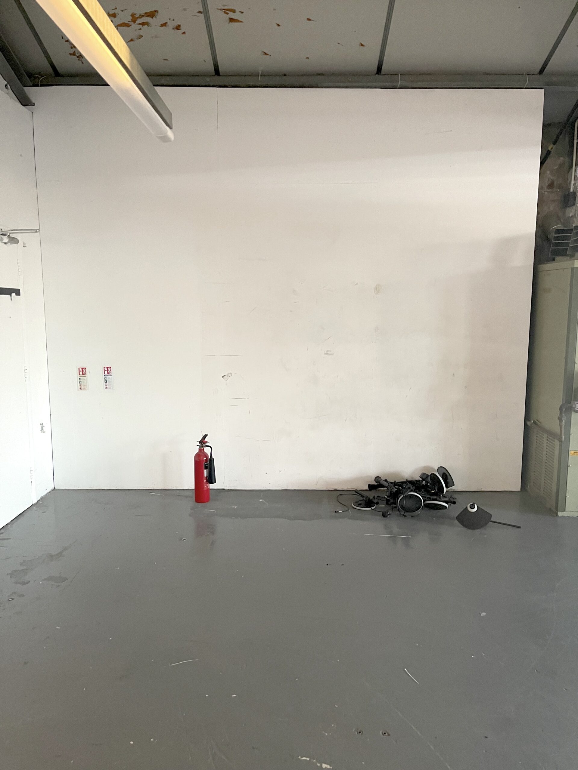 If you look at the 7th picture (of the white wall and fire extinguisher), it’s actually a temporary wall, put up to block the roller shutter behind. If the tenant wanted to, they could remove the wall and expose the roller shutter behind, which could open to let in lots of natural light and fresh air).