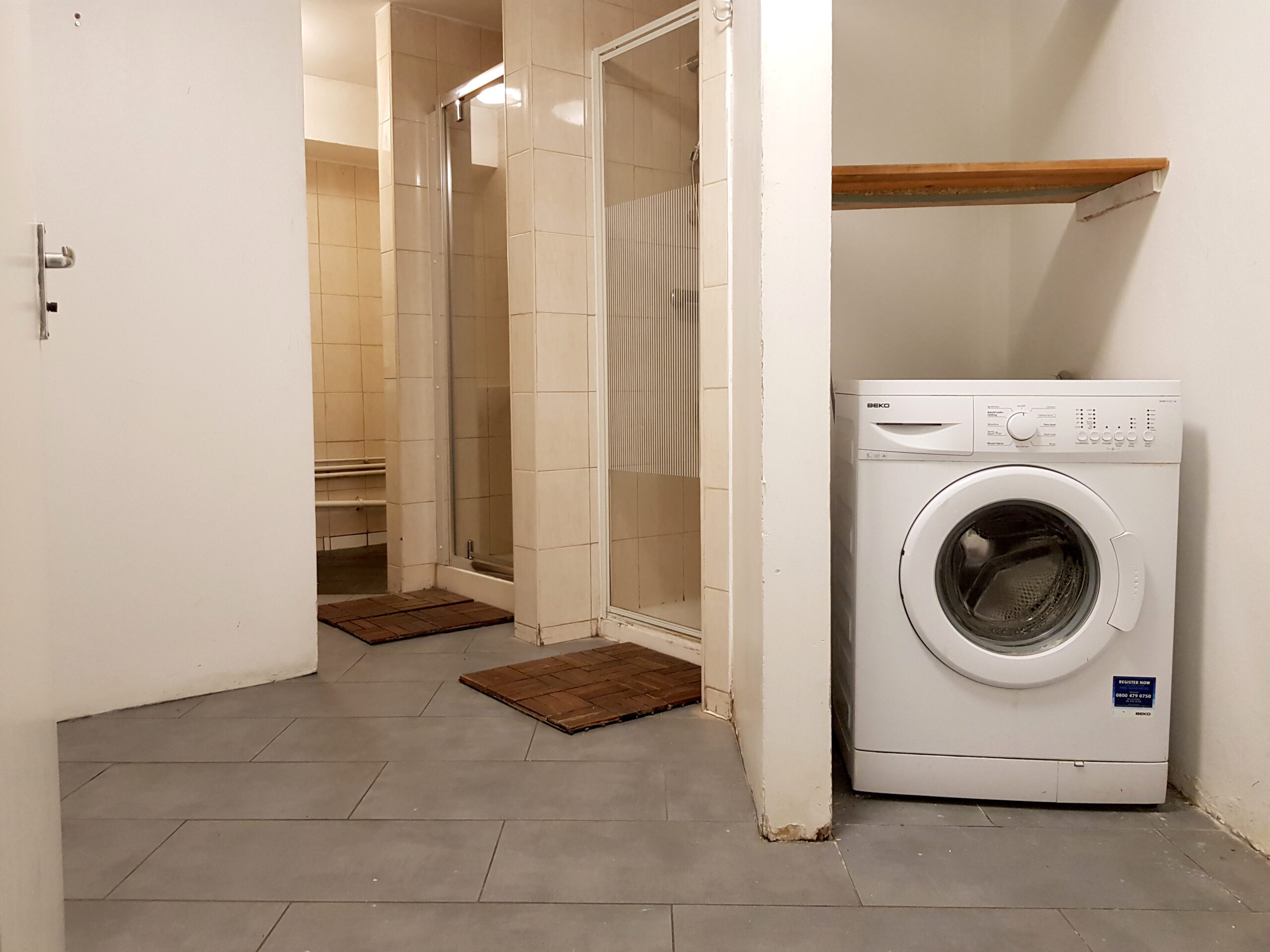 The unit has TWO separate bathrooms with 3 showers and 2 toilets. There is a washing machine in one of the bathrooms.