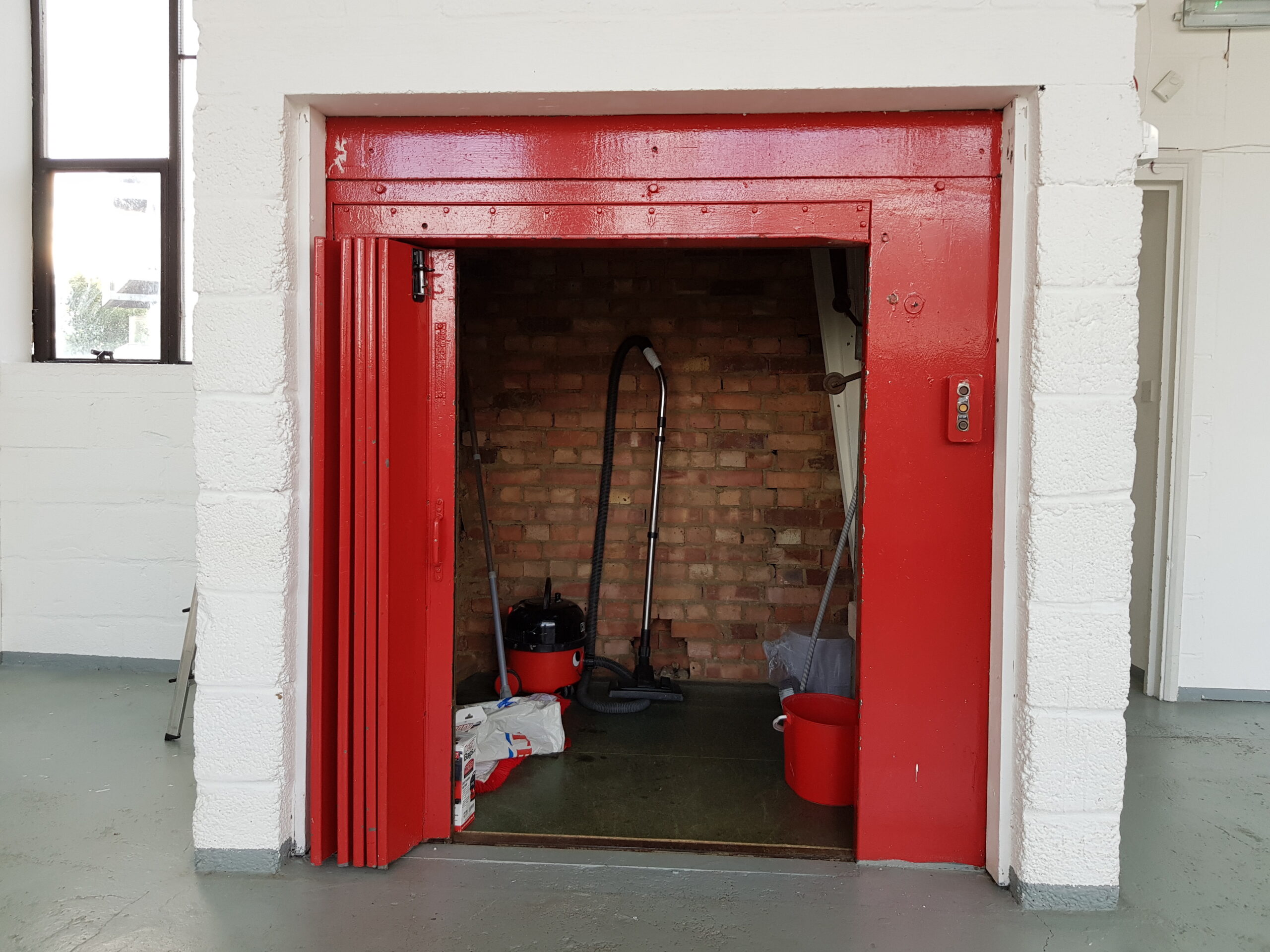 The open area has a concrete floor and white walls. There is a fully fitted open plan kitchen, with an electric hob and oven, a large double sink, a dishwasher and a fridge freezer. There is also an old lift in the main area, which is used as a storage room.