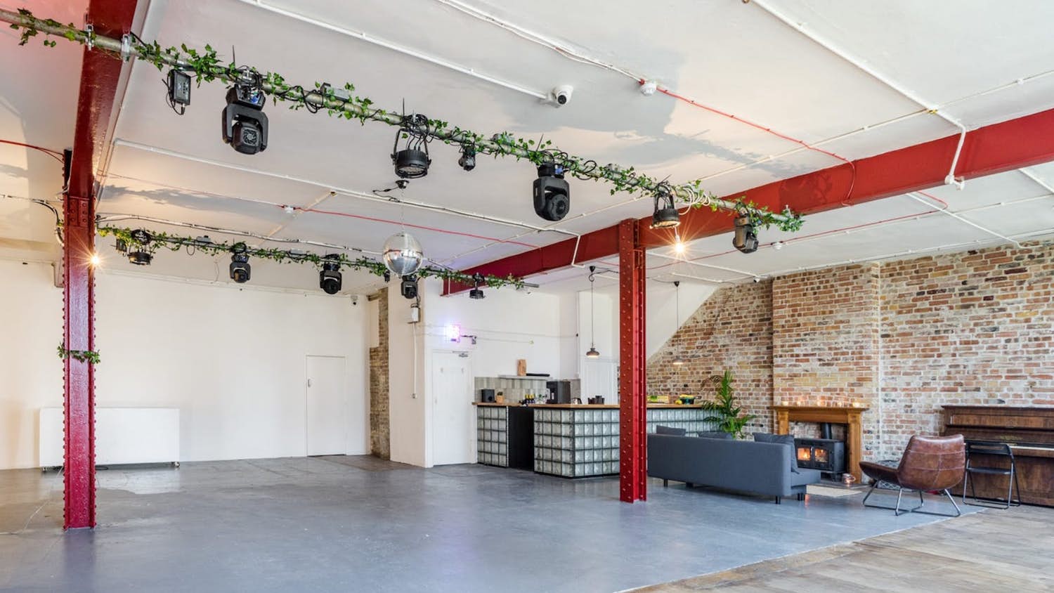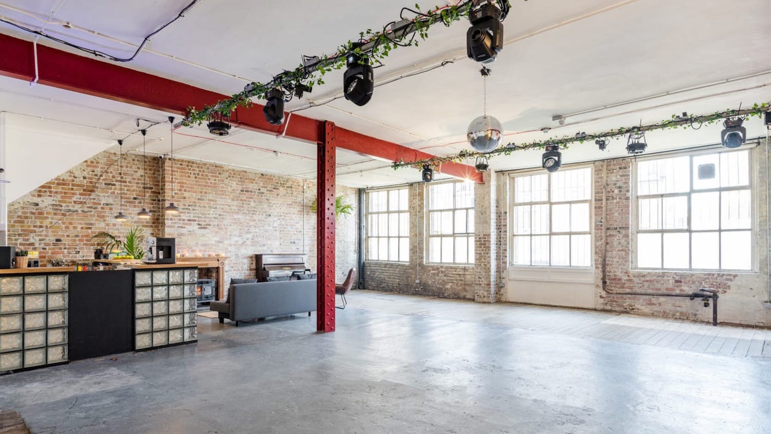 The space has a double door entrance, large open area, huge windows along the front side to let in natural light, exposed brick walls and white walls, flint grey concrete floors and original Victorian steel beams.
