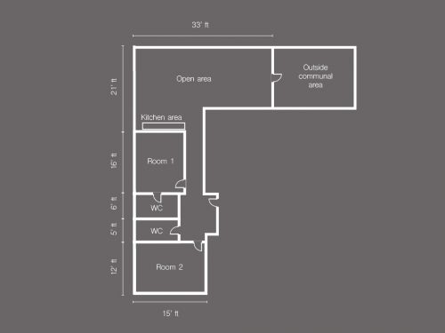 The studio is 1200 sq ft in total and has an open plan kitchen area , 5 rooms (one of which has an ensuite WC / bath / shower), and separate WC / shower.