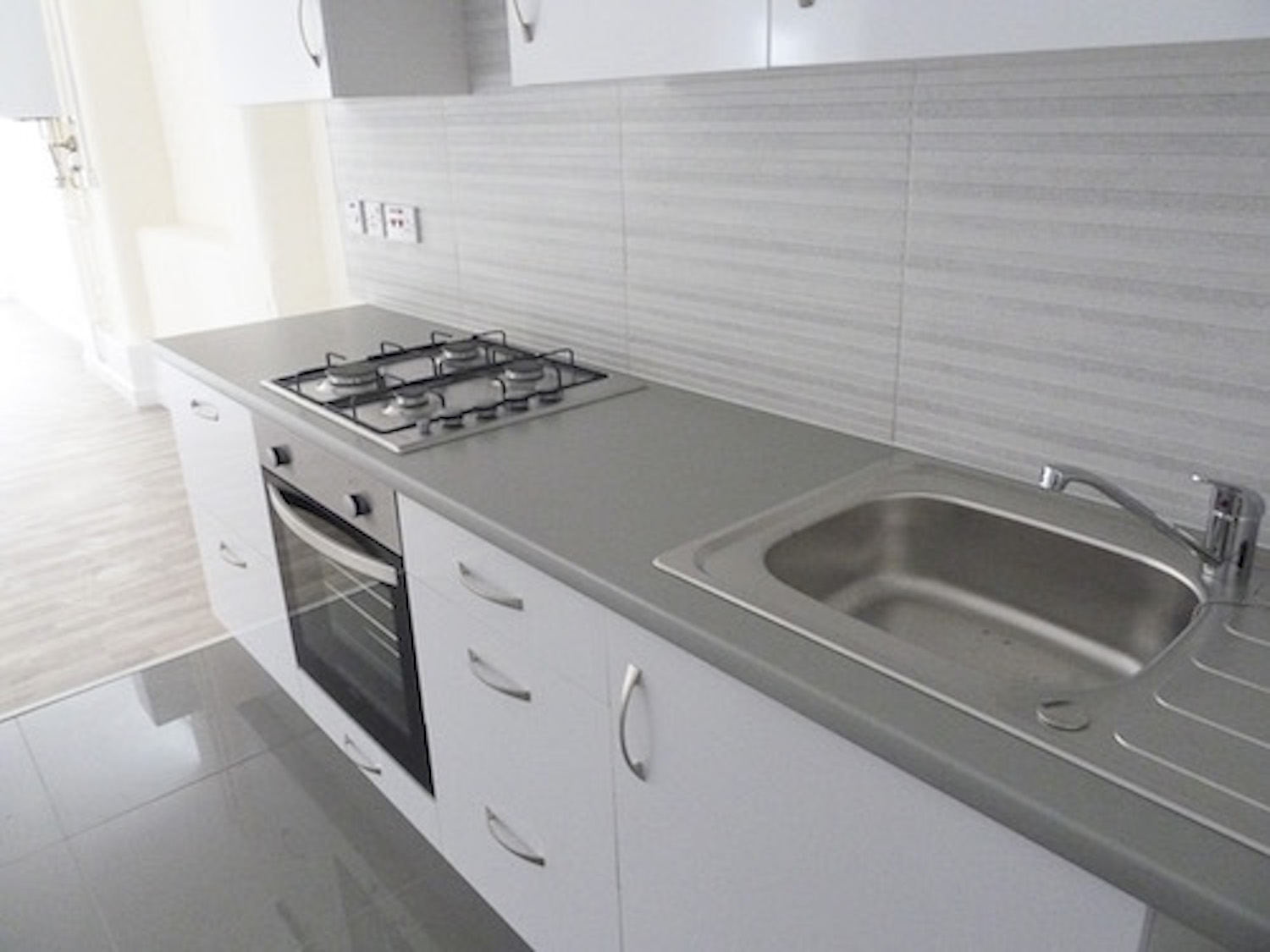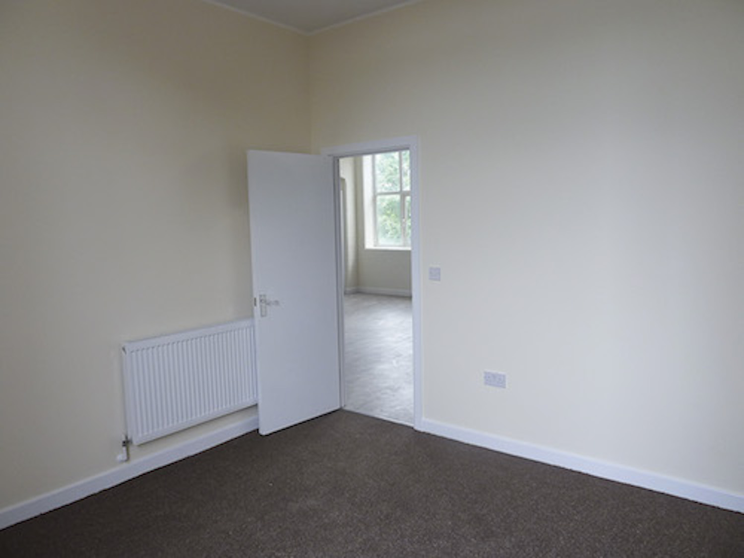 Unit has been painted white, has a wooden floor in the main area, tiled floor in the kitchen area, and carpeted bedrooms.