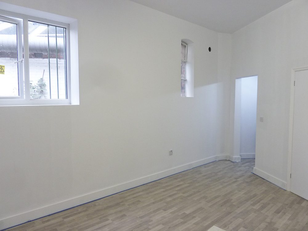 The studio has 190 sq ft ground floor space, an 8 ft high ceiling and a concrete floor (painted flint grey)