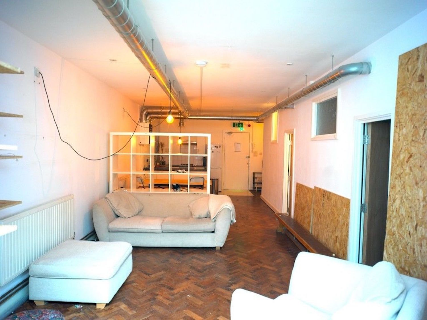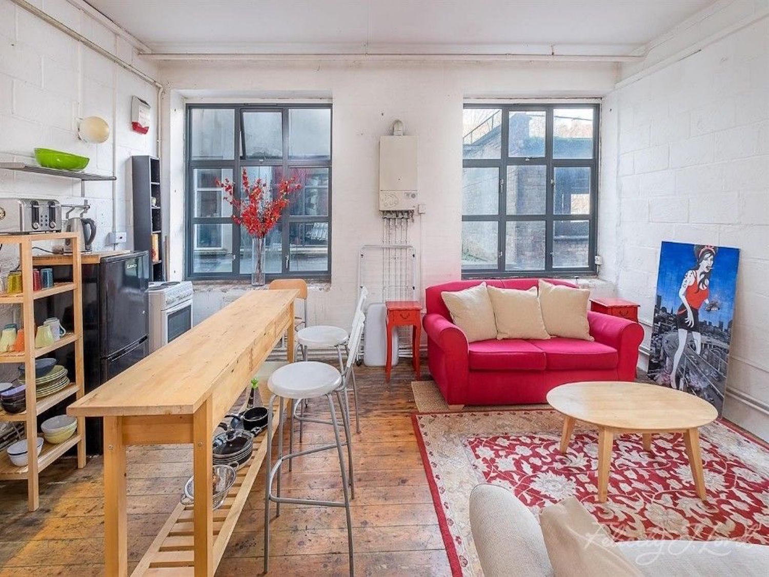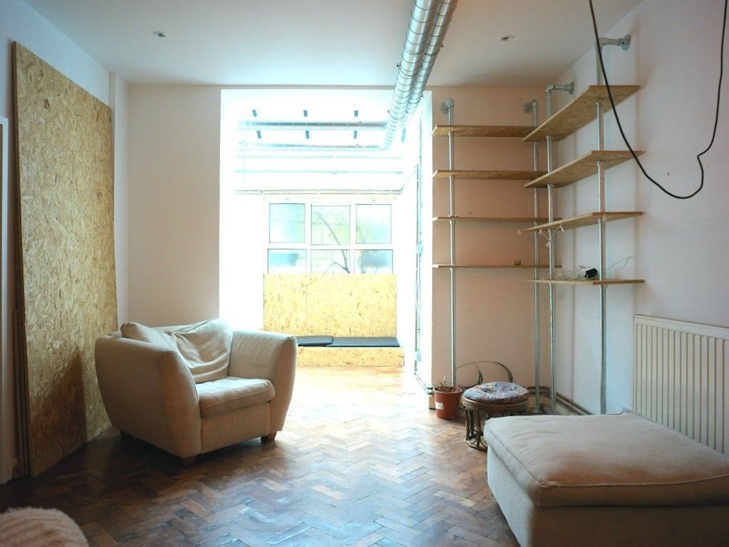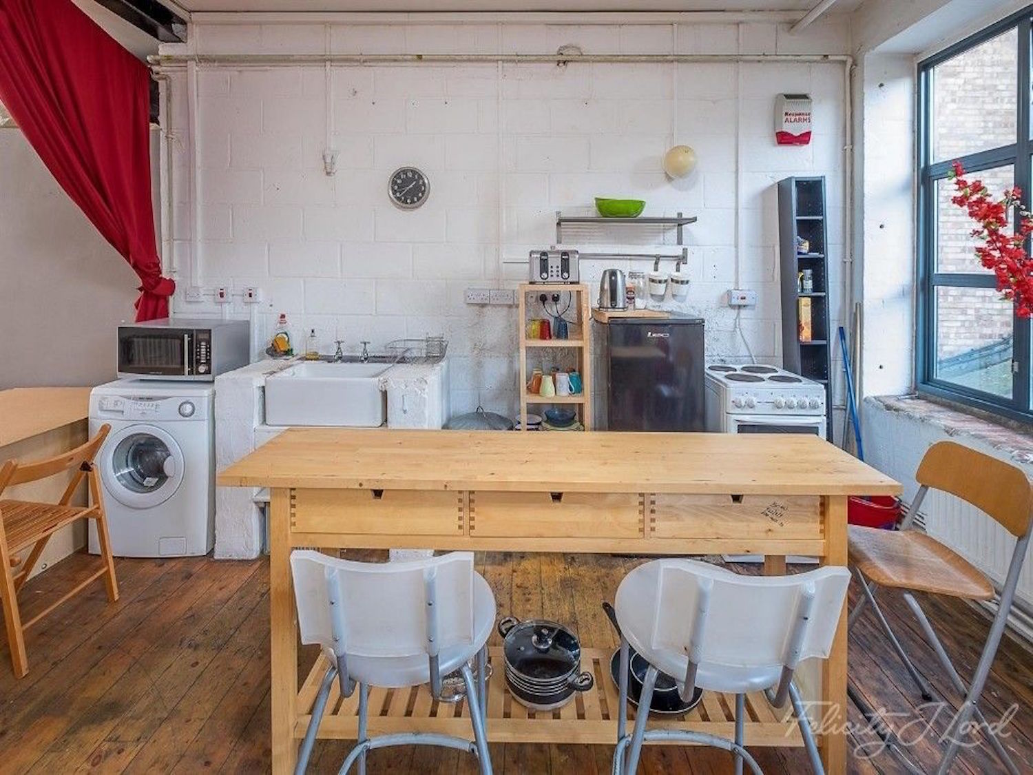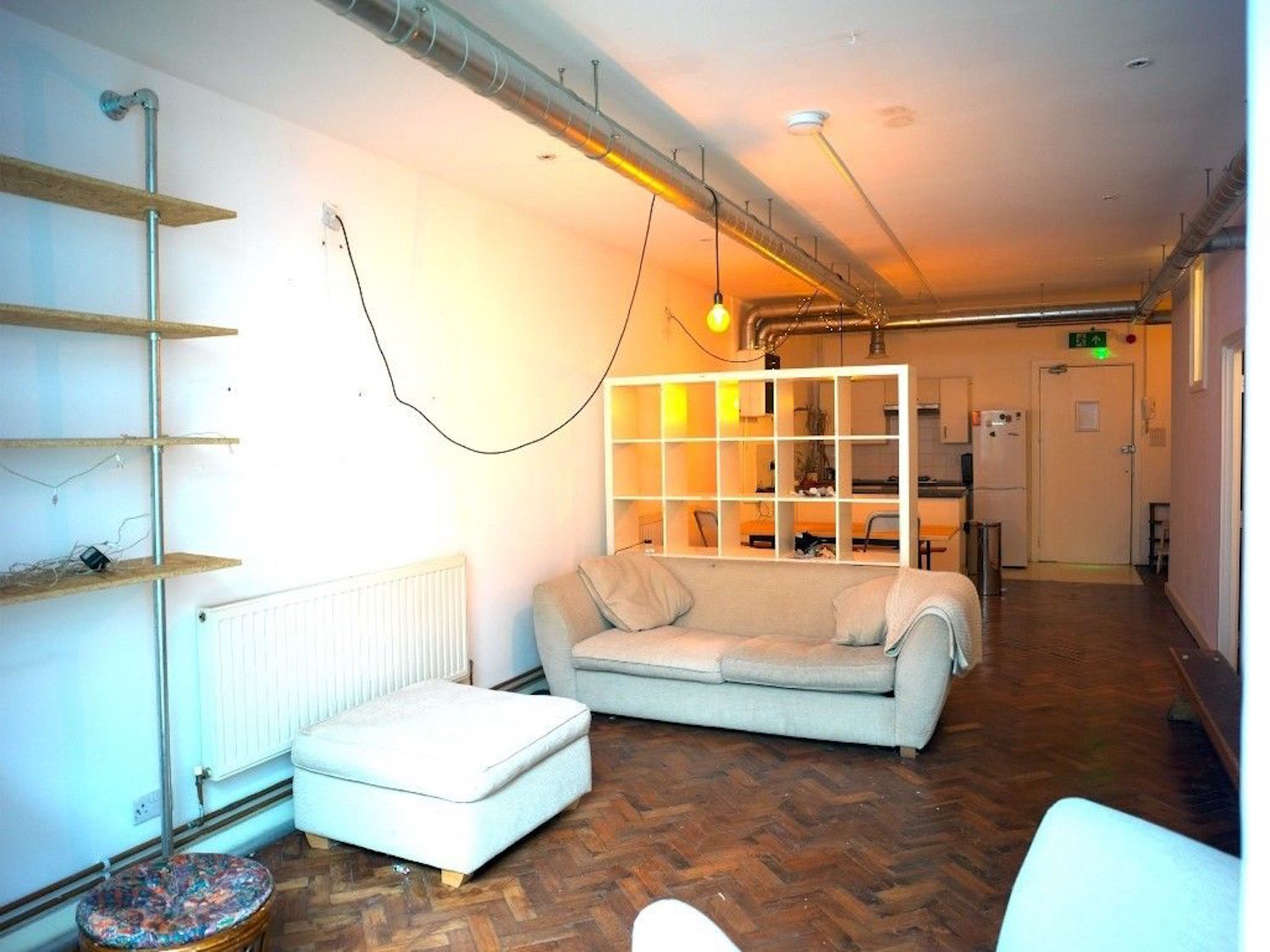 Live work unit available to rent in converted Victorian warehouse, with one large bedroom, large open area, kitchen area and bathroom. Hackney E9