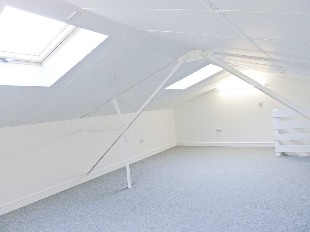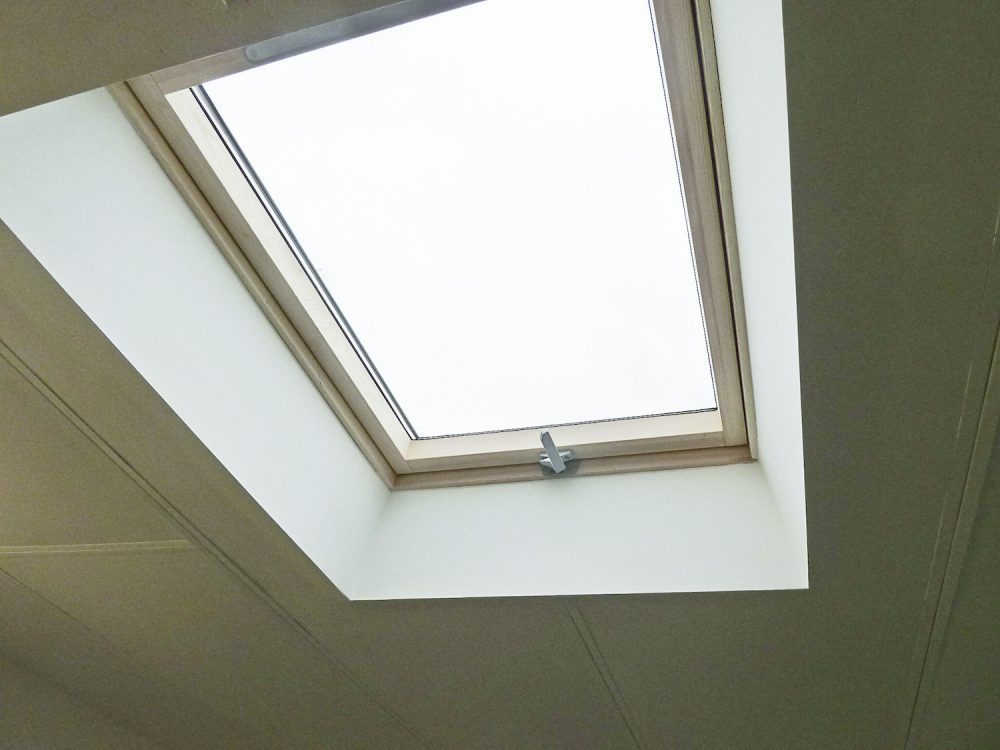 The unit has a very high pitched roof with skylights for natural light.