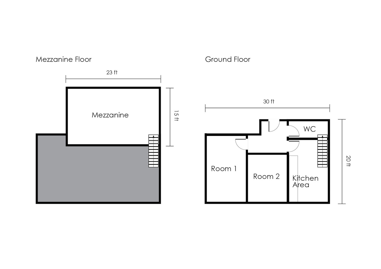 The ground floor area is 600 sq ft and the mezzanine floor area is 345 sq ft.