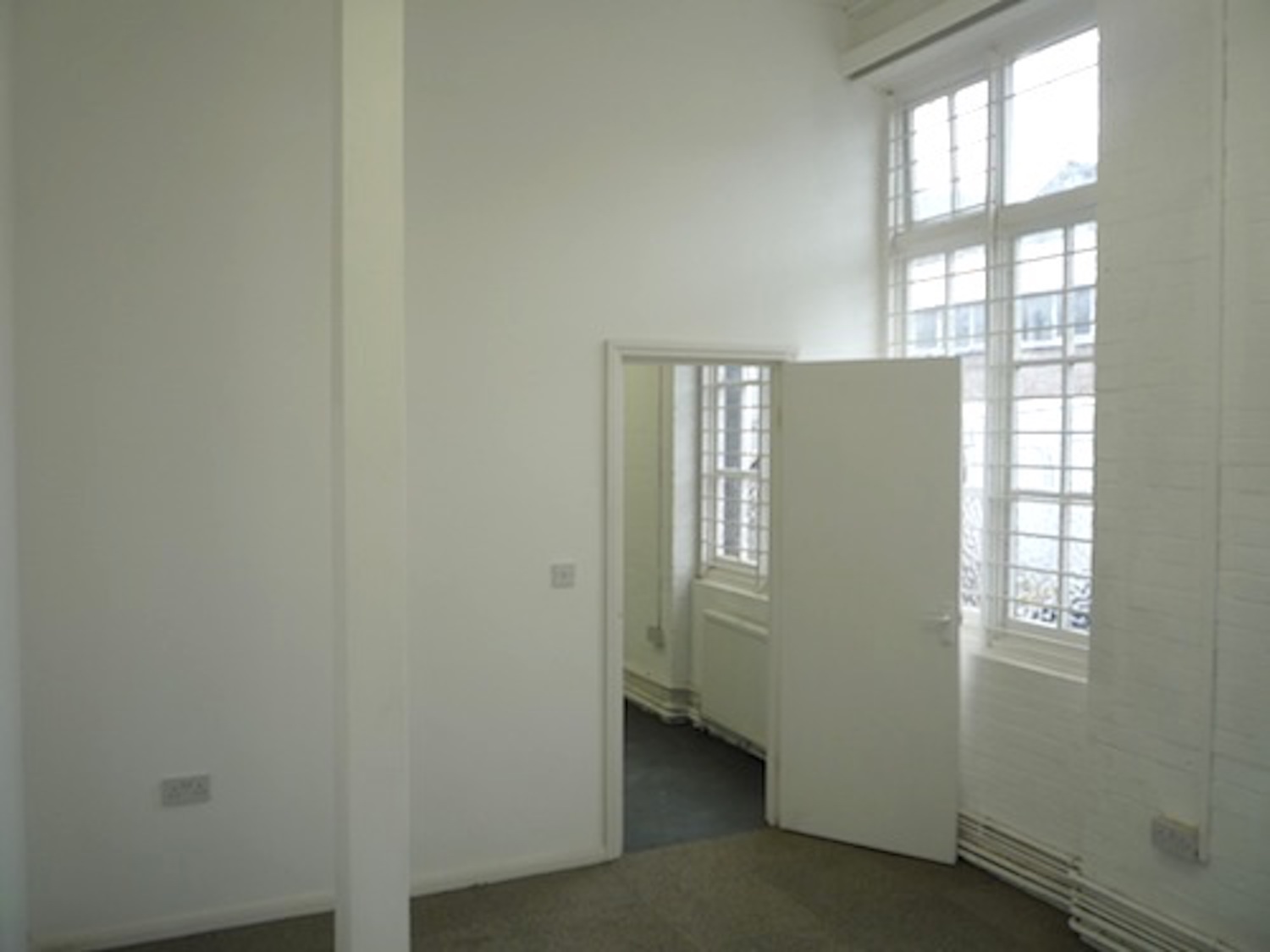 The studio has a concrete floor (painted flint grey), high ceiling and large windows.