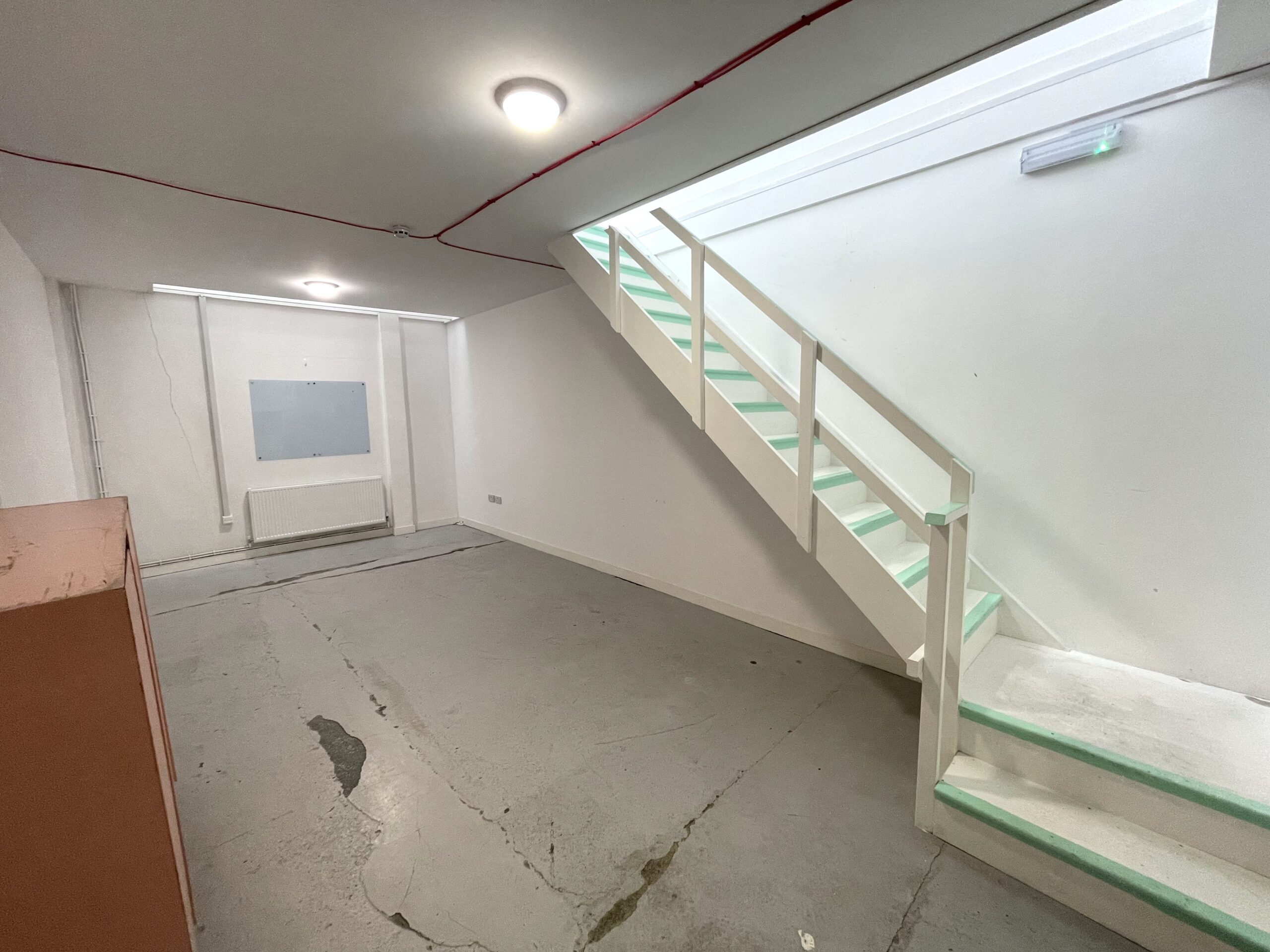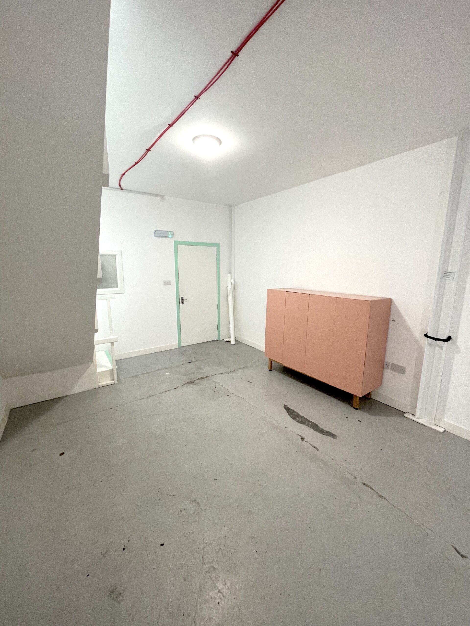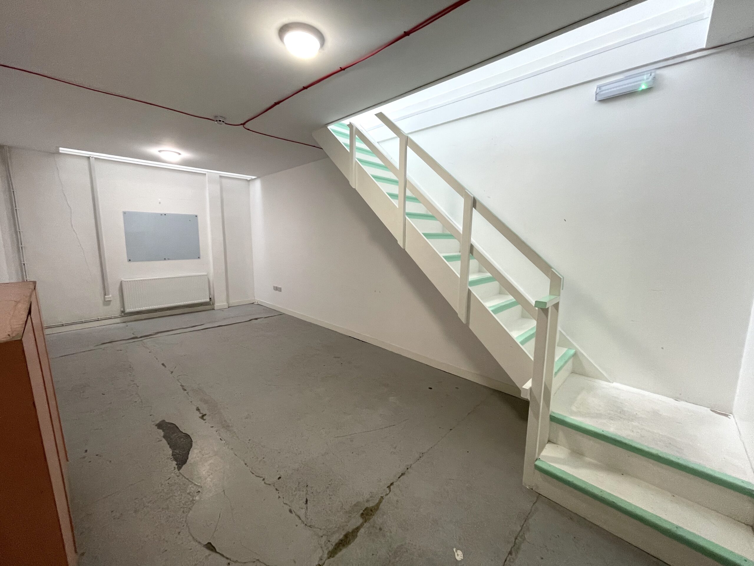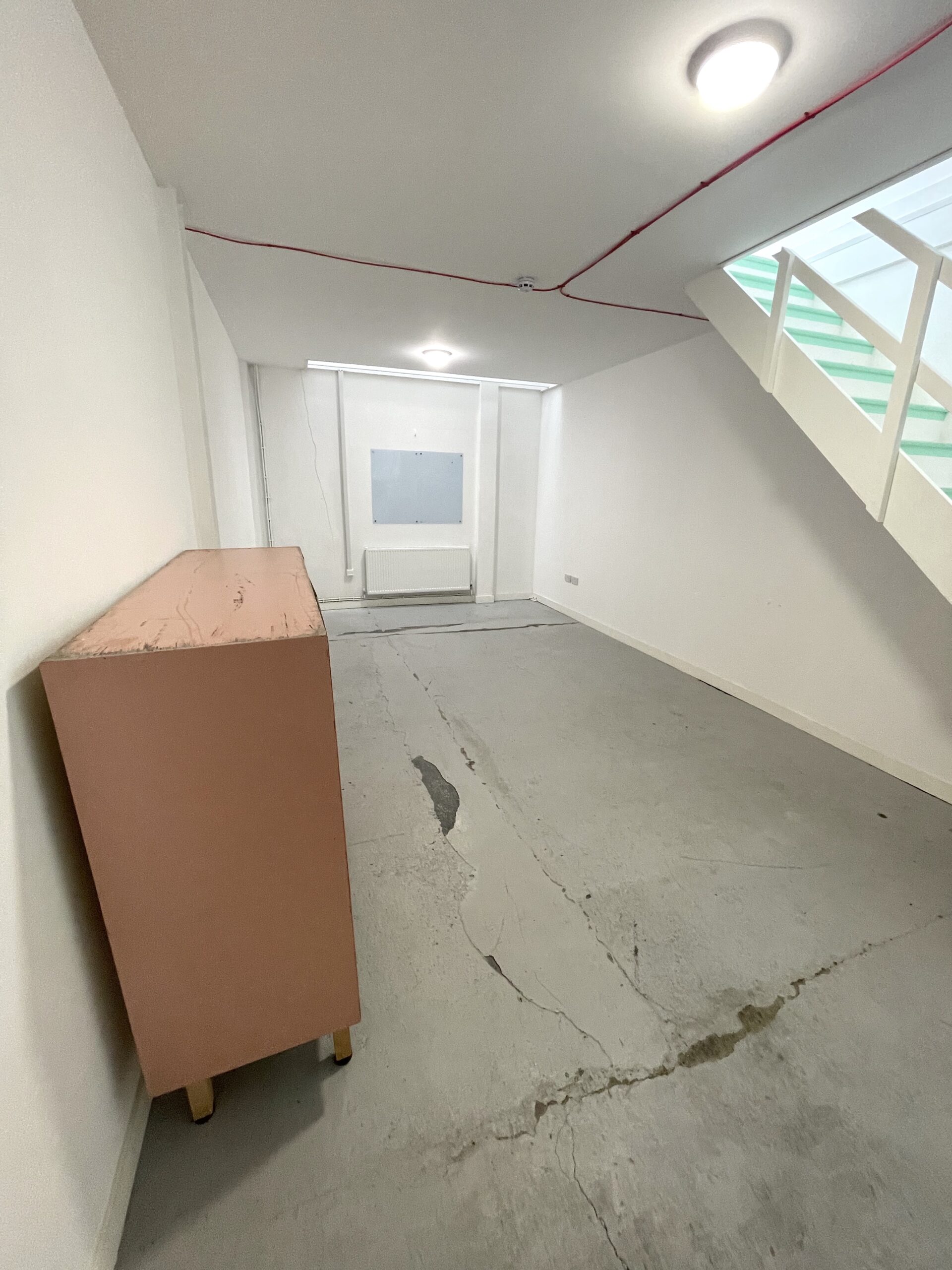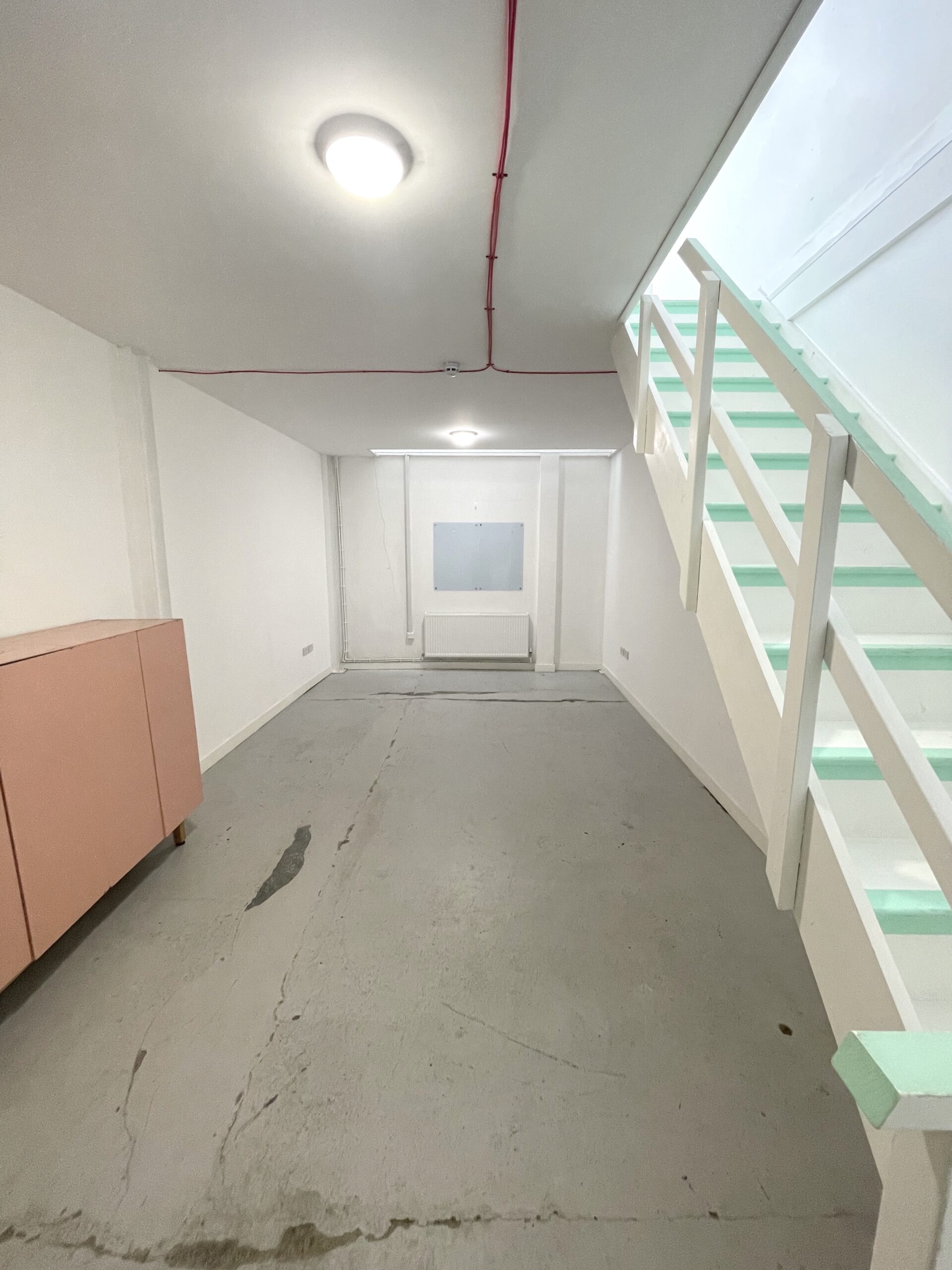 The ground floor is 300 sq ft and has a concrete floor painted flint grey, white walls with a 9ft high roof and a window for natural light.